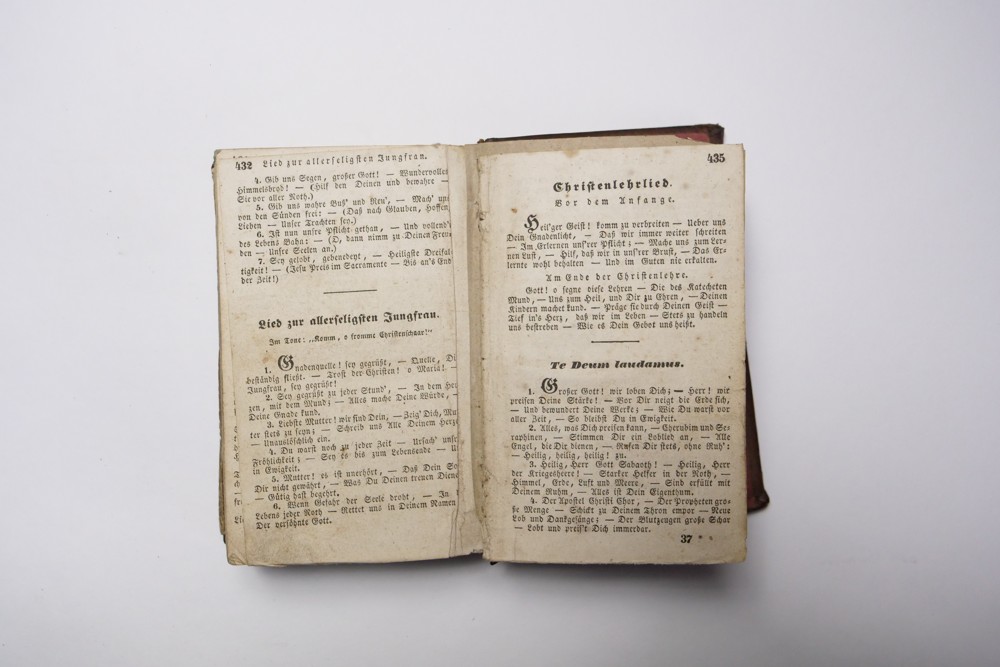 14 (ggm) Katolická misijní kniha pro křesťanský způsob života, Vídeň 1842 + modlitba k Panně Marii z roku 1860. Rozměr 13,5 x 8,5 cm, zadní strana knížky utržená. 436 stran + 4 strany obsah