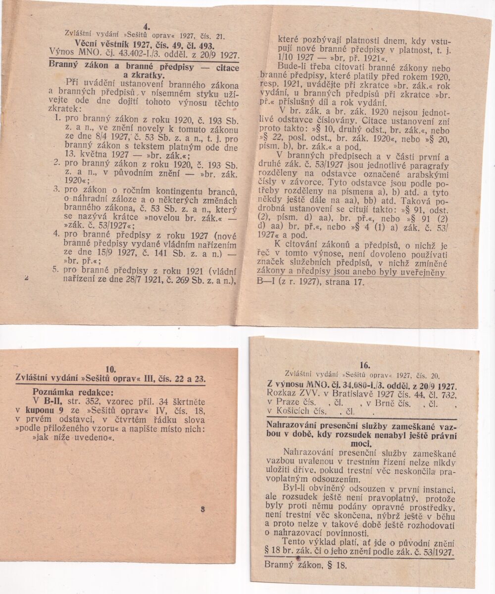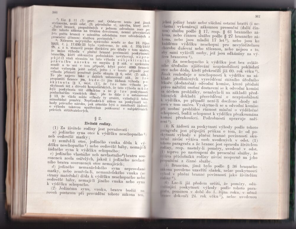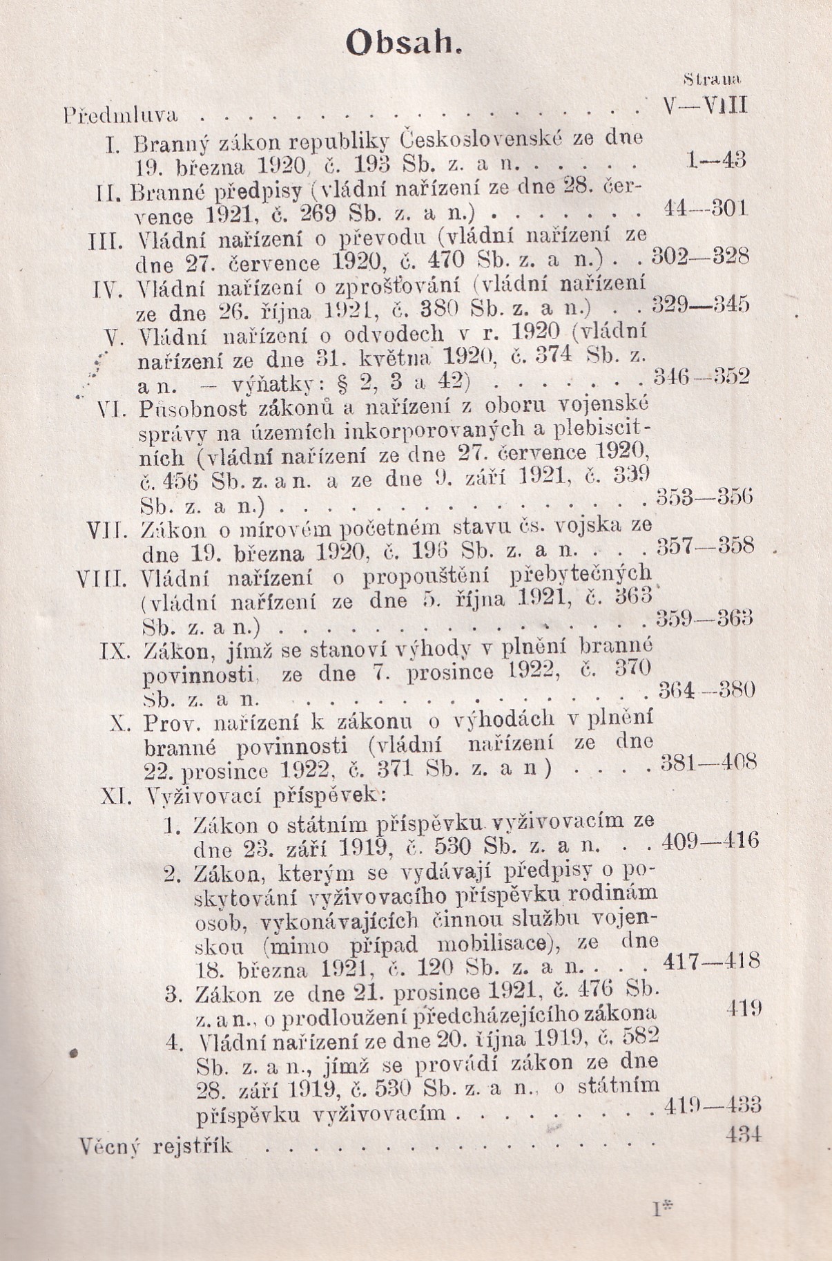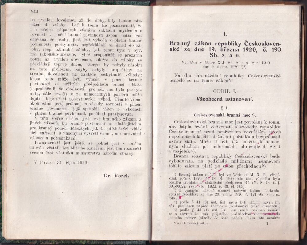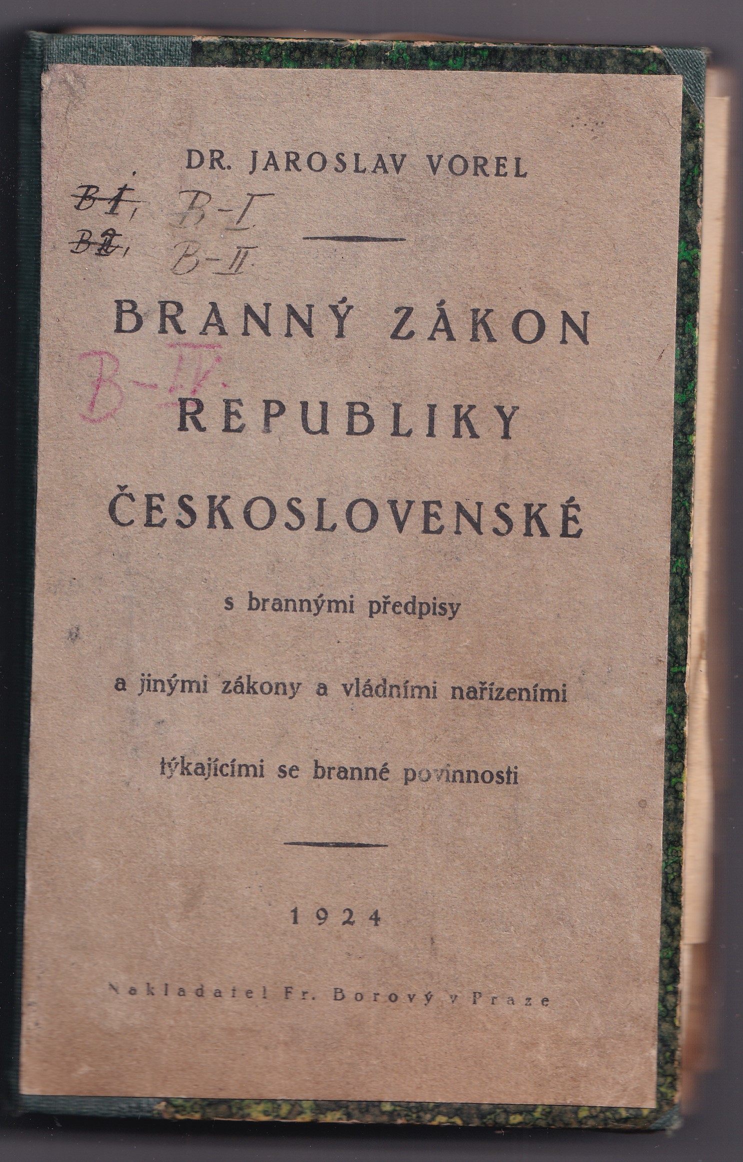 36 (K3-2) Rozměr 11 x 18 cm, v.3,5 cm. Kniha Branný zákon republiky Československé s brannými předpisy a jinými zákony a vládními nařízeními týkajícími se branné povinnosti. Poznámkami optařil Dr. Jaroslav Vorel, odborný rada ministerstva národní obrany. Z obsahu: Předmluva. Branný zákon republiky Československé ze dne 19.března 1920. Vládní nařízení o převodu ze dne 27.července 1920. Vládní nařízení o odvodech v r.1920. Zákon o mírovém početném stavu čs.vojska ze dne 19.března 1920. Zákon o státním příspěvku vyživovacím ze dne 23.září 1919…ad. Věcný rejstřík. Nakladatel Fr. Borový v Praze, r.1924. V knize jsou dolepeny změny – Zvláštní vydání „Sešitů oprav“. Kniha má 474 stran.