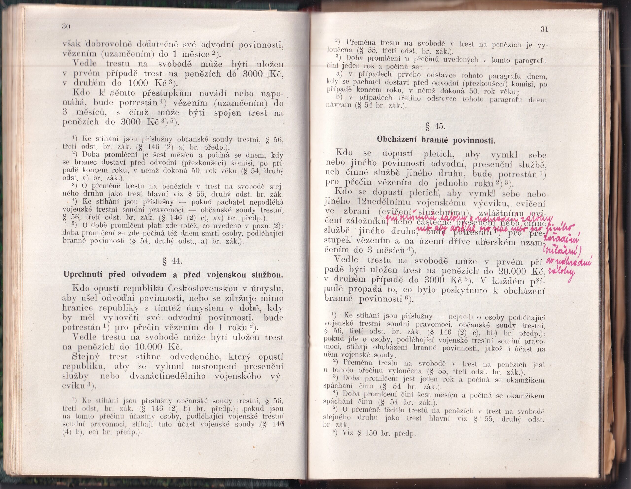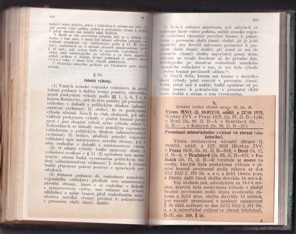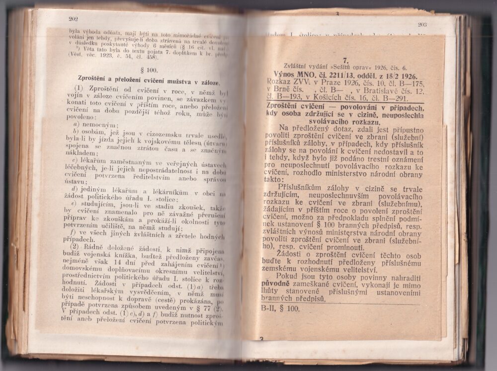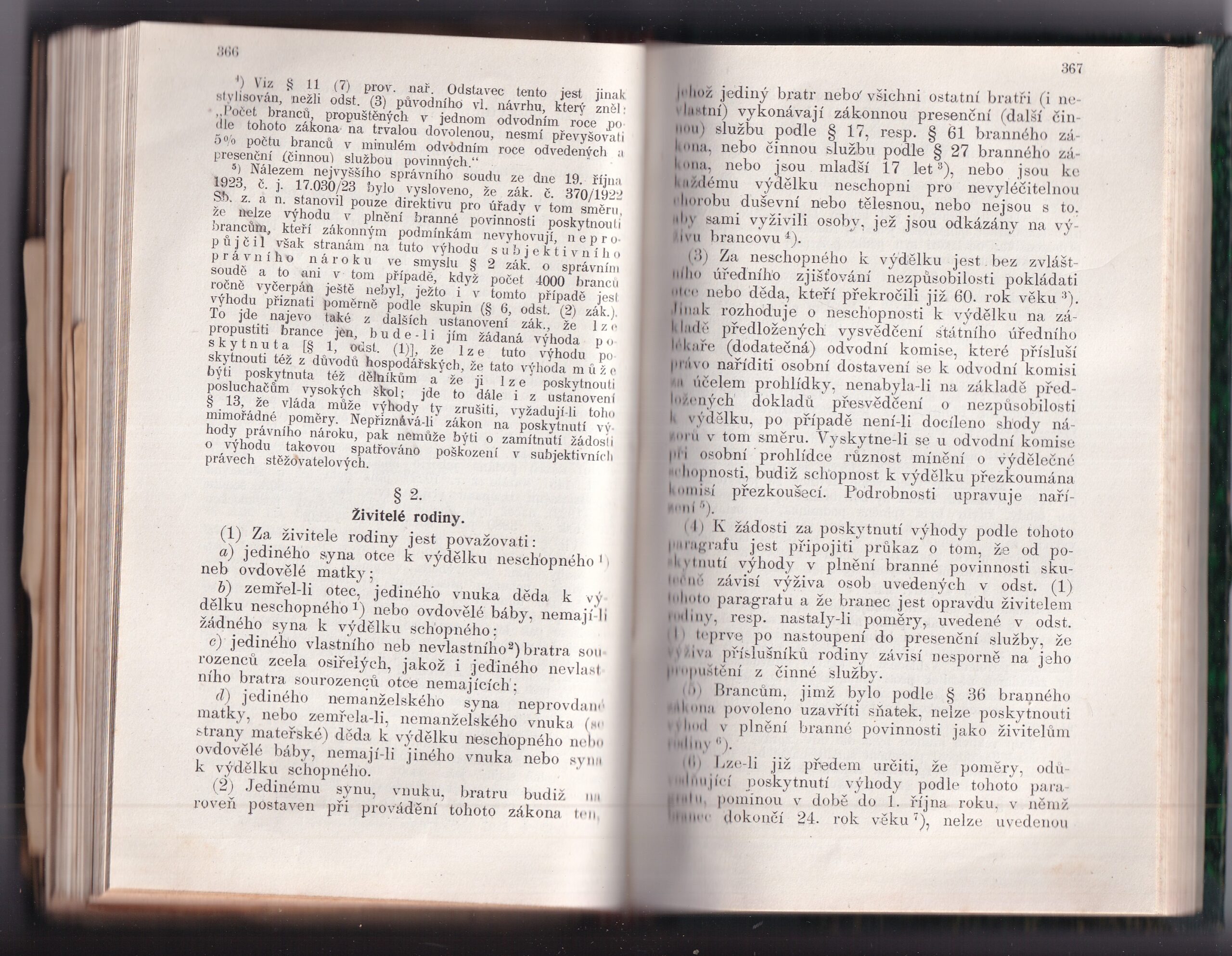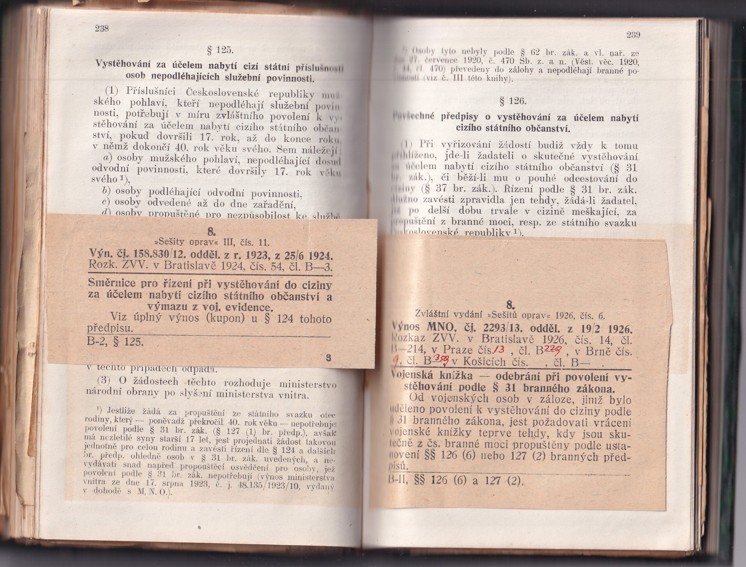 36 (K3-2) Rozměr 11 x 18 cm, v.3,5 cm. Kniha Branný zákon republiky Československé s brannými předpisy a jinými zákony a vládními nařízeními týkajícími se branné povinnosti. Poznámkami optařil Dr. Jaroslav Vorel, odborný rada ministerstva národní obrany. Z obsahu: Předmluva. Branný zákon republiky Československé ze dne 19.března 1920. Vládní nařízení o převodu ze dne 27.července 1920. Vládní nařízení o odvodech v r.1920. Zákon o mírovém početném stavu čs.vojska ze dne 19.března 1920. Zákon o státním příspěvku vyživovacím ze dne 23.září 1919…ad. Věcný rejstřík. Nakladatel Fr. Borový v Praze, r.1924. V knize jsou dolepeny změny – Zvláštní vydání „Sešitů oprav“. Kniha má 474 stran.