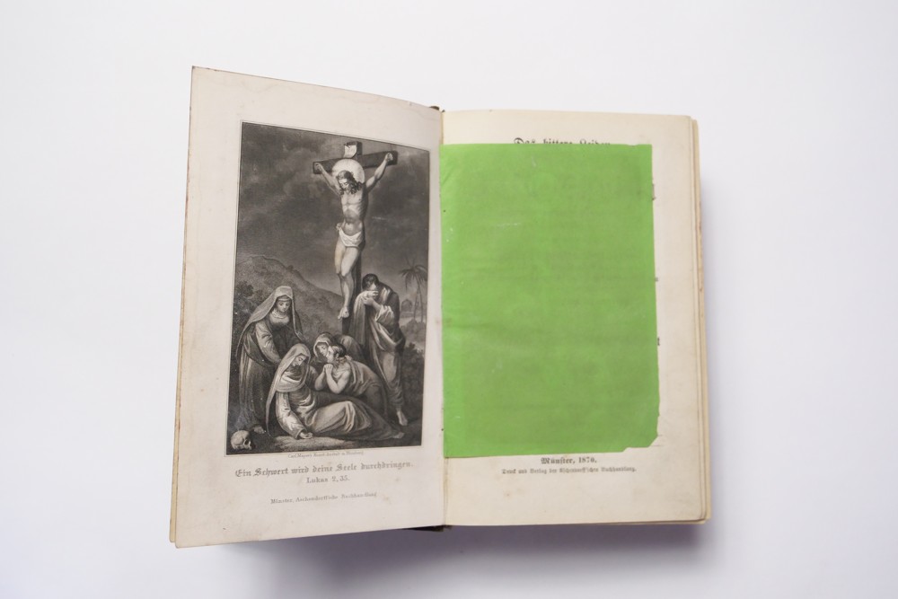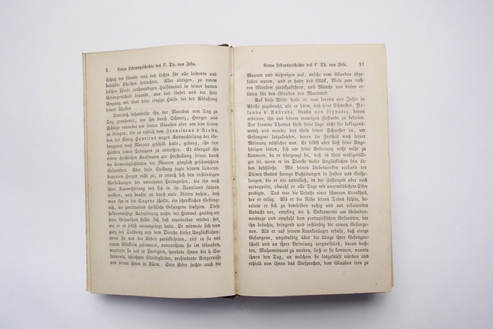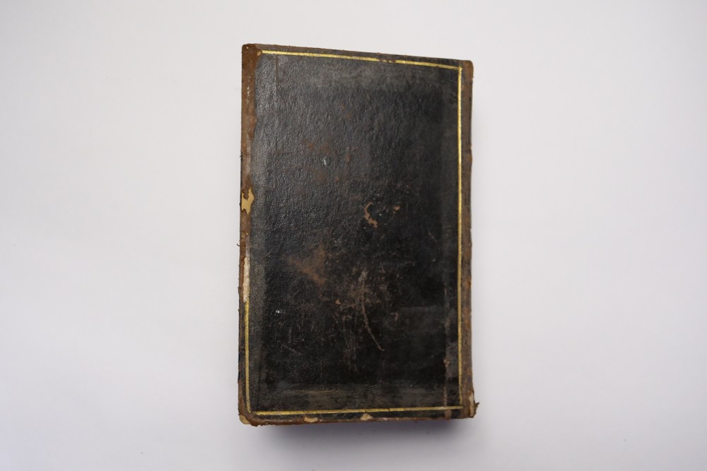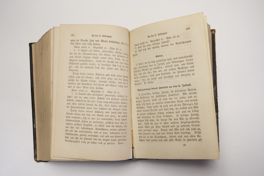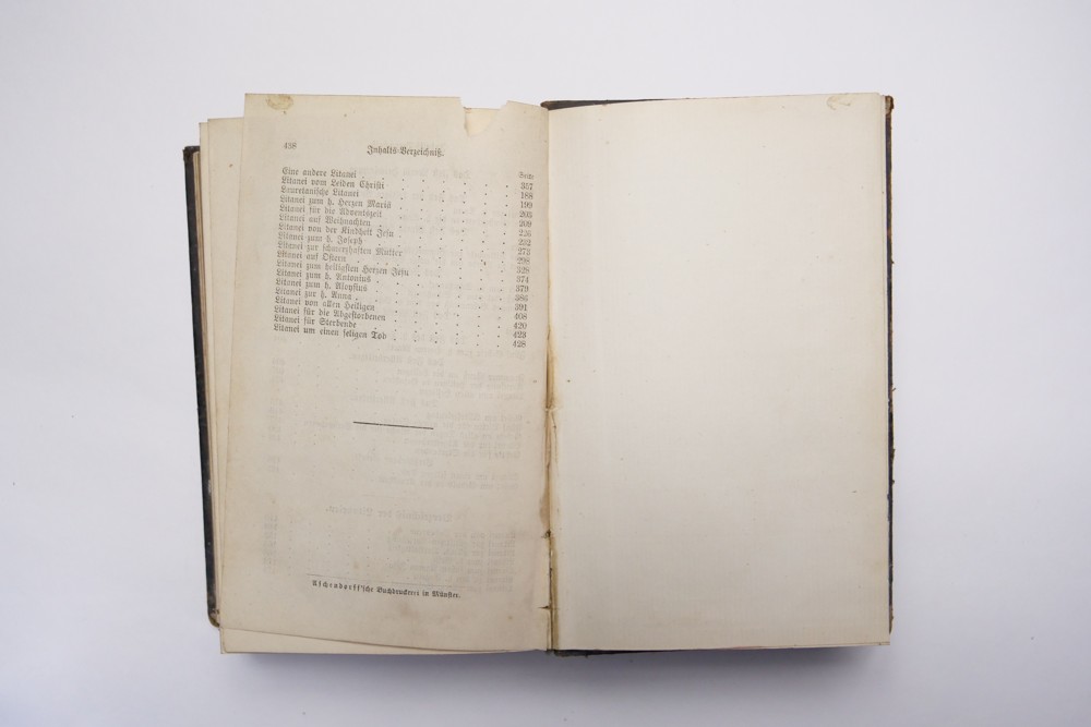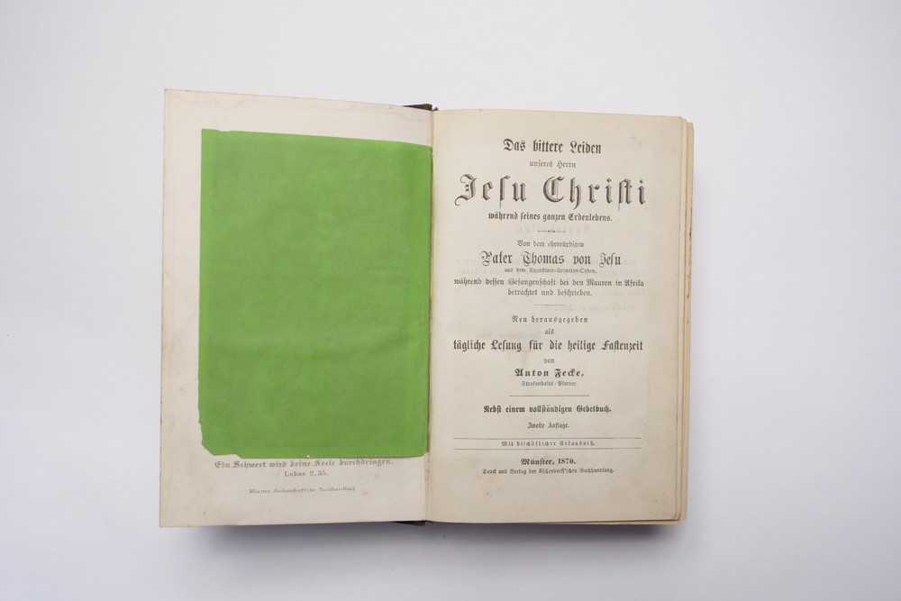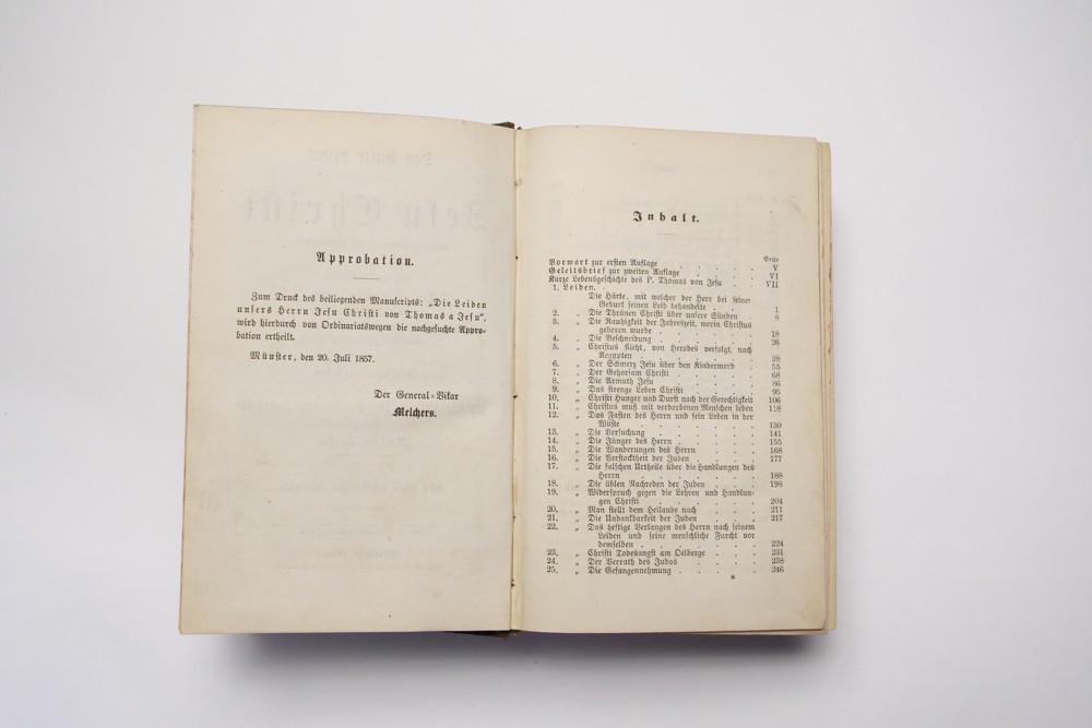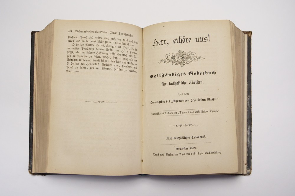 12 (ggm) Kniha náboženského charakteru modlitební, Jesu Christi, Pater Thomas von Desu ranní modlitby Münster 1869, 1870 Rozměr 11 x 17,5 cm, kniha má dvě části. První část má 414 stran, druhí část 432 + obsah 6 stran, desky + hřbet poškozen