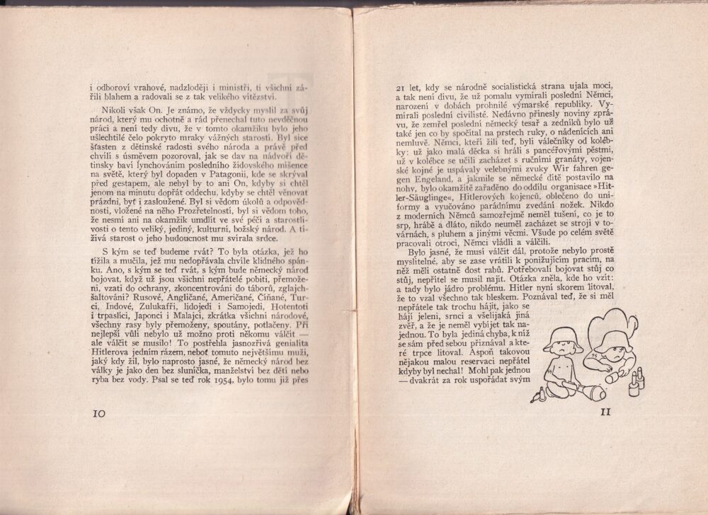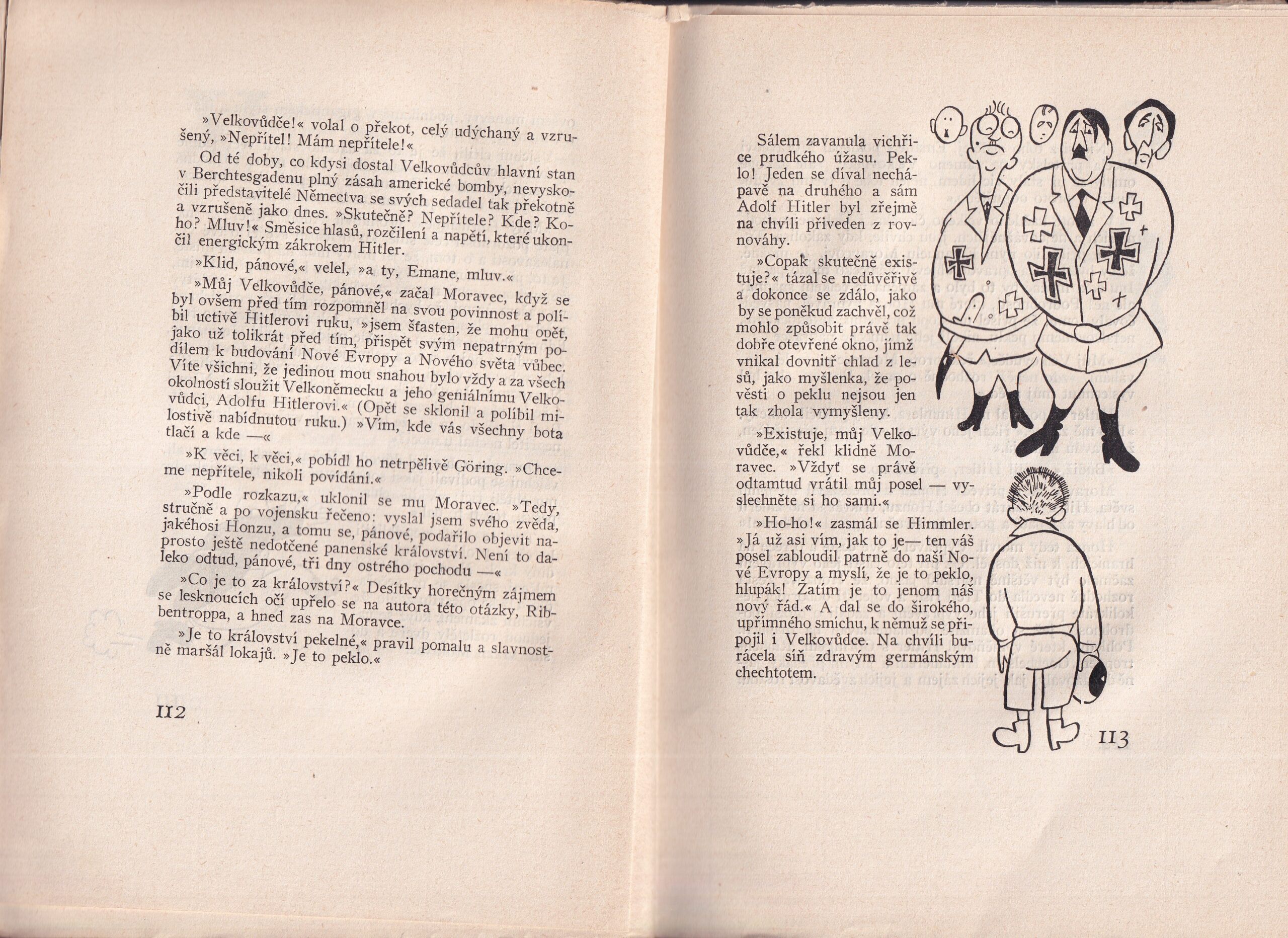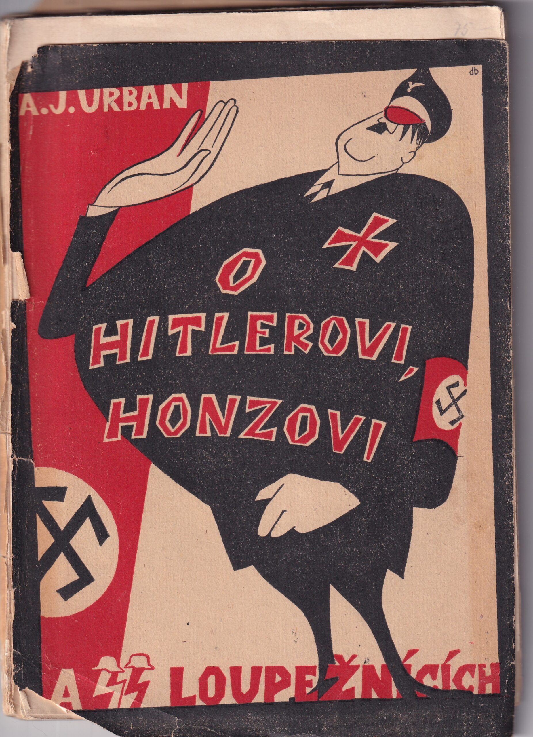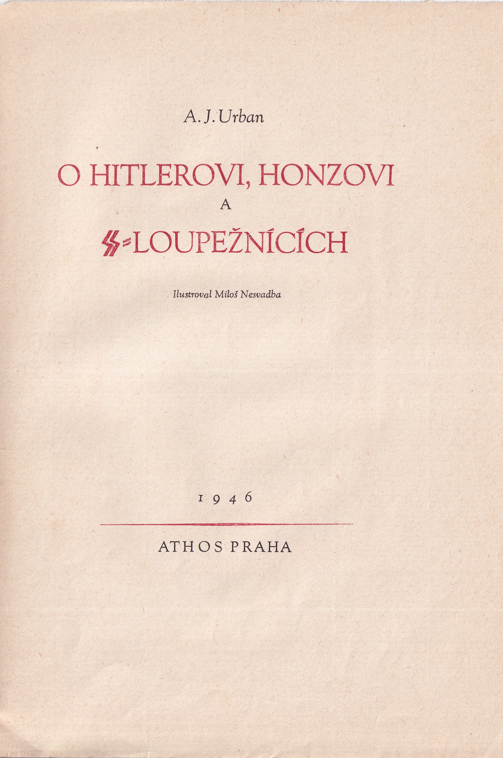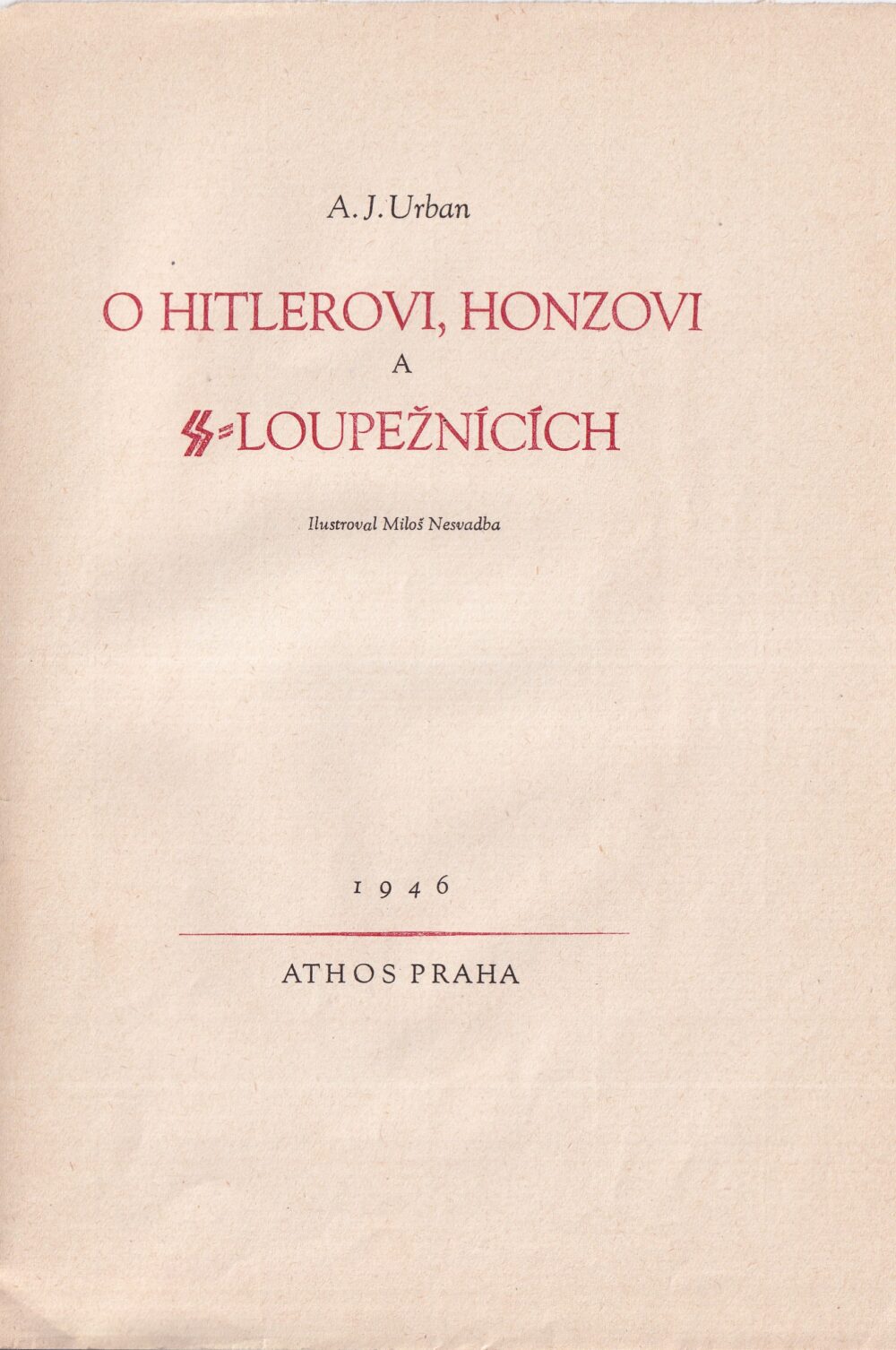 19 (K3-3) Karikatury, ilustrace. Rozměr 15,5 x 21 cm. Kniha O Hitlerovi Honzovi a loupežnících, A.J.Urban,ilustroval Miloš Nesvadba. Svazek I. HUMOR GENERACE A DOBY. Vyšlo v únoru r. 1946. Nakladatelství ATHOS Praha. Počet stran 136. Vazba rozpadlá.
