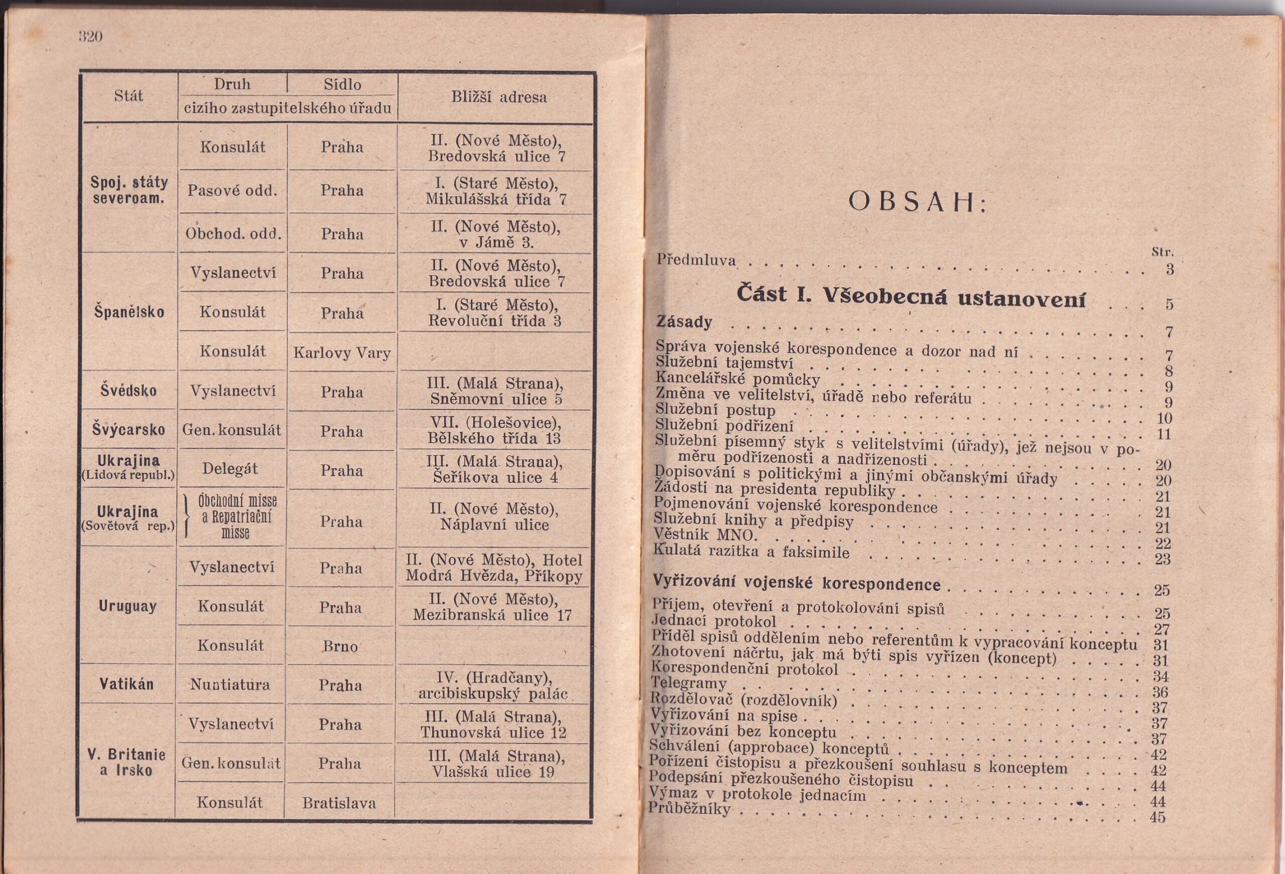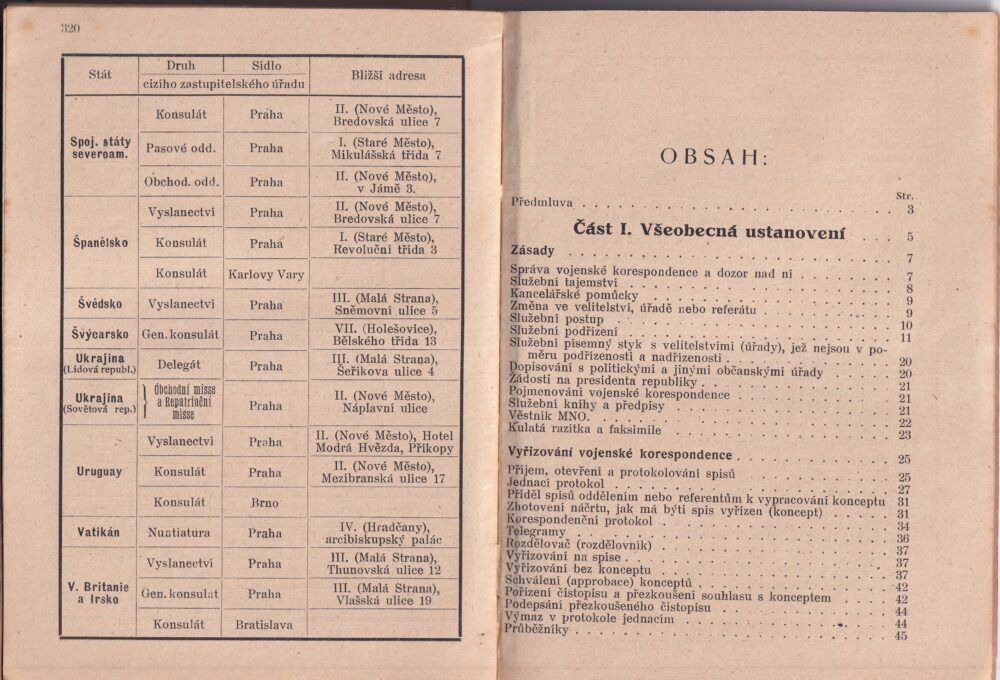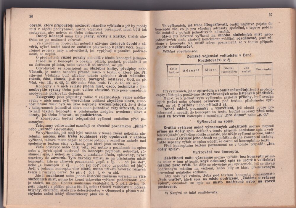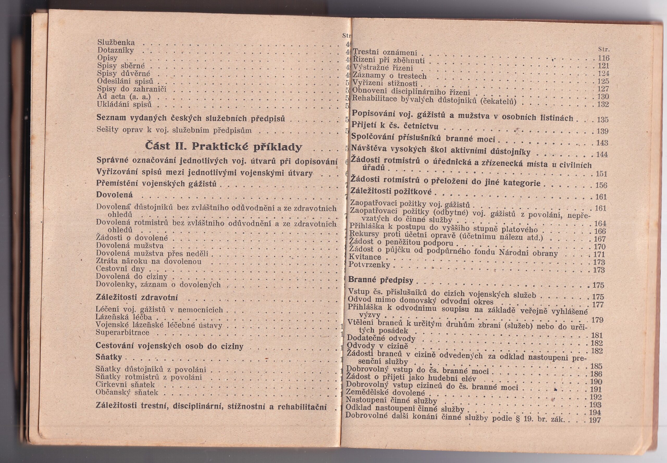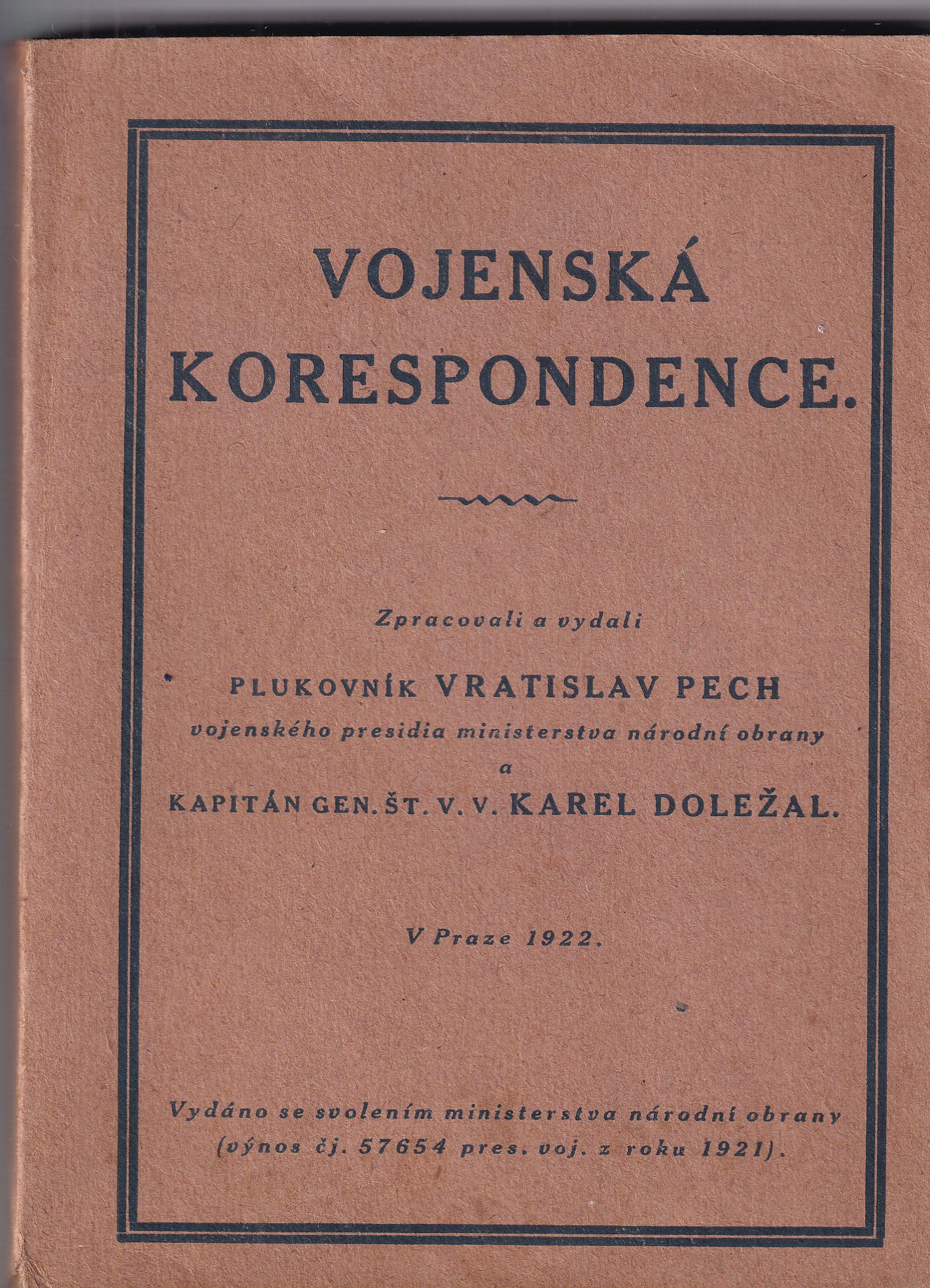 32 (K3-2) Rozměr 12 x 16 cm. Vojenská korespondence, zpracovali a vydali plukovník Vratislav Pech a kapitán gen. Št.V.V. Karel Doležal. V Praze 1922. Vydáno se svolením ministerstva národní obrany. Z obsahu: kniha obsahuje tři části. I.část Všeobecná ustanovení – Zásady – Vyřizování vojenské korespodence – Seznam vydaných českých služebních předpisů. Část II. Praktické příklady např. Dovolená – Záležitosti zdravotní – Cestování vojenských osob do ciziny – Sňatky – Branné předpisy ad…Část III. Vojenský adresář – Ministerstvo národní obrany – Vyšší velitelstvo – Hlavní zbraně – Pomocné zbraně – Služby – Četnictvo ad…Počet stran 320.