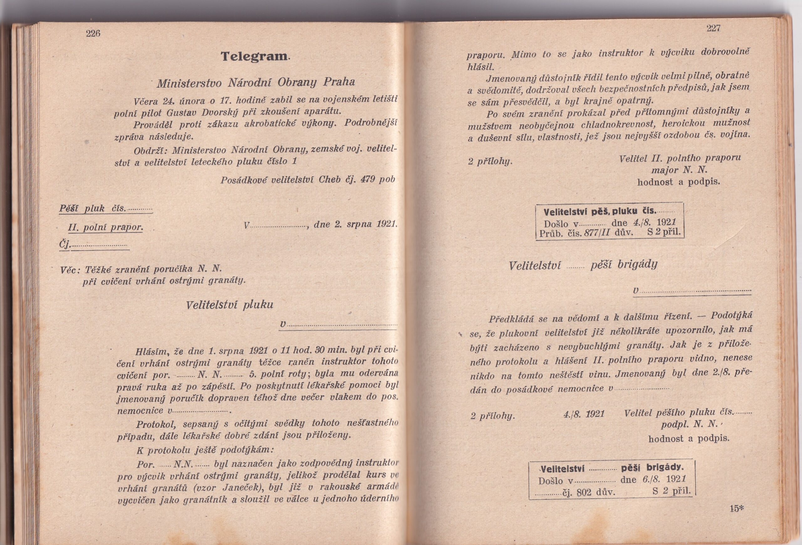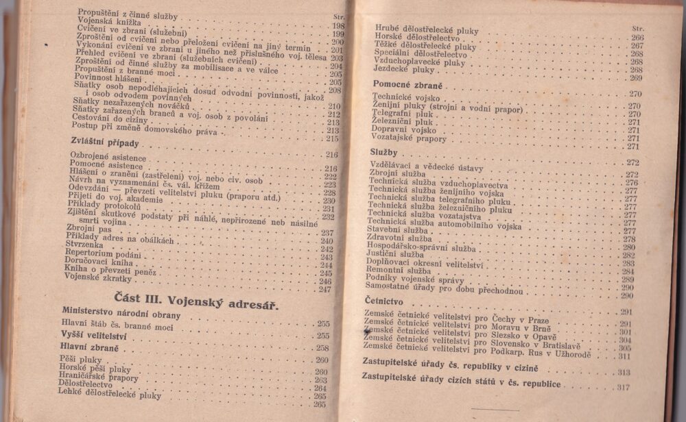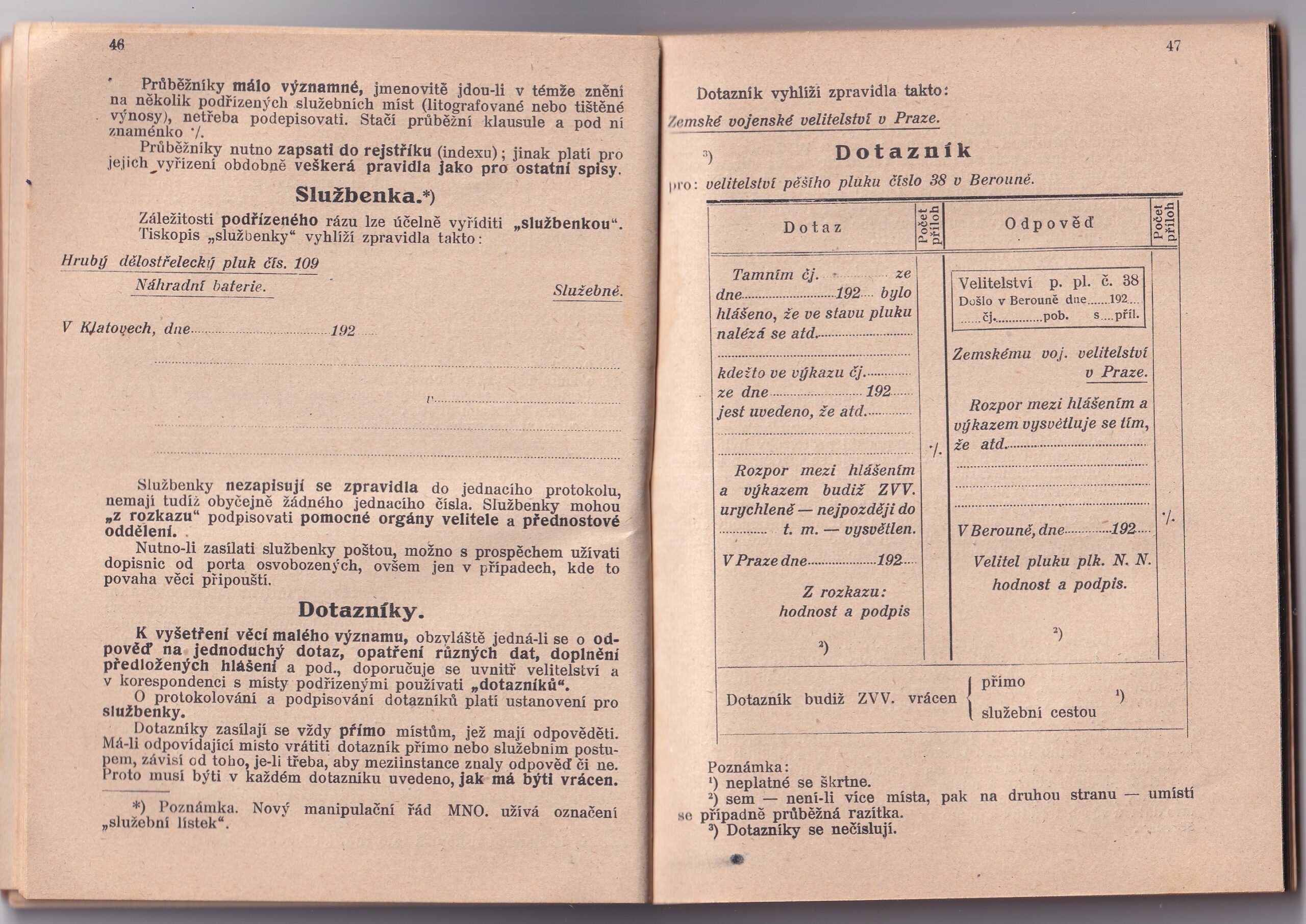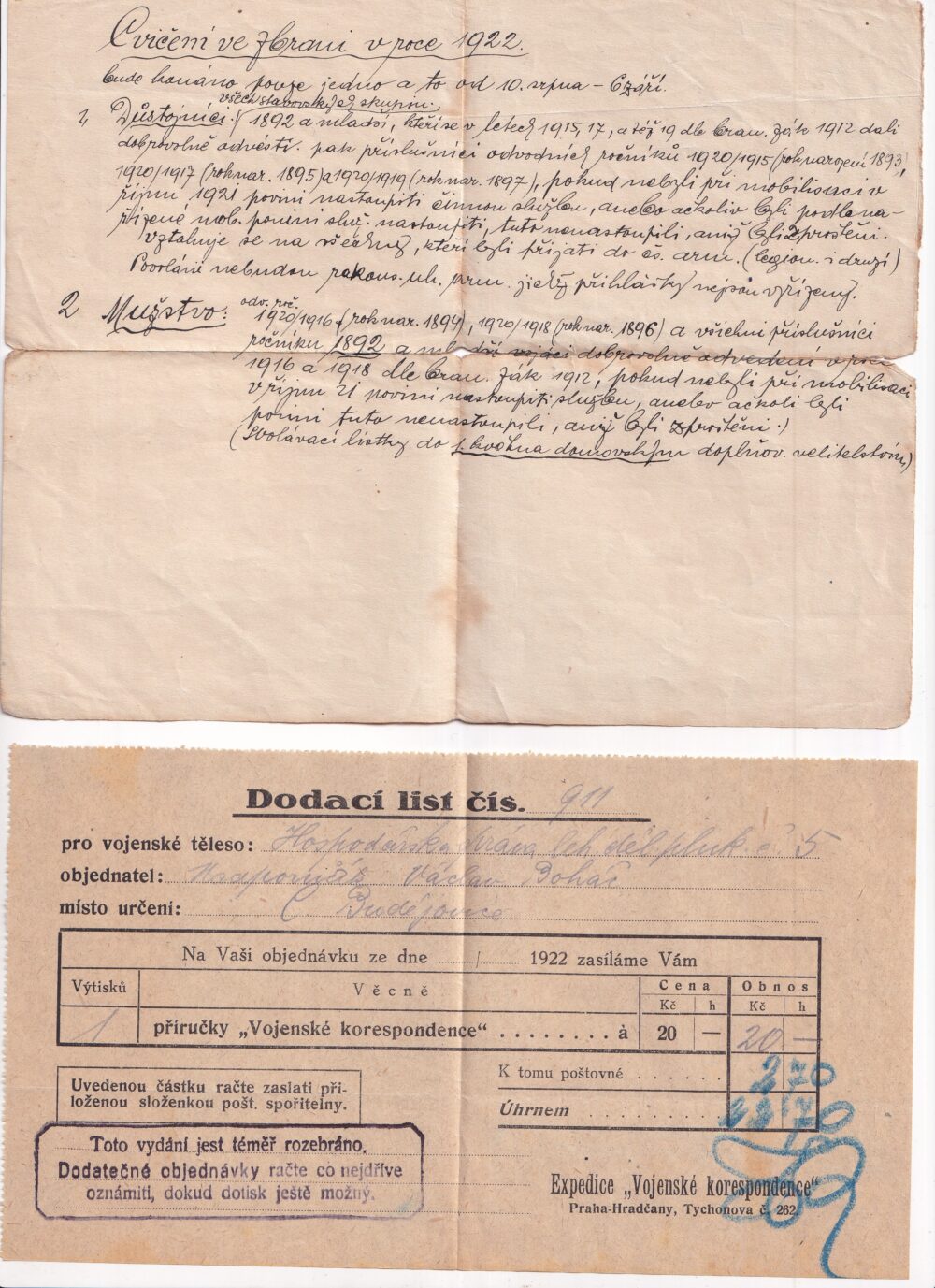 32 (K3-2) Rozměr 12 x 16 cm. Vojenská korespondence, zpracovali a vydali plukovník Vratislav Pech a kapitán gen. Št.V.V. Karel Doležal. V Praze 1922. Vydáno se svolením ministerstva národní obrany. Z obsahu: kniha obsahuje tři části. I.část Všeobecná ustanovení – Zásady – Vyřizování vojenské korespodence – Seznam vydaných českých služebních předpisů. Část II. Praktické příklady např. Dovolená – Záležitosti zdravotní – Cestování vojenských osob do ciziny – Sňatky – Branné předpisy ad…Část III. Vojenský adresář – Ministerstvo národní obrany – Vyšší velitelstvo – Hlavní zbraně – Pomocné zbraně – Služby – Četnictvo ad…Počet stran 320.
