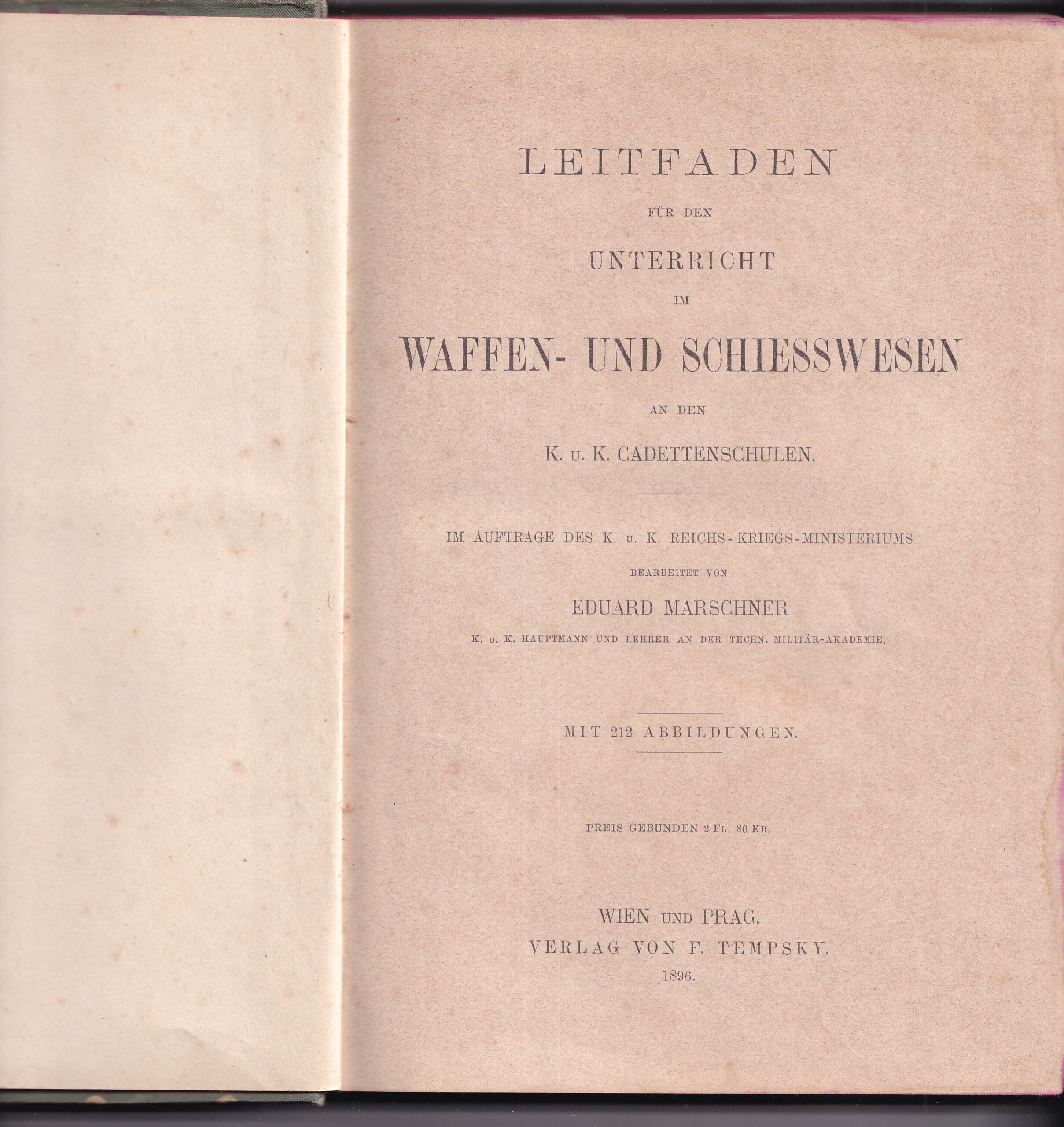 9 (K3-1) Rozměr knihy 15 x 22 cm. Průvodce. Návod – Zbraně a střelba, Eduard Marschhner K.C.K. Kadetské školy, 1896. Počet stran úvod + obsah 8 stran, kniha obsahuje 375 stran + ilustrace 212 obrázků. Pušky, děla, revolvery