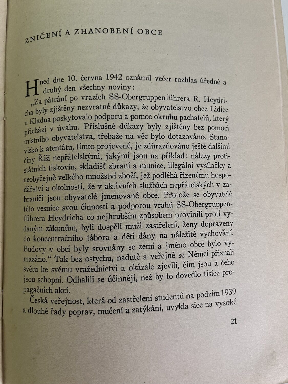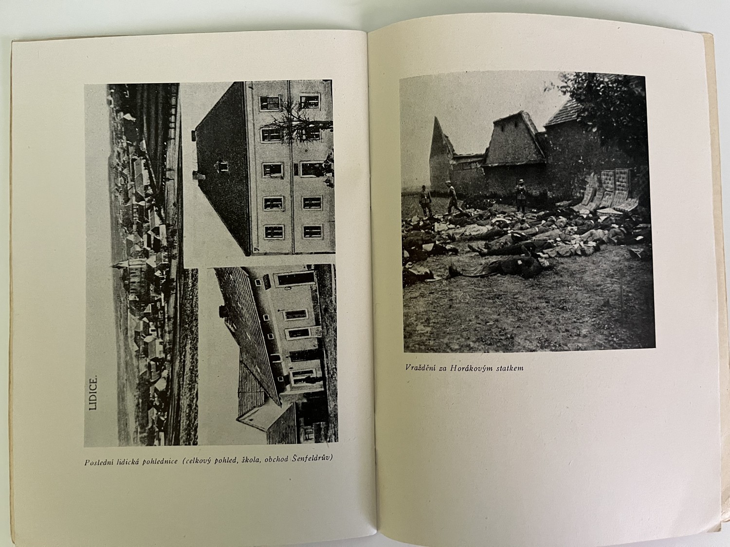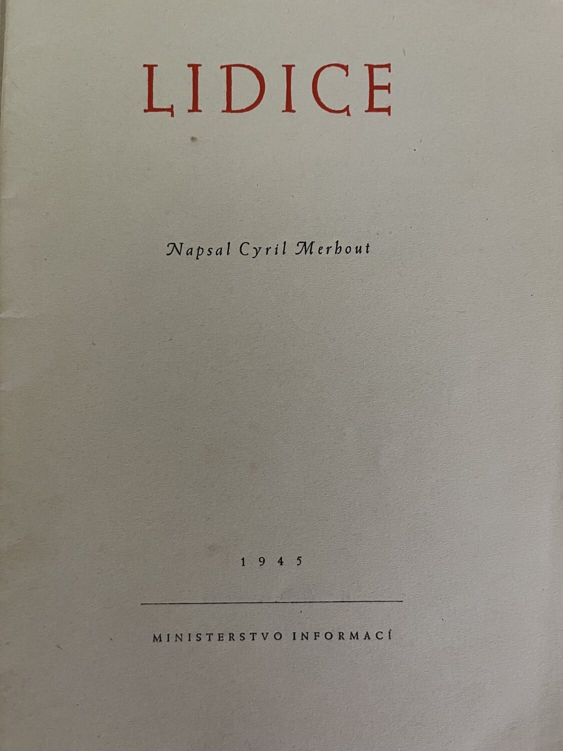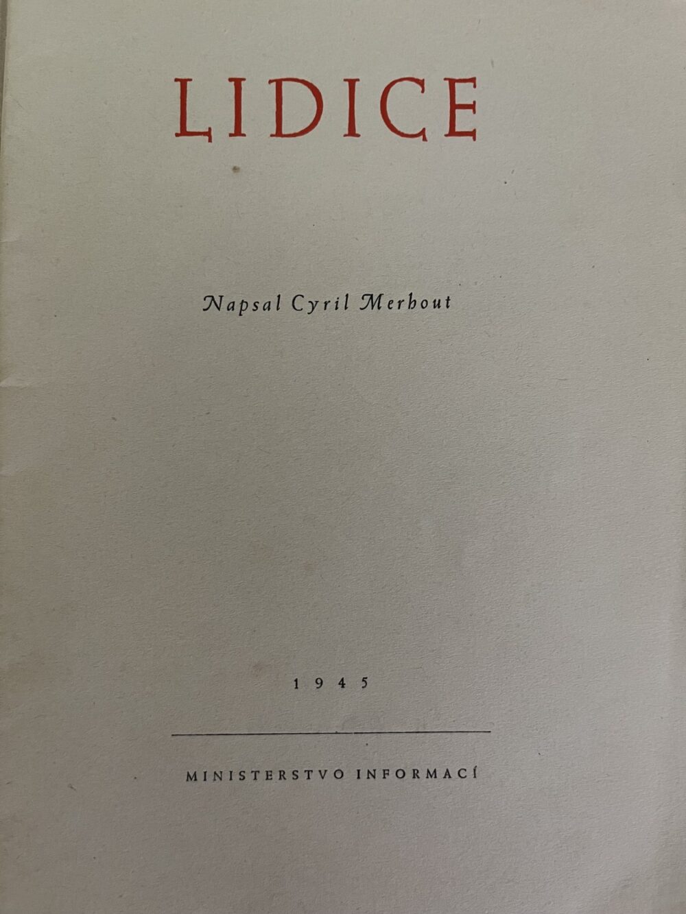 hhj 19 Rozměr: 14,5 x 20,5 cm. Kniha Lidice, napsal Cyril Merhout. Vydalo Ministerstvo informací v Praze, 1945. Počet stran 29. Rozměr: 21 x 30 cm. Lidice Ministerstvo vnitra Odbor pro politické zpravodajství. Lidice – Čin krvavého teroru a porušení zákonů i základních lidských práv. Počet stran 123 + obsah, seznam vyobrazení + 30 stran, které obsahují fotografie, ofocené dokumenty, články, ilustrace, snímky, mapka, plánky + přiloženy výstřižky z novin a kartička s portrétem lidického faráře Josefa Štemberka.