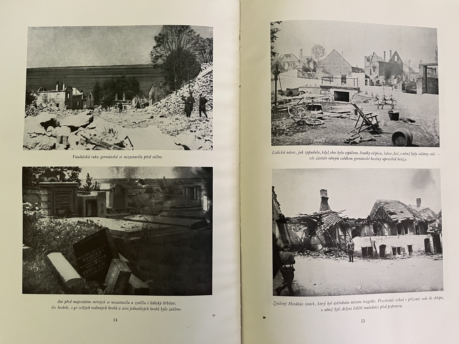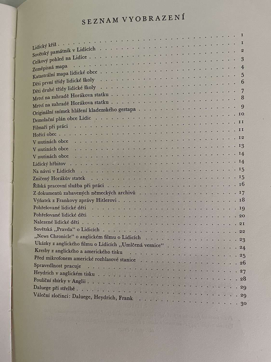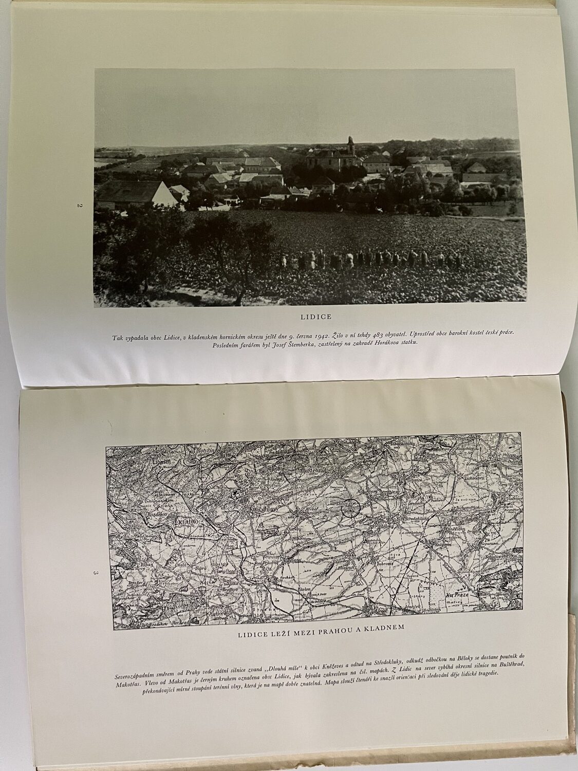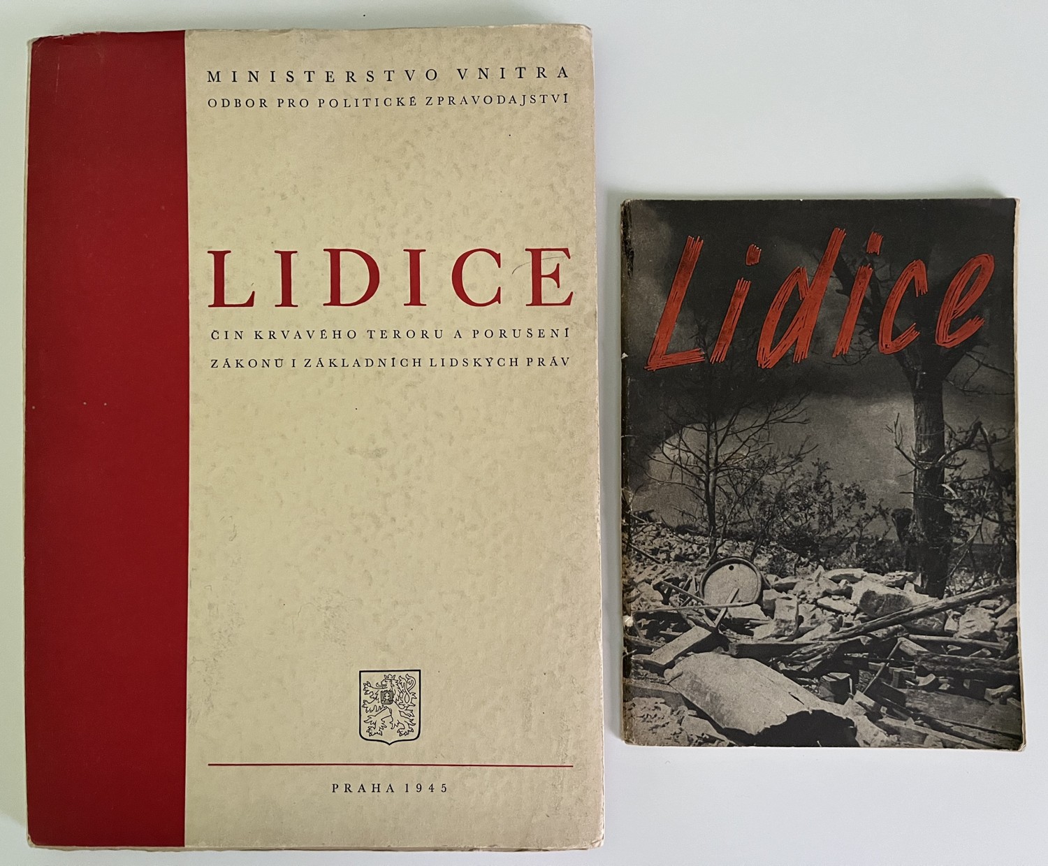 hhj 19 Rozměr: 14,5 x 20,5 cm. Kniha Lidice, napsal Cyril Merhout. Vydalo Ministerstvo informací v Praze, 1945. Počet stran 29. Rozměr: 21 x 30 cm. Lidice Ministerstvo vnitra Odbor pro politické zpravodajství. Lidice – Čin krvavého teroru a porušení zákonů i základních lidských práv. Počet stran 123 + obsah, seznam vyobrazení + 30 stran, které obsahují fotografie, ofocené dokumenty, články, ilustrace, snímky, mapka, plánky + přiloženy výstřižky z novin a kartička s portrétem lidického faráře Josefa Štemberka.