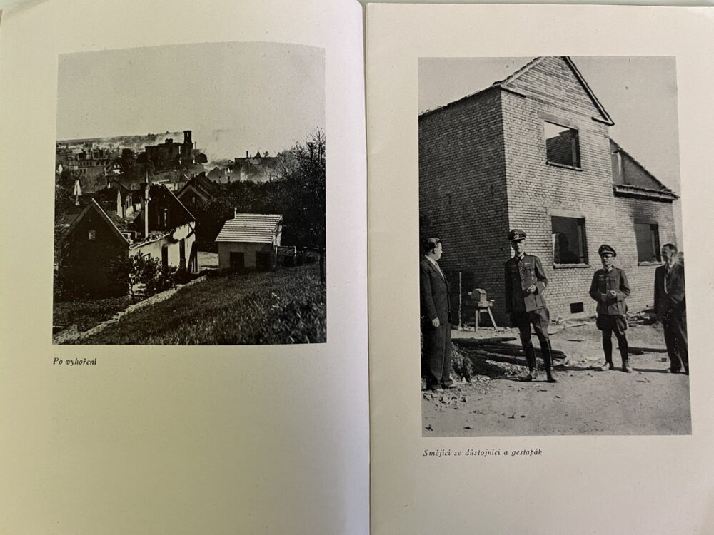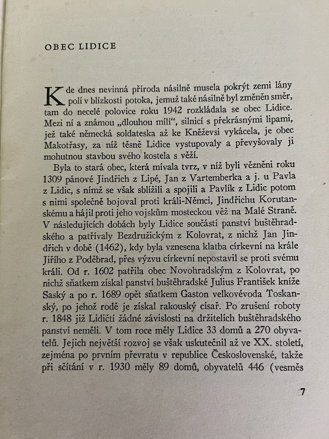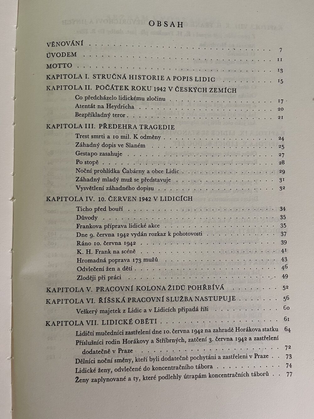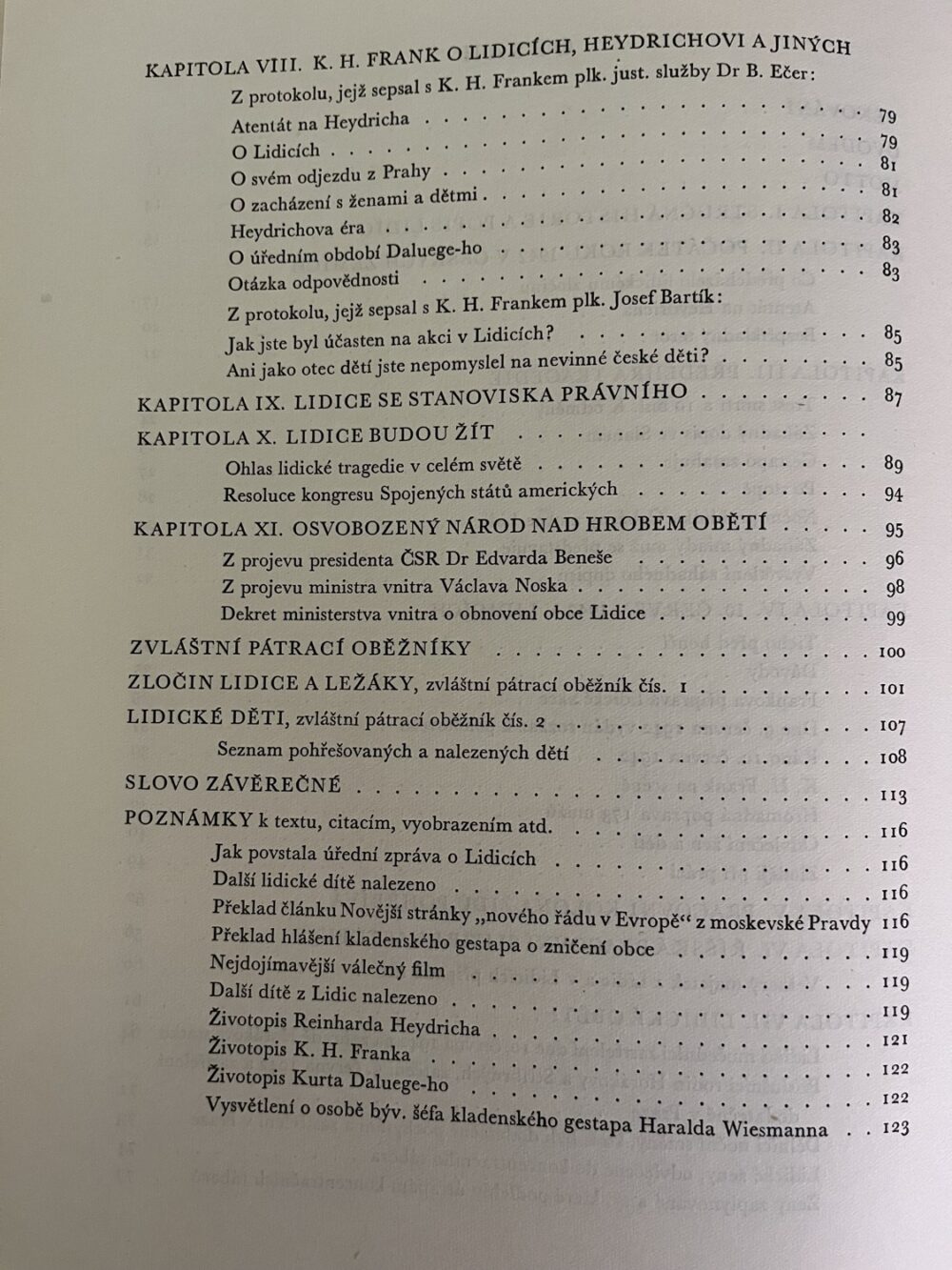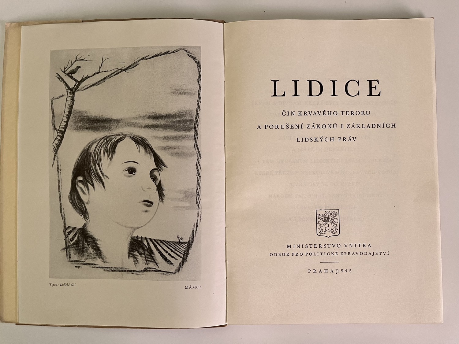 hhj 19 Rozměr: 14,5 x 20,5 cm. Kniha Lidice, napsal Cyril Merhout. Vydalo Ministerstvo informací v Praze, 1945. Počet stran 29. Rozměr: 21 x 30 cm. Lidice Ministerstvo vnitra Odbor pro politické zpravodajství. Lidice – Čin krvavého teroru a porušení zákonů i základních lidských práv. Počet stran 123 + obsah, seznam vyobrazení + 30 stran, které obsahují fotografie, ofocené dokumenty, články, ilustrace, snímky, mapka, plánky + přiloženy výstřižky z novin a kartička s portrétem lidického faráře Josefa Štemberka.