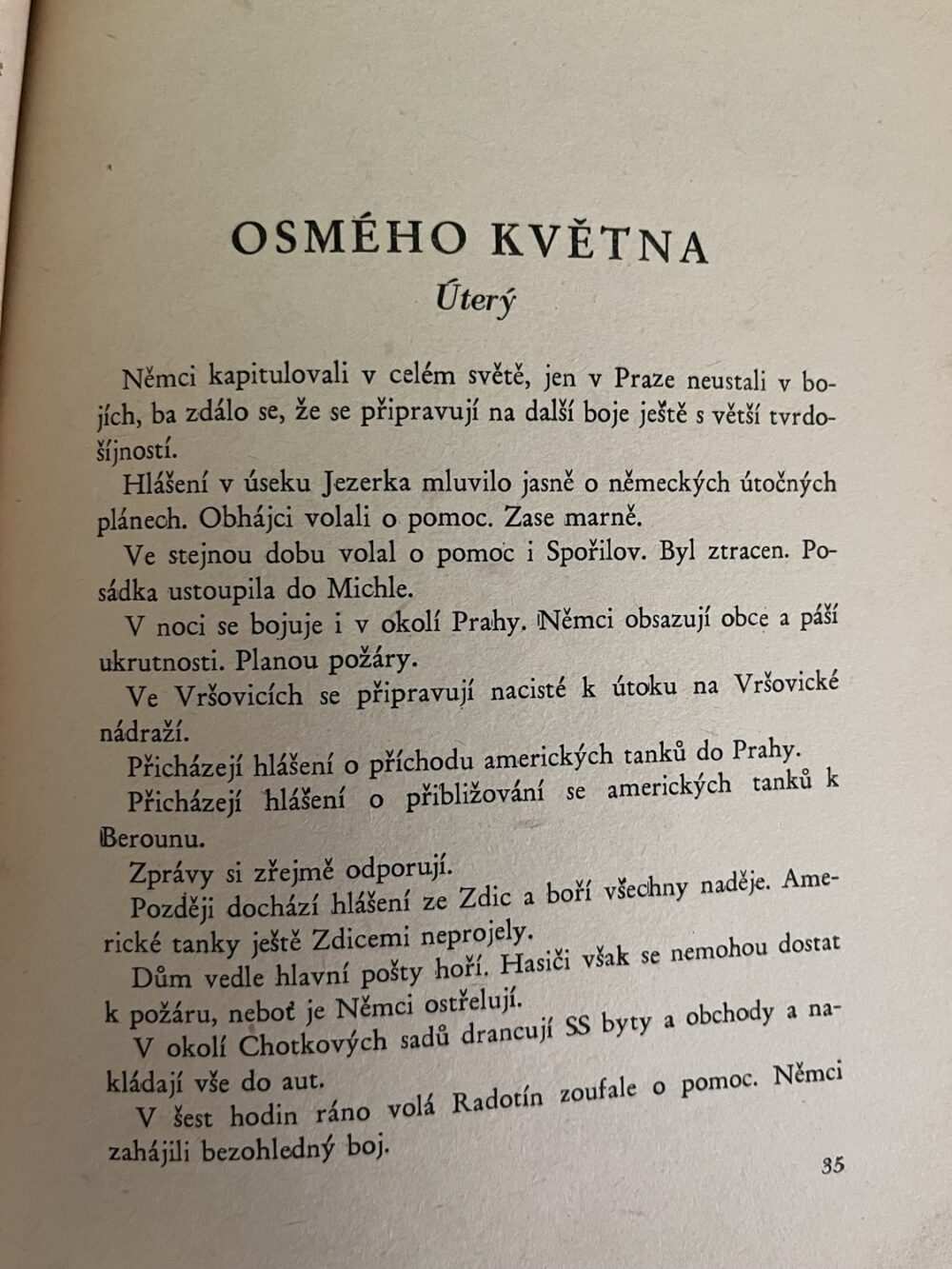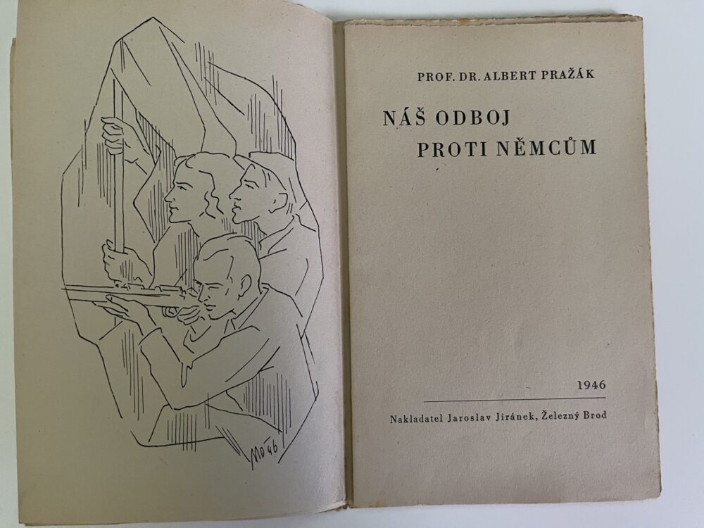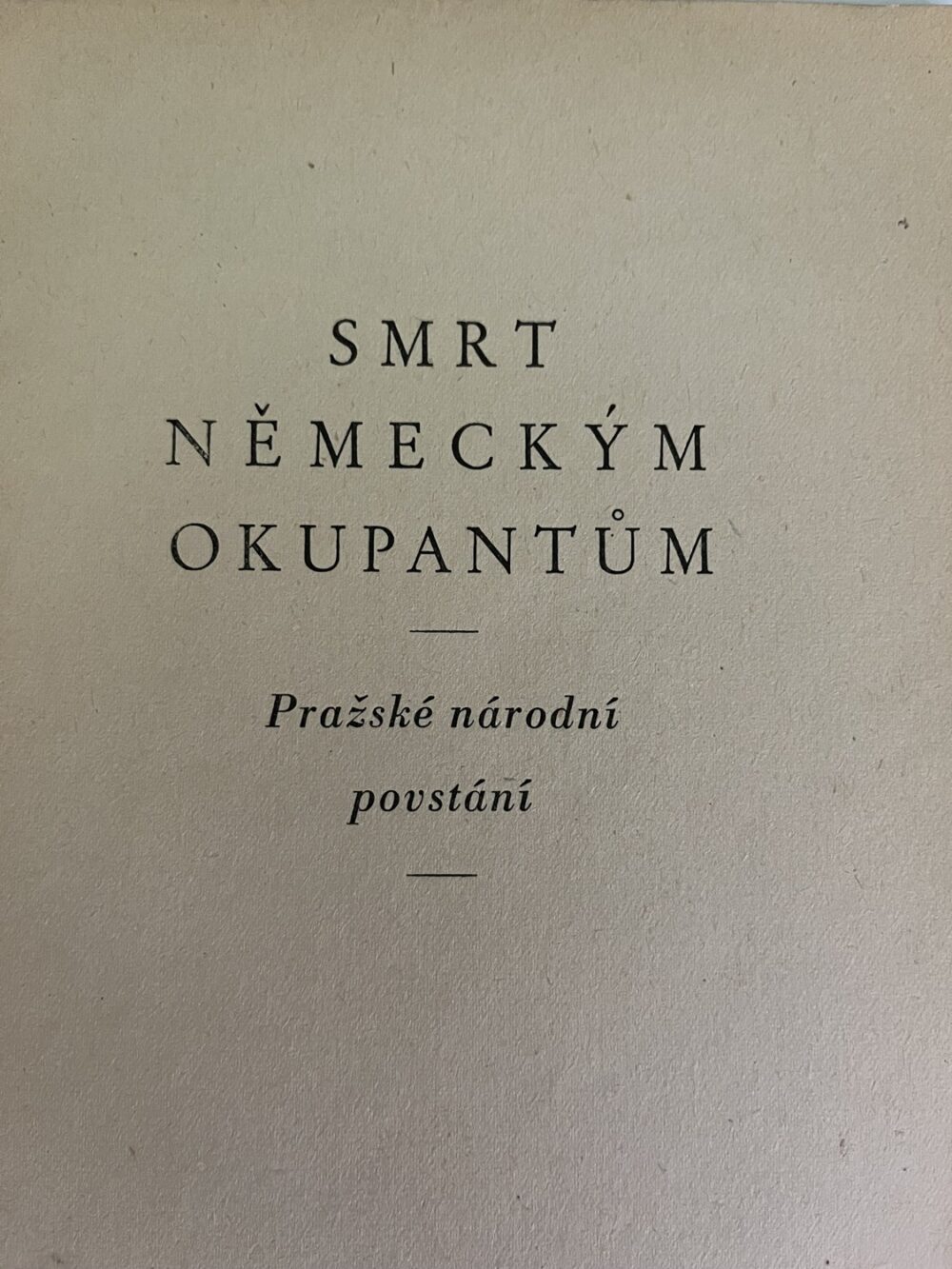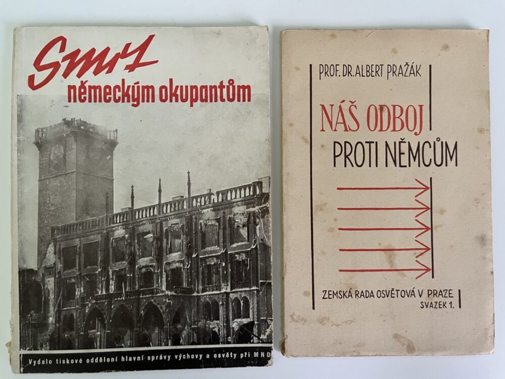 (hhj 18) 2 x kniha. Smrt německým okupantům – Pražské národní povstání. Z obsahu Pátého května Sobota. Šestého května Neděle. Sedmého května Pondělí. Osmého května Úterý. Den osvobození Středa. Počet stran 46 + 8 fotografií. Vydalo HSVO – MNO 1945. Prof.Dr. Albert Pražák: Náš odboj proti Němcům. Nakladatel Jiránek, Železný Brod. Počet stran 30. Uvolněná vazba.
