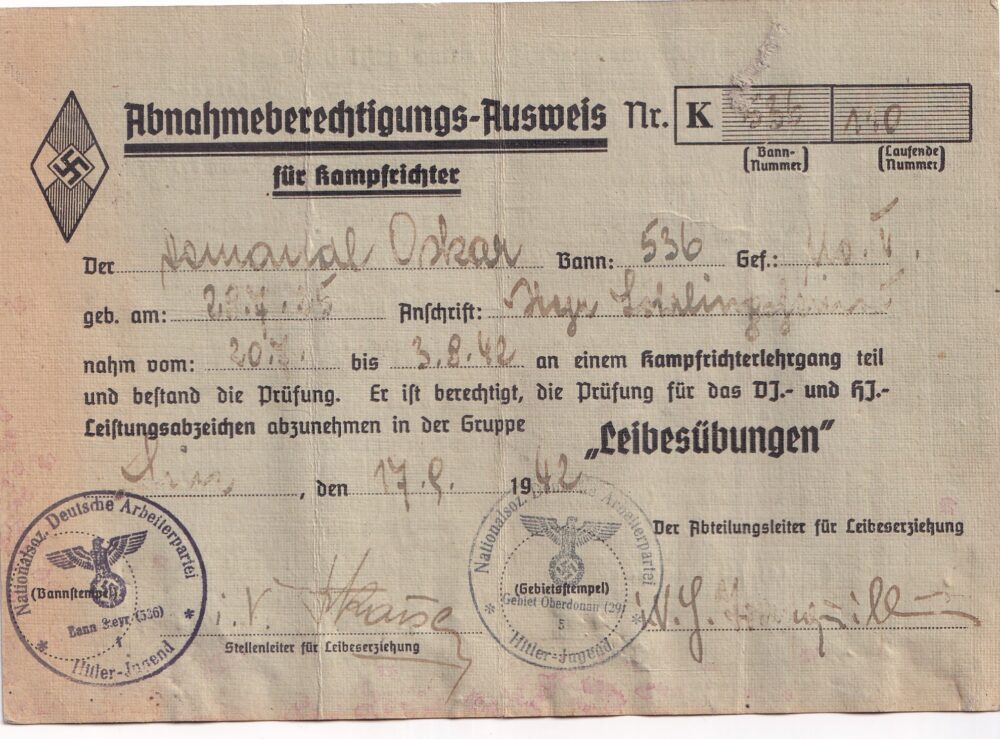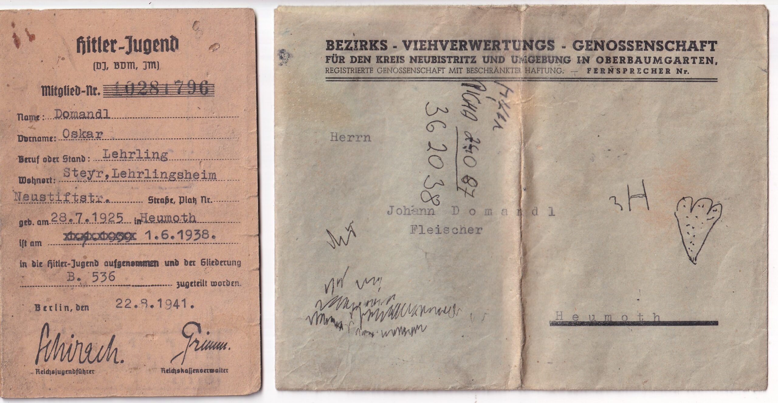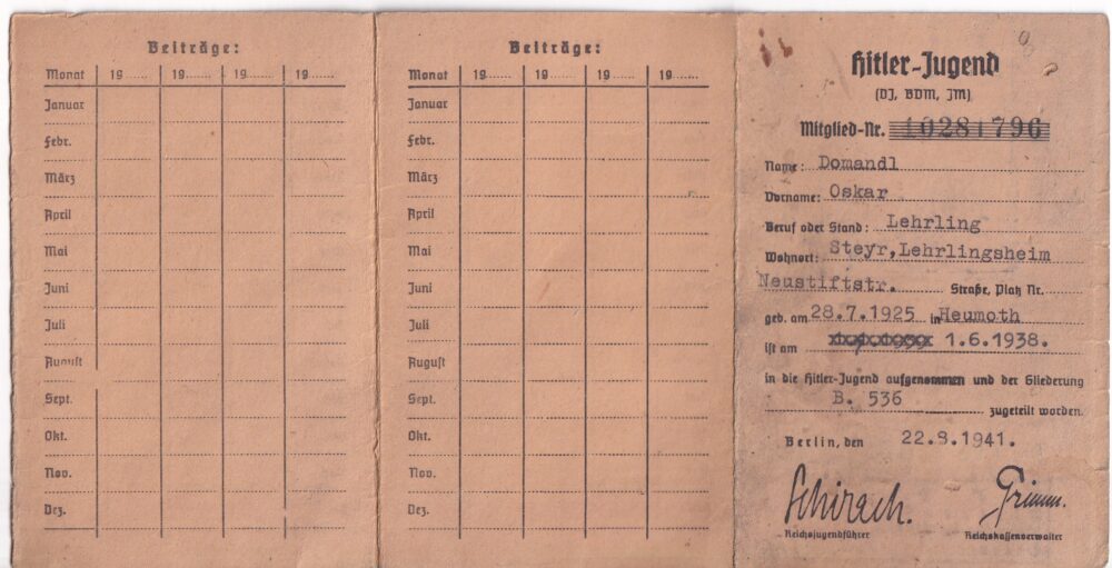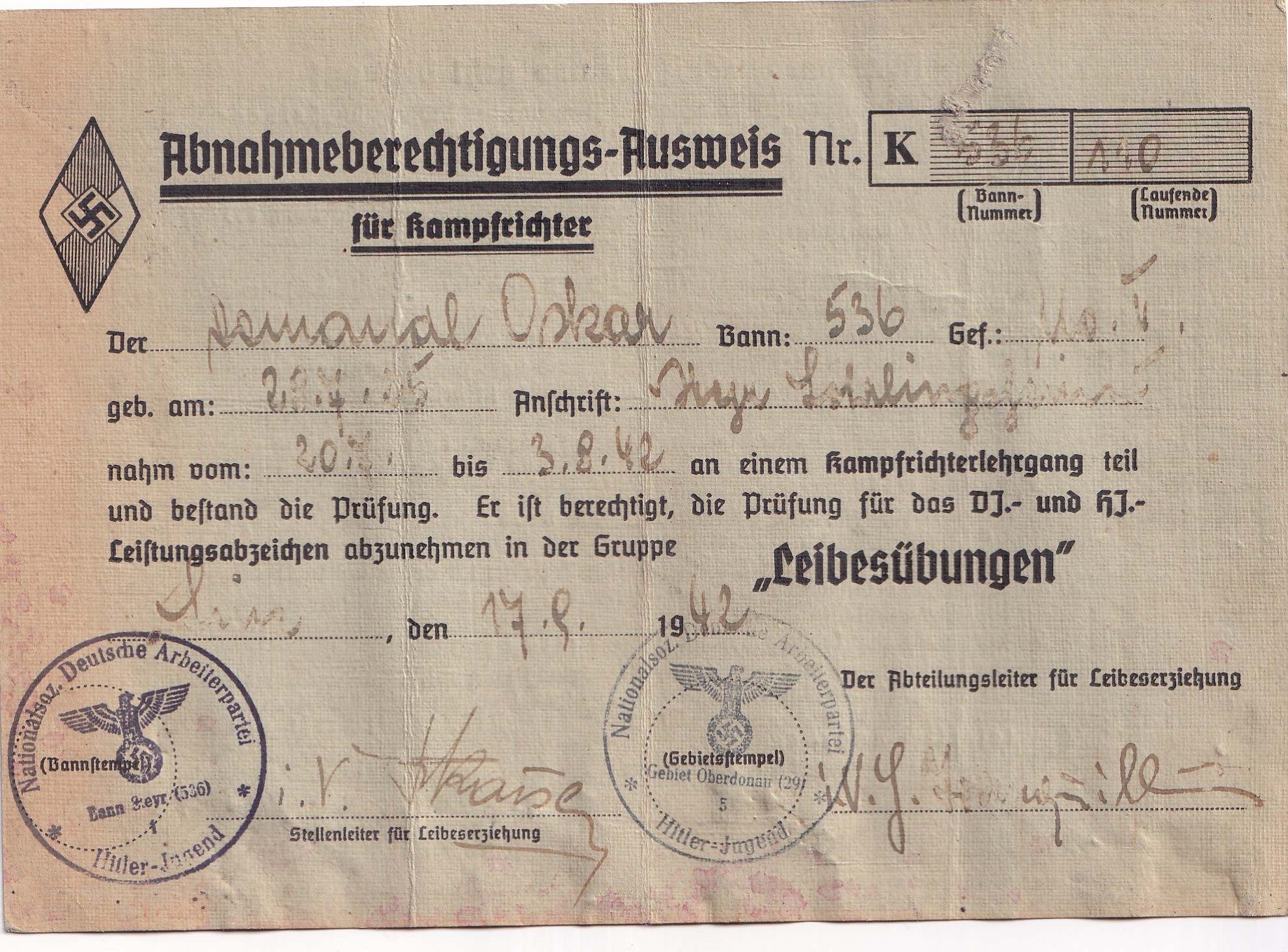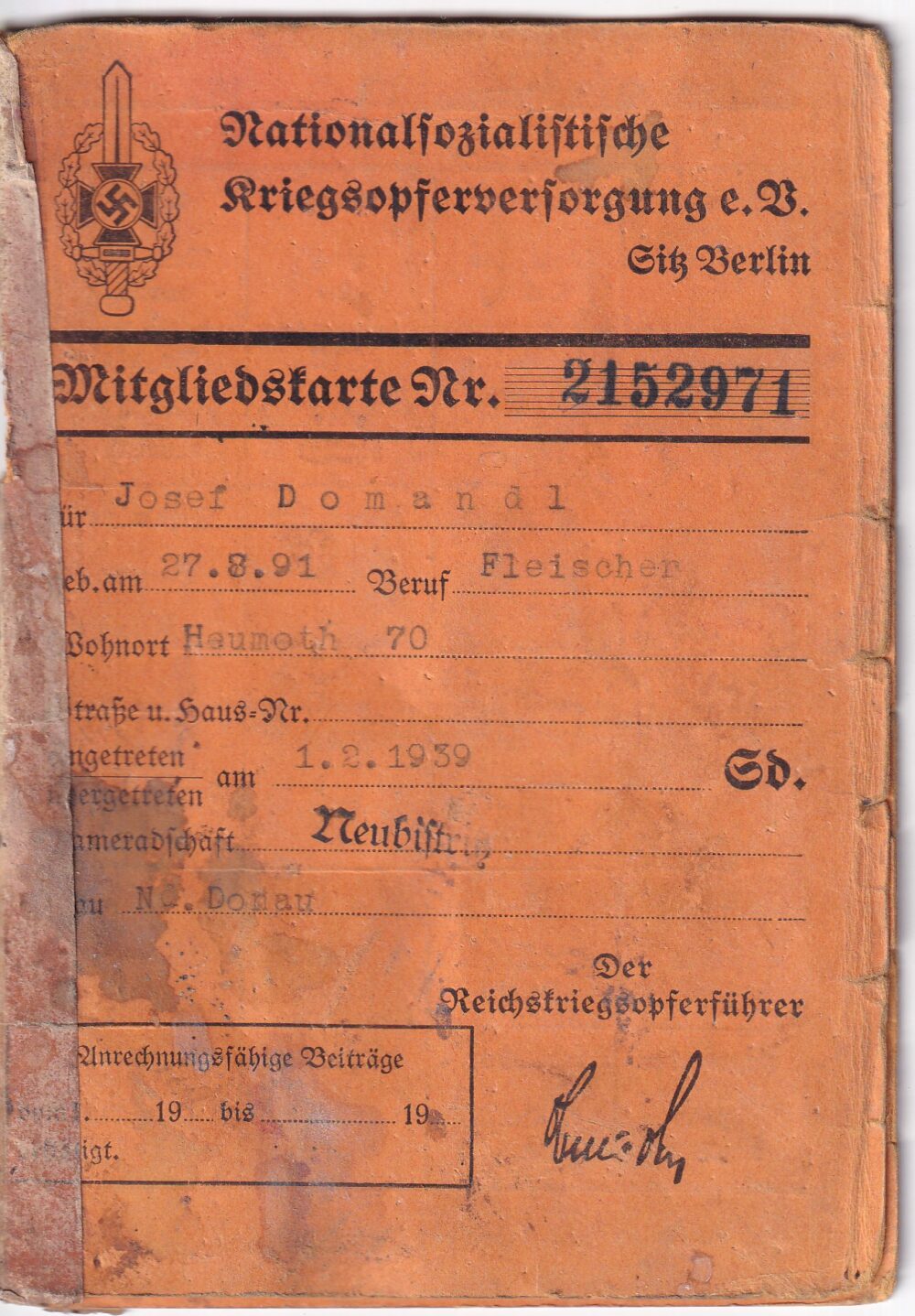 4 (K3-3) Ojedinělý konvolut originálních a sběratelsky hledaných dokumentů a legitimací. Po příslušníkovi Hitler Jugend – Johann Domandl Fleischer, působení v Číměři ( Heumoth ) okres Jindřichův Hradec. Celek obsahuje Členský průkaz, národní socialista. Péče o oběti války. 10,5 cm x 15 cm. 8 stran, známky r.1939 – r.1944. Účet s razítkem, 26.1.1941 21 x 14cm. Negativ vojáka 5 x 6 cm. Obálka + dokument Oberbaumgarten, r. 1940 – Okresní družstvo pro využití hospodářských zvířat pro okres Neu Bistritz-Nová Bystřice a okolí, obálka 16 x 12 cm, dokument 21x 15 cm. Členská průkazka Hitlerova mládež, Berlín 1941, 6 stran, 8 x 12,5 cm. Přijímací autorizační karta pro rozhodčí, po složení zkoušky má nárok na zkoušku na výkonnostní odznak DJ a HJ ve skupině, 17.9.1942, 17 x 12 cm. Letáček Německo vítězí na všech frontách za Evropu!, 22 x 14 cm. Letáček – Absolvování zkoušky odborného pracovníka musí být zaznemenáno v sešitu, 14 x 8 cm. Potvrzení – Obecní sběrný výbor pro sbírku zimních potřeb všeho druhu pro německé vojáky na frontě potvrzuje, že převzal tyto předměty 1.čepička v Krči 12.1.1942, 20,5 x 15 cm. Letáček Polsnitz, válečné Vánoce 1943 – S potěšením Vám mohu předat speciální vánoční dárek v podobě peněžní částky. Zároveň bych Vám chtěl poděkovat za Vaši práci a popřát Vám krásné Vánoce a šťastný nový rok, 15 x 10,5 cm. Reich chlebová karta, platnost od 18.12. 1939 – 14.1.1940, 6,5 x 9 cm. Kniha Hitlerova mládež – Chceme vychovat tvrdou generaci silnou, spolehlivou, loajální, poslušnou a slušnou, abychom se nemuseli stydět za své lidi před historií Adolf Hitler, 10,5 x 14,5 cm 32 stran. Německá říše, průkaz totožnosti, s fotkou, s otisky, razítko, Steyr (Štýr) Rakousko 1942, 3 strany, 10,5 x 15 cm. Obchodní a průmyslová komora Horní Dunaj Linec – Certifikát o zkoušce kvalifikovaného pracovníka – Zámečník motorových vozidel, Linz 27.března 1943, 21 x 30 cm. Státní střední škola pro chlapce – Výroční vysvědčení rok 1938/39, 21 x 30 cm – poškozen.