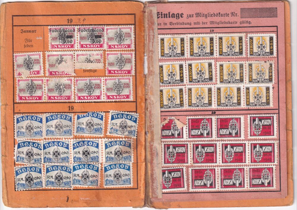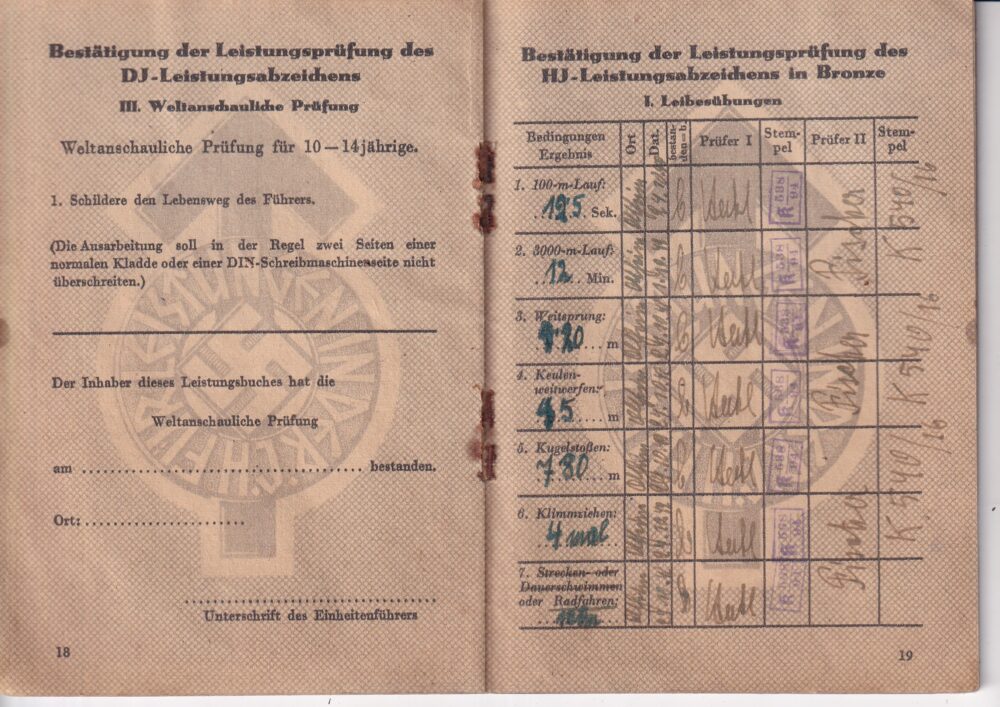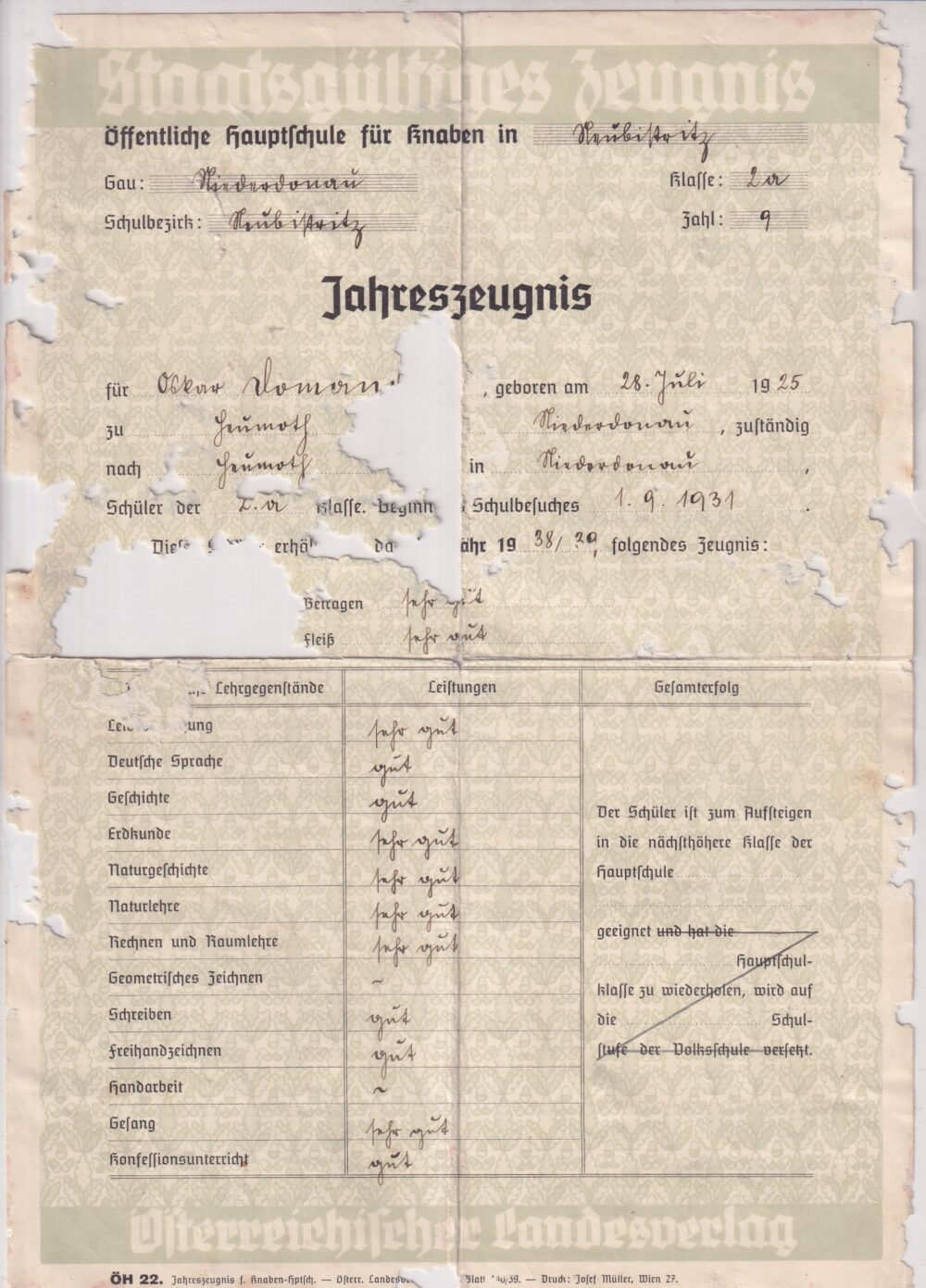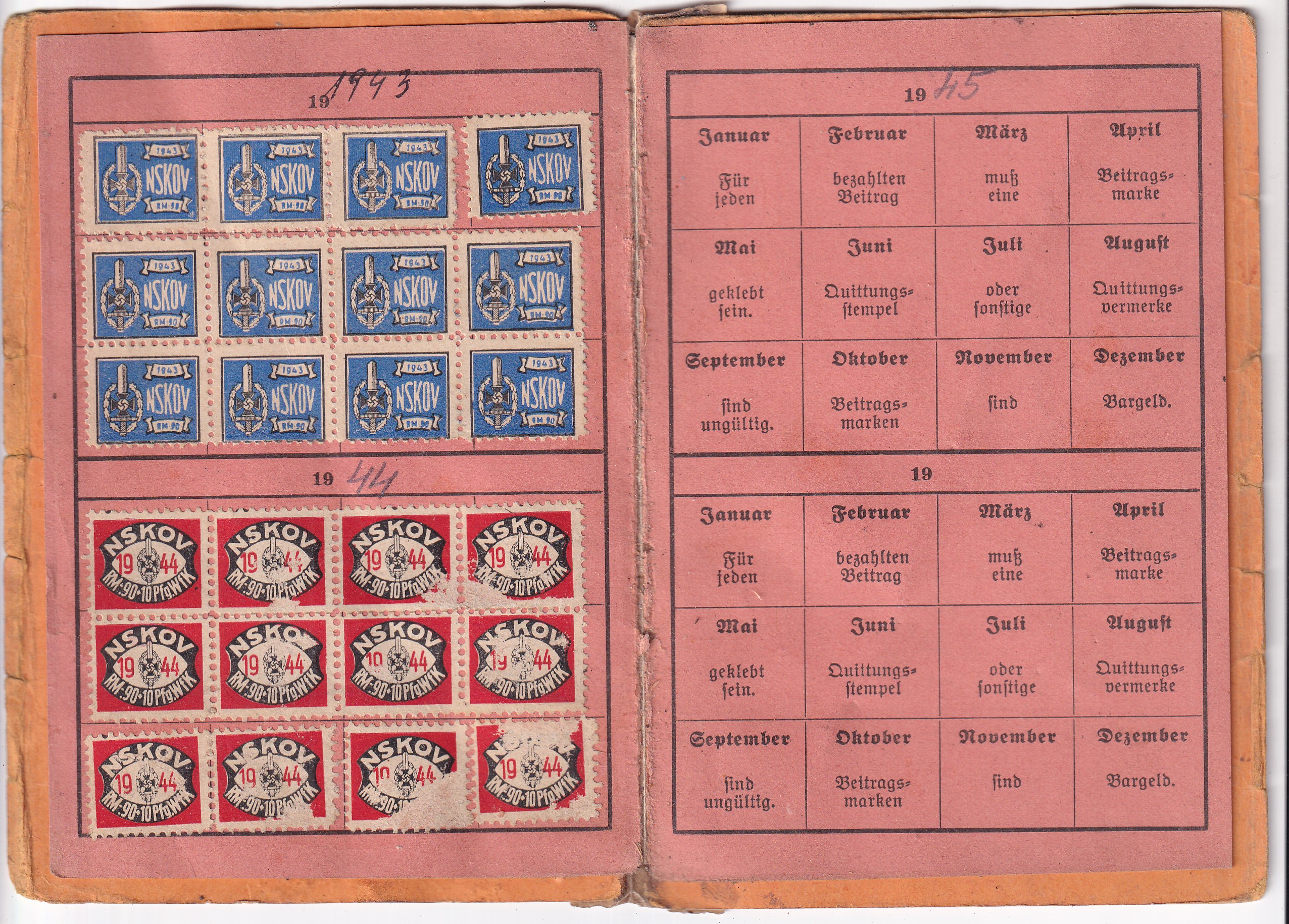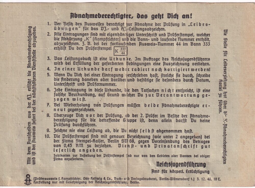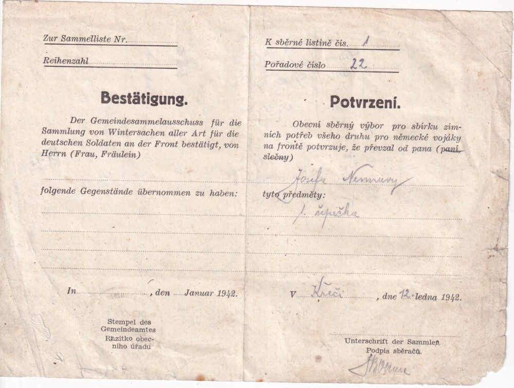 4 (K3-3) Ojedinělý konvolut originálních a sběratelsky hledaných dokumentů a legitimací. Po příslušníkovi Hitler Jugend – Johann Domandl Fleischer, působení v Číměři ( Heumoth ) okres Jindřichův Hradec. Celek obsahuje Členský průkaz, národní socialista. Péče o oběti války. 10,5 cm x 15 cm. 8 stran, známky r.1939 – r.1944. Účet s razítkem, 26.1.1941 21 x 14cm. Negativ vojáka 5 x 6 cm. Obálka + dokument Oberbaumgarten, r. 1940 – Okresní družstvo pro využití hospodářských zvířat pro okres Neu Bistritz-Nová Bystřice a okolí, obálka 16 x 12 cm, dokument 21x 15 cm. Členská průkazka Hitlerova mládež, Berlín 1941, 6 stran, 8 x 12,5 cm. Přijímací autorizační karta pro rozhodčí, po složení zkoušky má nárok na zkoušku na výkonnostní odznak DJ a HJ ve skupině, 17.9.1942, 17 x 12 cm. Letáček Německo vítězí na všech frontách za Evropu!, 22 x 14 cm. Letáček – Absolvování zkoušky odborného pracovníka musí být zaznemenáno v sešitu, 14 x 8 cm. Potvrzení – Obecní sběrný výbor pro sbírku zimních potřeb všeho druhu pro německé vojáky na frontě potvrzuje, že převzal tyto předměty 1.čepička v Krči 12.1.1942, 20,5 x 15 cm. Letáček Polsnitz, válečné Vánoce 1943 – S potěšením Vám mohu předat speciální vánoční dárek v podobě peněžní částky. Zároveň bych Vám chtěl poděkovat za Vaši práci a popřát Vám krásné Vánoce a šťastný nový rok, 15 x 10,5 cm. Reich chlebová karta, platnost od 18.12. 1939 – 14.1.1940, 6,5 x 9 cm. Kniha Hitlerova mládež – Chceme vychovat tvrdou generaci silnou, spolehlivou, loajální, poslušnou a slušnou, abychom se nemuseli stydět za své lidi před historií Adolf Hitler, 10,5 x 14,5 cm 32 stran. Německá říše, průkaz totožnosti, s fotkou, s otisky, razítko, Steyr (Štýr) Rakousko 1942, 3 strany, 10,5 x 15 cm. Obchodní a průmyslová komora Horní Dunaj Linec – Certifikát o zkoušce kvalifikovaného pracovníka – Zámečník motorových vozidel, Linz 27.března 1943, 21 x 30 cm. Státní střední škola pro chlapce – Výroční vysvědčení rok 1938/39, 21 x 30 cm – poškozen.