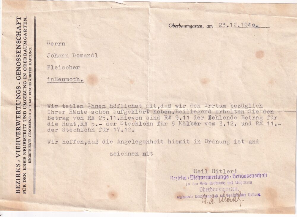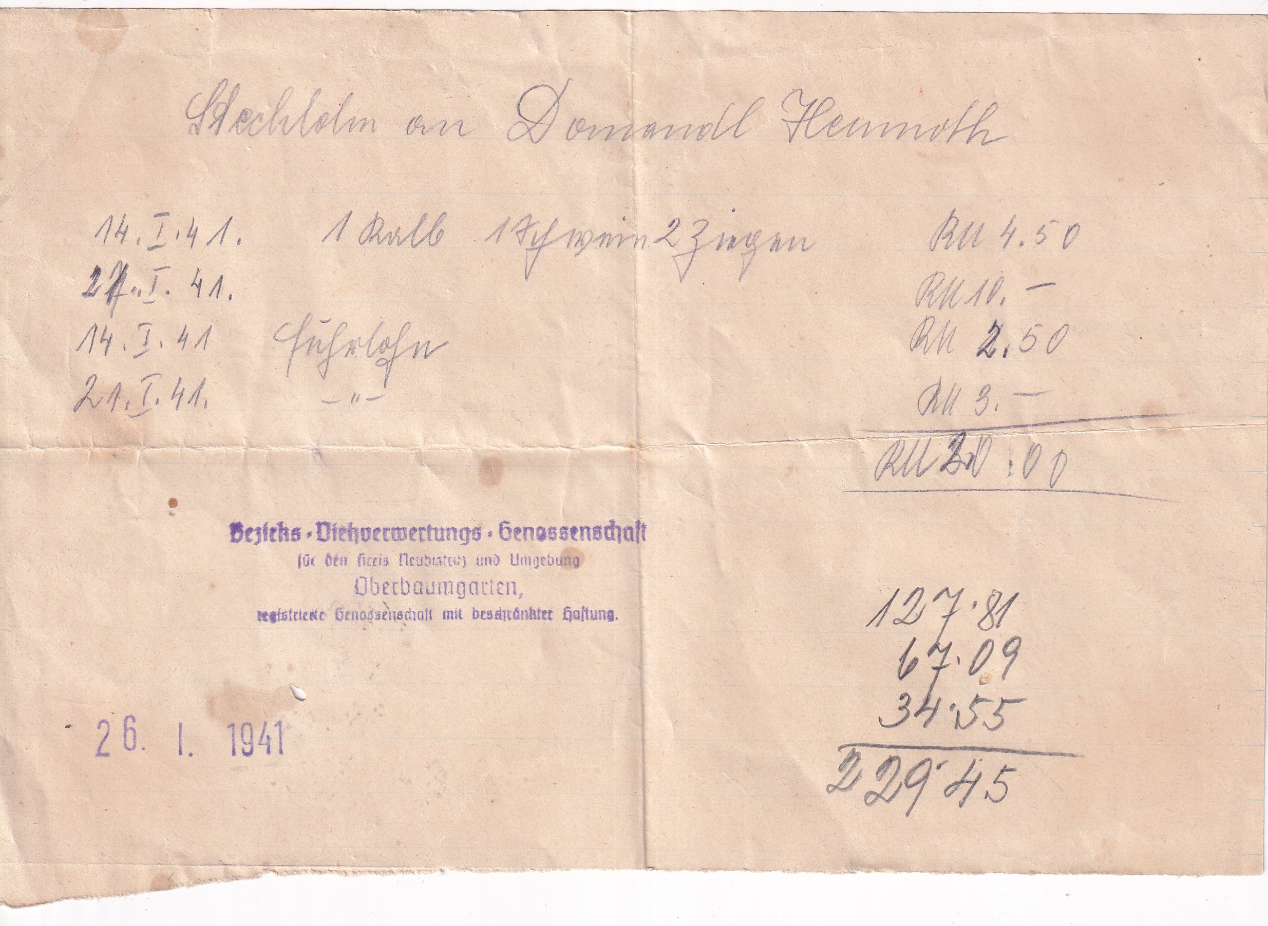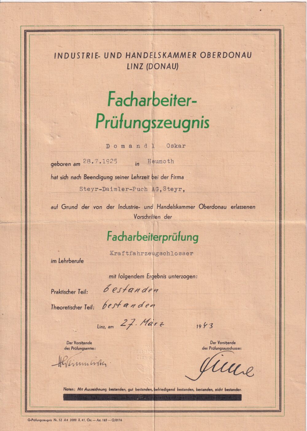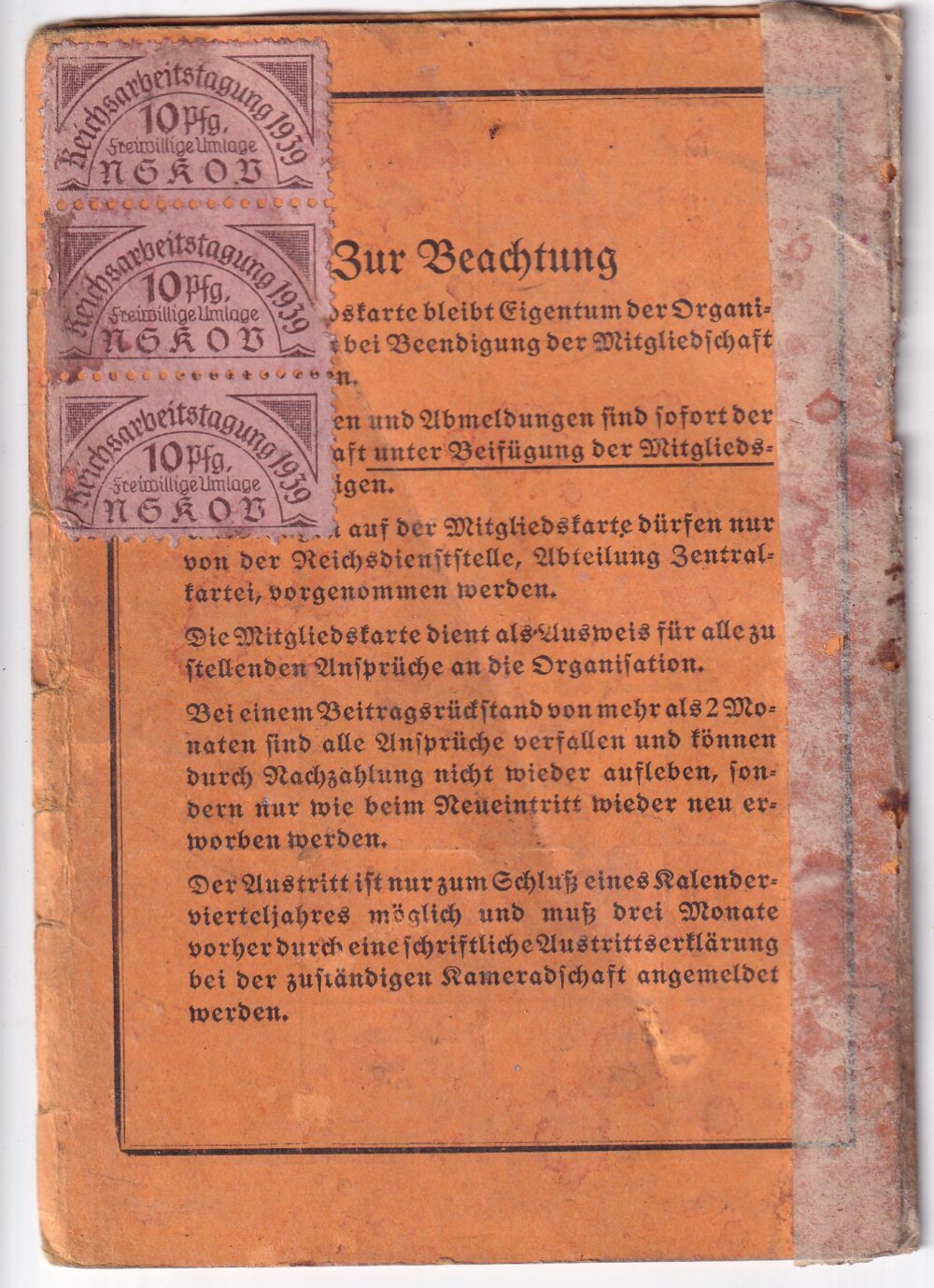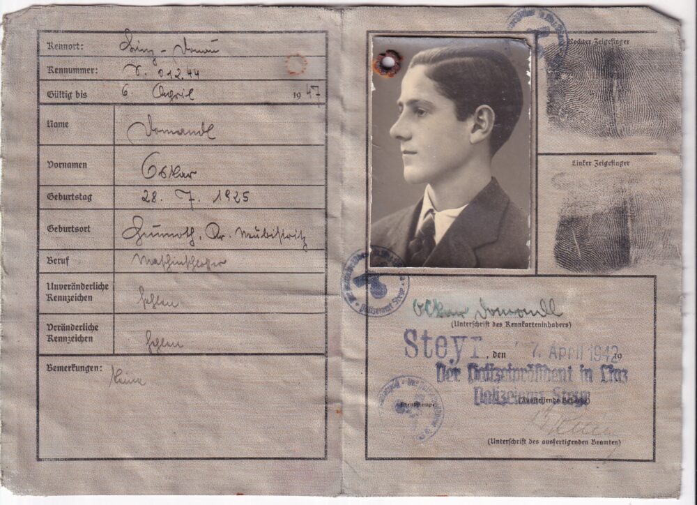 4 (K3-3) Ojedinělý konvolut originálních a sběratelsky hledaných dokumentů a legitimací. Po příslušníkovi Hitler Jugend – Johann Domandl Fleischer, působení v Číměři ( Heumoth ) okres Jindřichův Hradec. Celek obsahuje Členský průkaz, národní socialista. Péče o oběti války. 10,5 cm x 15 cm. 8 stran, známky r.1939 – r.1944. Účet s razítkem, 26.1.1941 21 x 14cm. Negativ vojáka 5 x 6 cm. Obálka + dokument Oberbaumgarten, r. 1940 – Okresní družstvo pro využití hospodářských zvířat pro okres Neu Bistritz-Nová Bystřice a okolí, obálka 16 x 12 cm, dokument 21x 15 cm. Členská průkazka Hitlerova mládež, Berlín 1941, 6 stran, 8 x 12,5 cm. Přijímací autorizační karta pro rozhodčí, po složení zkoušky má nárok na zkoušku na výkonnostní odznak DJ a HJ ve skupině, 17.9.1942, 17 x 12 cm. Letáček Německo vítězí na všech frontách za Evropu!, 22 x 14 cm. Letáček – Absolvování zkoušky odborného pracovníka musí být zaznemenáno v sešitu, 14 x 8 cm. Potvrzení – Obecní sběrný výbor pro sbírku zimních potřeb všeho druhu pro německé vojáky na frontě potvrzuje, že převzal tyto předměty 1.čepička v Krči 12.1.1942, 20,5 x 15 cm. Letáček Polsnitz, válečné Vánoce 1943 – S potěšením Vám mohu předat speciální vánoční dárek v podobě peněžní částky. Zároveň bych Vám chtěl poděkovat za Vaši práci a popřát Vám krásné Vánoce a šťastný nový rok, 15 x 10,5 cm. Reich chlebová karta, platnost od 18.12. 1939 – 14.1.1940, 6,5 x 9 cm. Kniha Hitlerova mládež – Chceme vychovat tvrdou generaci silnou, spolehlivou, loajální, poslušnou a slušnou, abychom se nemuseli stydět za své lidi před historií Adolf Hitler, 10,5 x 14,5 cm 32 stran. Německá říše, průkaz totožnosti, s fotkou, s otisky, razítko, Steyr (Štýr) Rakousko 1942, 3 strany, 10,5 x 15 cm. Obchodní a průmyslová komora Horní Dunaj Linec – Certifikát o zkoušce kvalifikovaného pracovníka – Zámečník motorových vozidel, Linz 27.března 1943, 21 x 30 cm. Státní střední škola pro chlapce – Výroční vysvědčení rok 1938/39, 21 x 30 cm – poškozen.