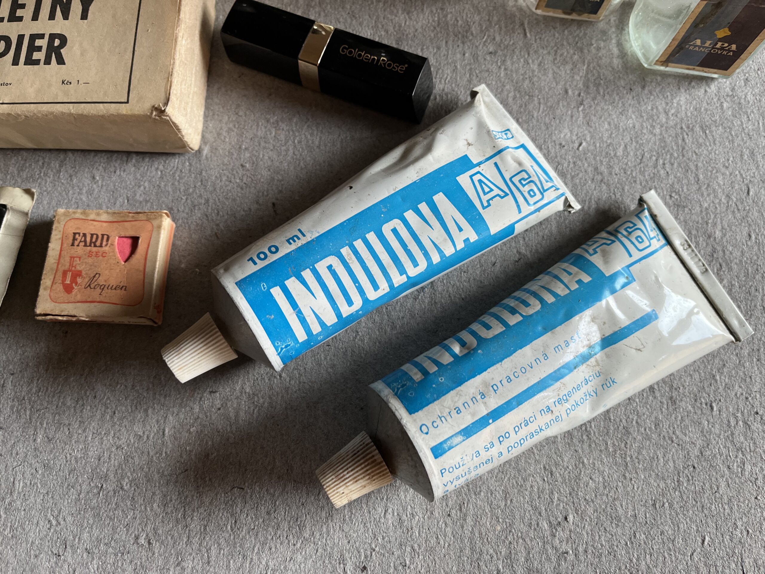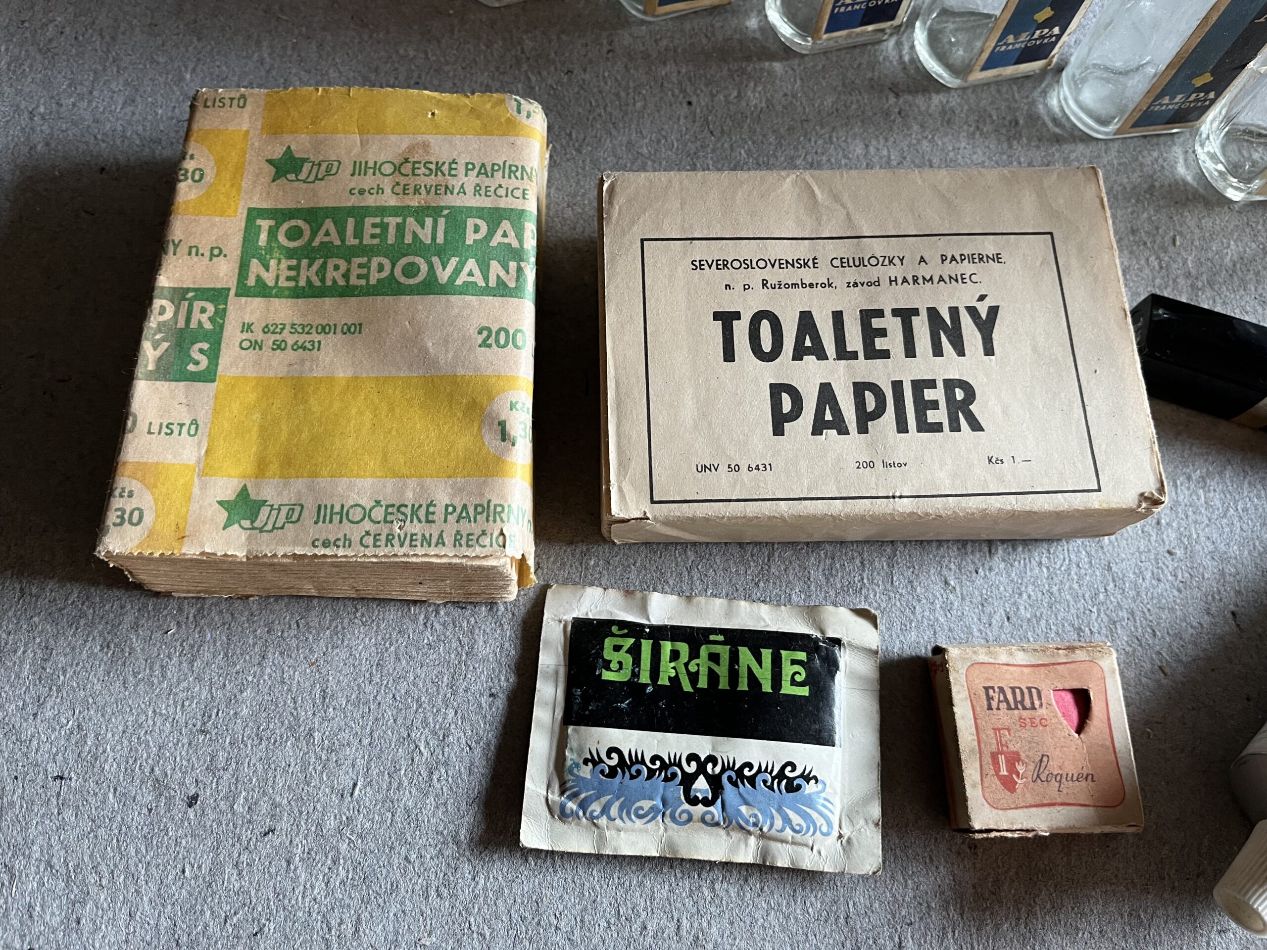 AS-4-e Konvolut obsahuje 1 x suché líčidlo s původním obsahem, Francie z 1.pol.20.století. Toaletní papír nekrepovaný, Jihočeské papírny n.p. cech Červená Řečice, kompletní. Toaletný papier, Severoslovenské celulózky a papierne, n.p. Ružomberok, závod Harmanec, kompletní. Ubrousek Širáne, originálně zabalený. 2 x Indulona, Slovakofarma, n.p. Hlohovec. Rtěnka – Golden Rose. 6 x sklenička – Alpa Francovka, 2 x sklenička – Alpa Francovka bez uzávěru, 1 x sklenička – Lesana, lesní francovka.
