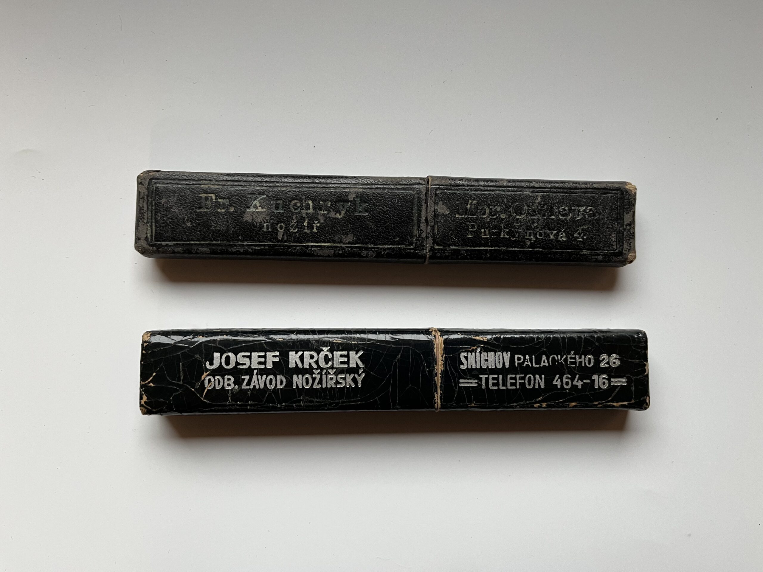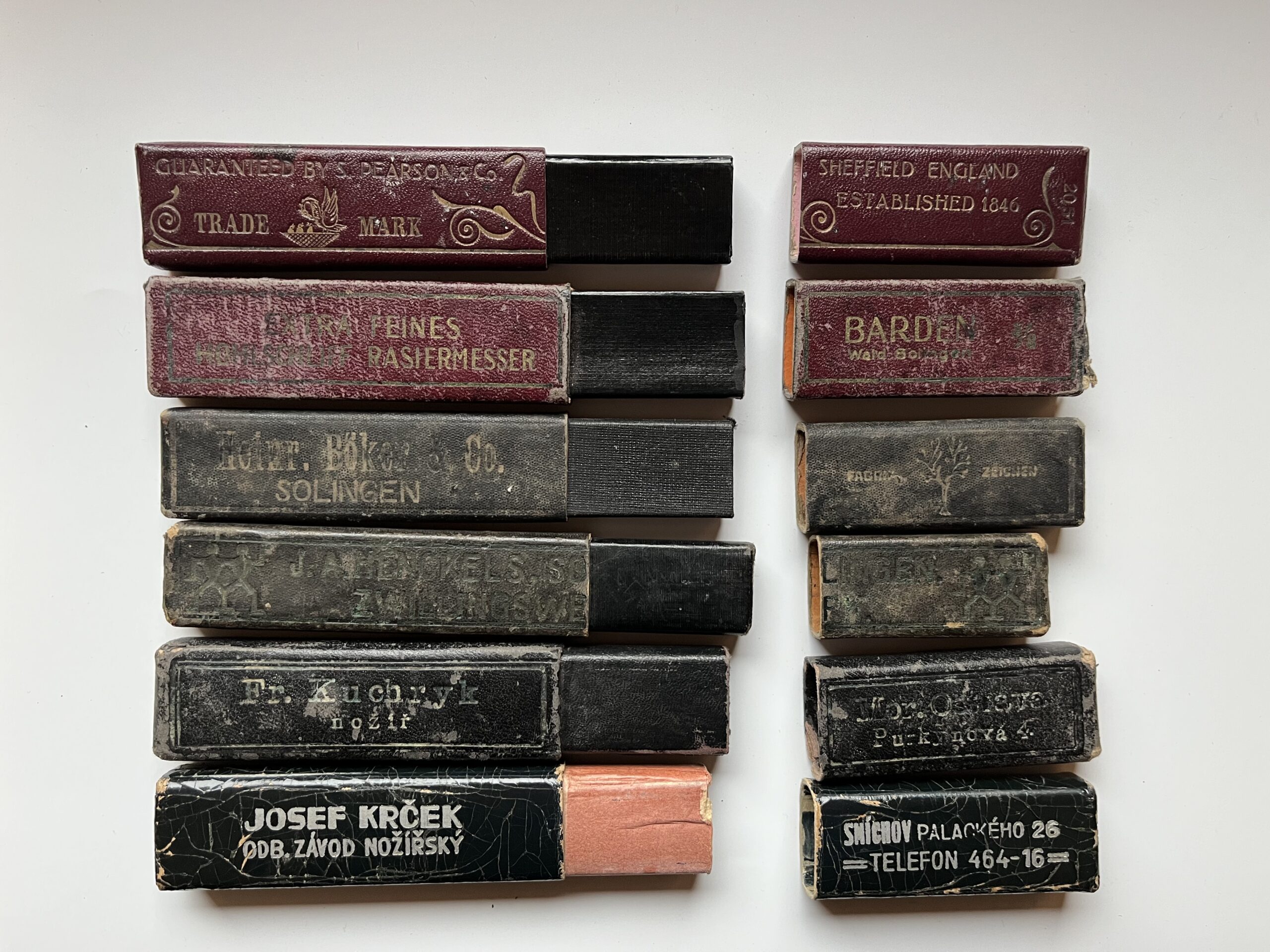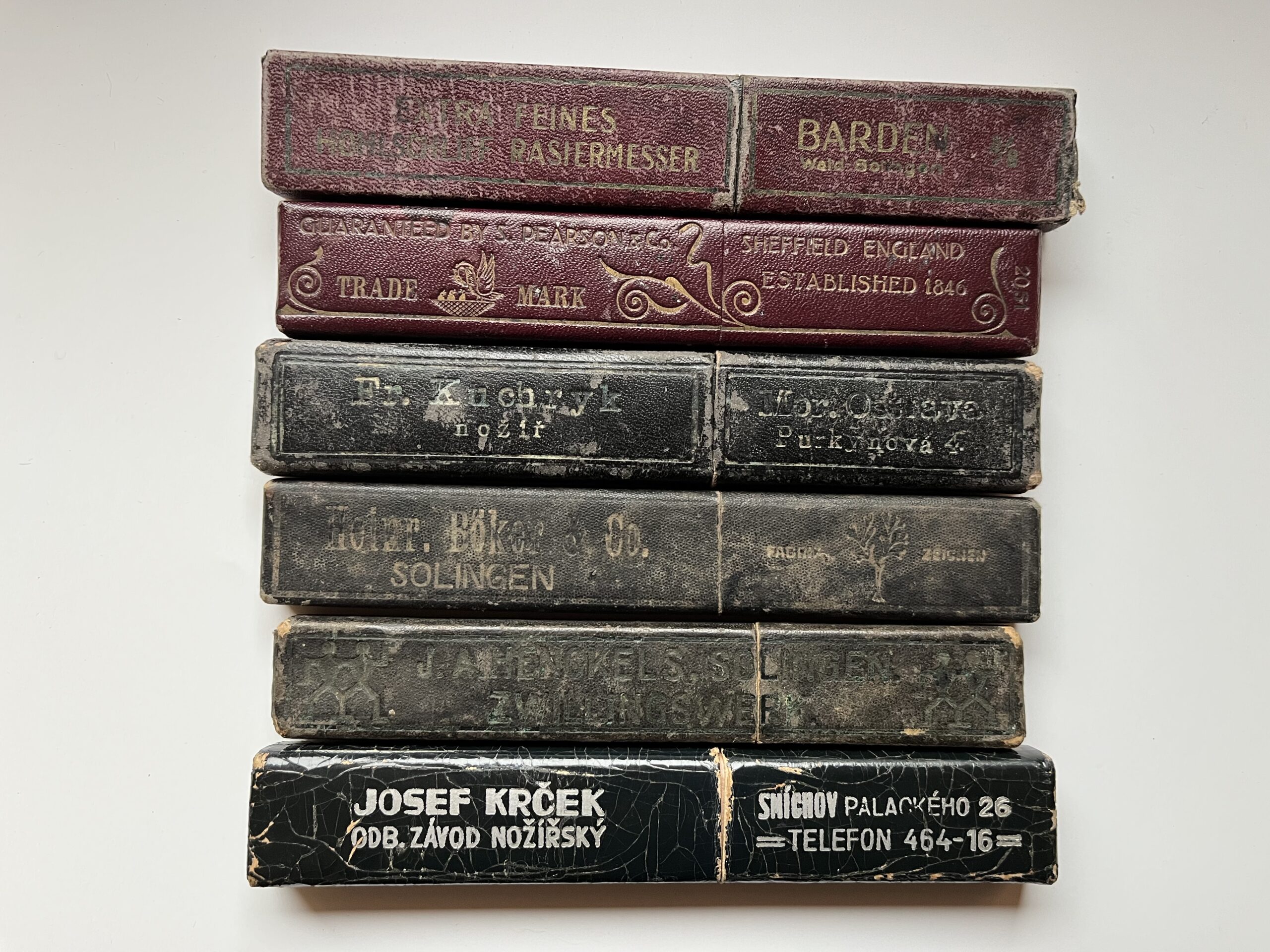 AS-2-c Sbírka 6 kusů pro sběratele starožitných krabiček od břitev různých značek jako Solingen, Josef Krček odb.závod nožířský – Smíchov, Barden, Fr. Kuchryk, nožíř a další.
