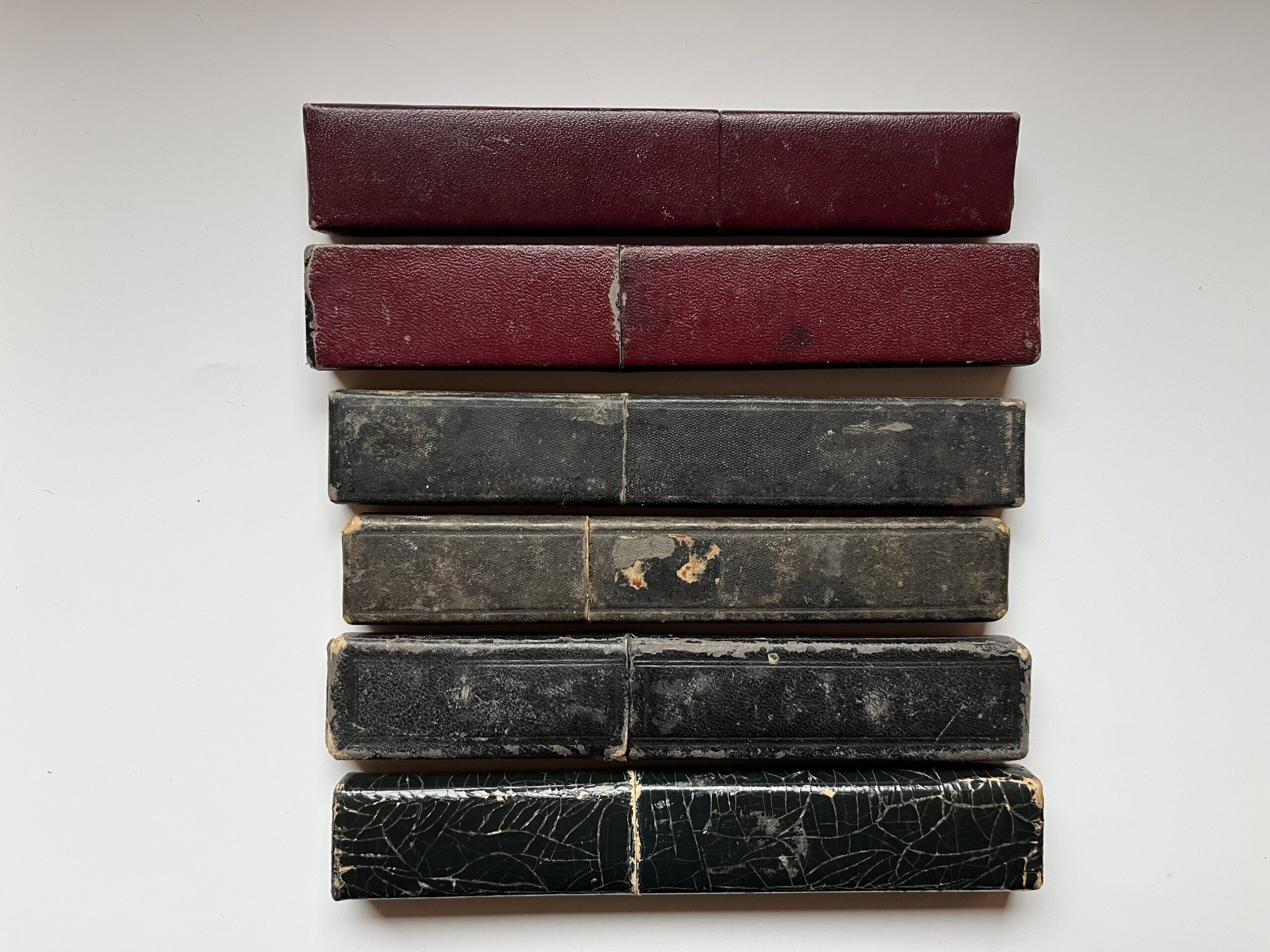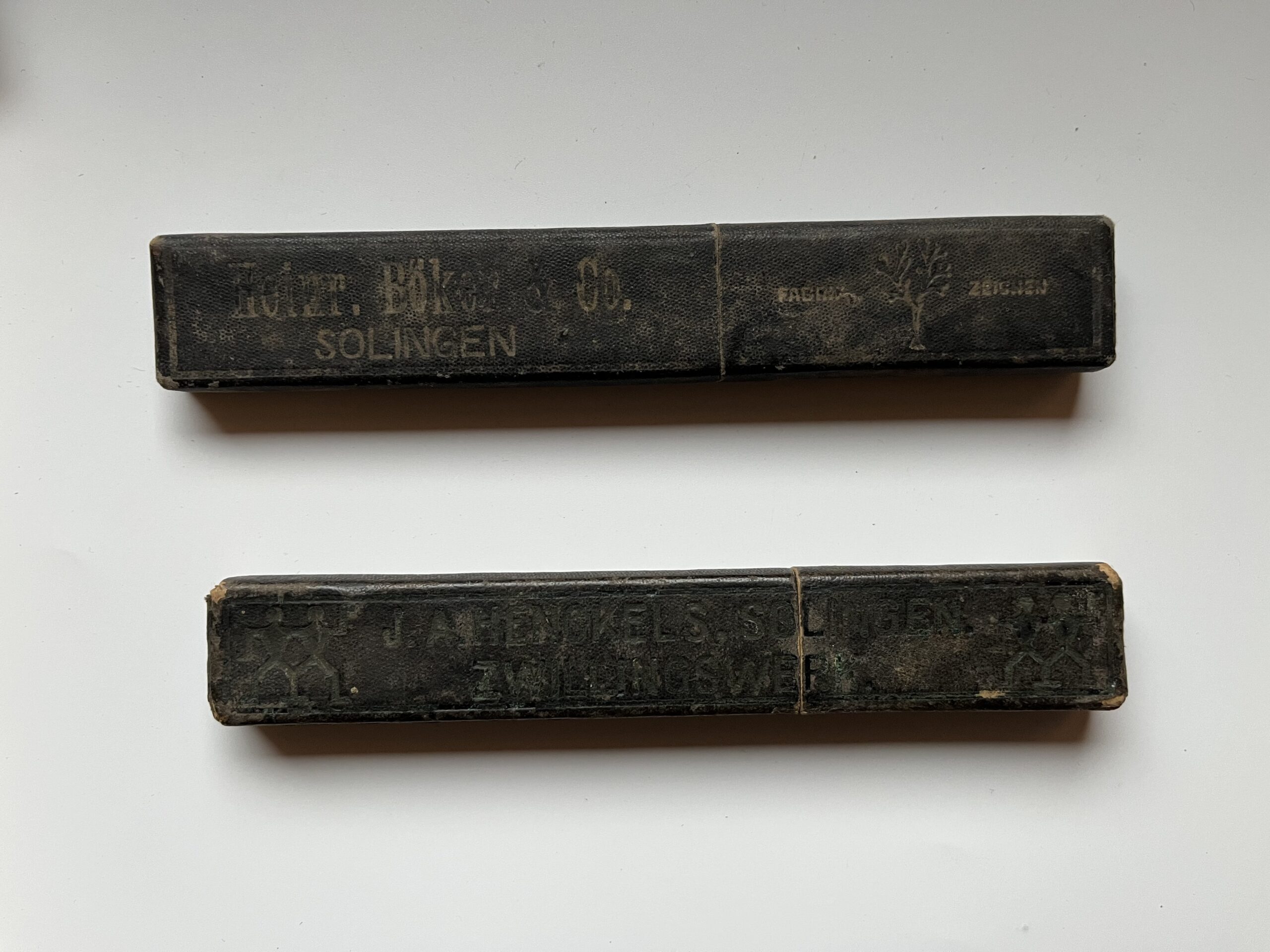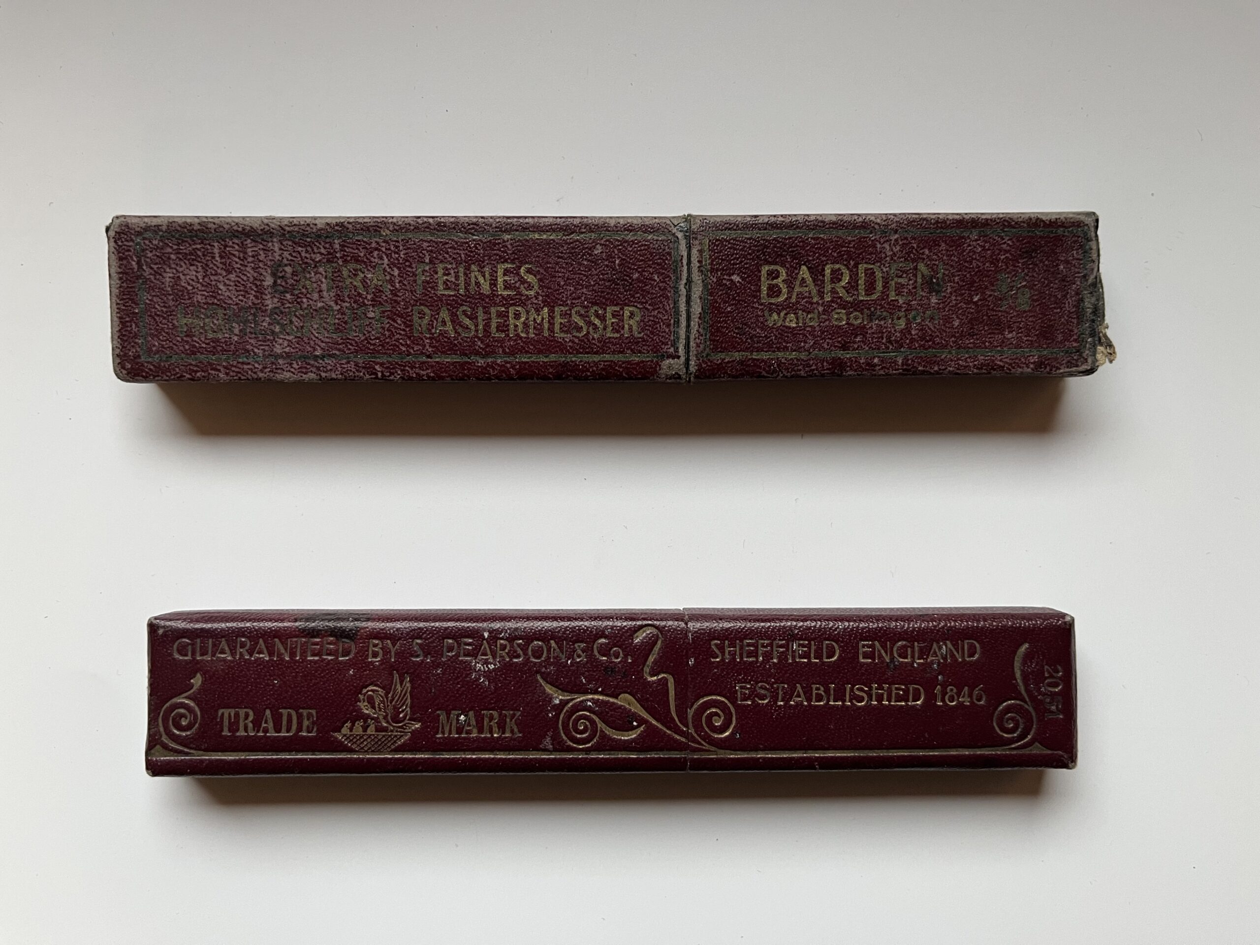 AS-2-c Sbírka 6 kusů pro sběratele starožitných krabiček od břitev různých značek jako Solingen, Josef Krček odb.závod nožířský – Smíchov, Barden, Fr. Kuchryk, nožíř a další.