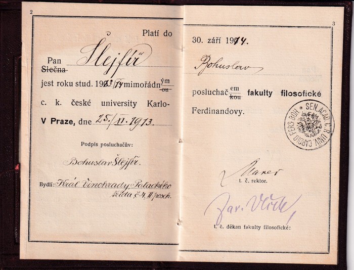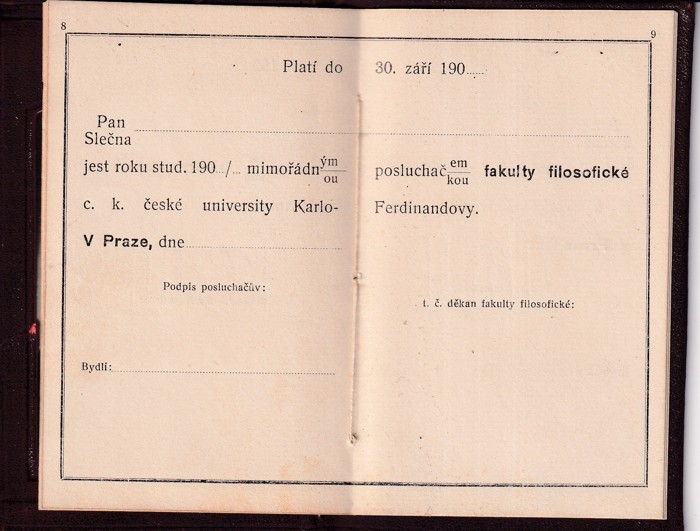 (37) Rozměr 7,5 x 11,5 cm, 15 stran. Posluchač fakulty filosofické c.k. české university Karlo-Ferdinandovy, včetně podpisu rektora a děkana fakulty.