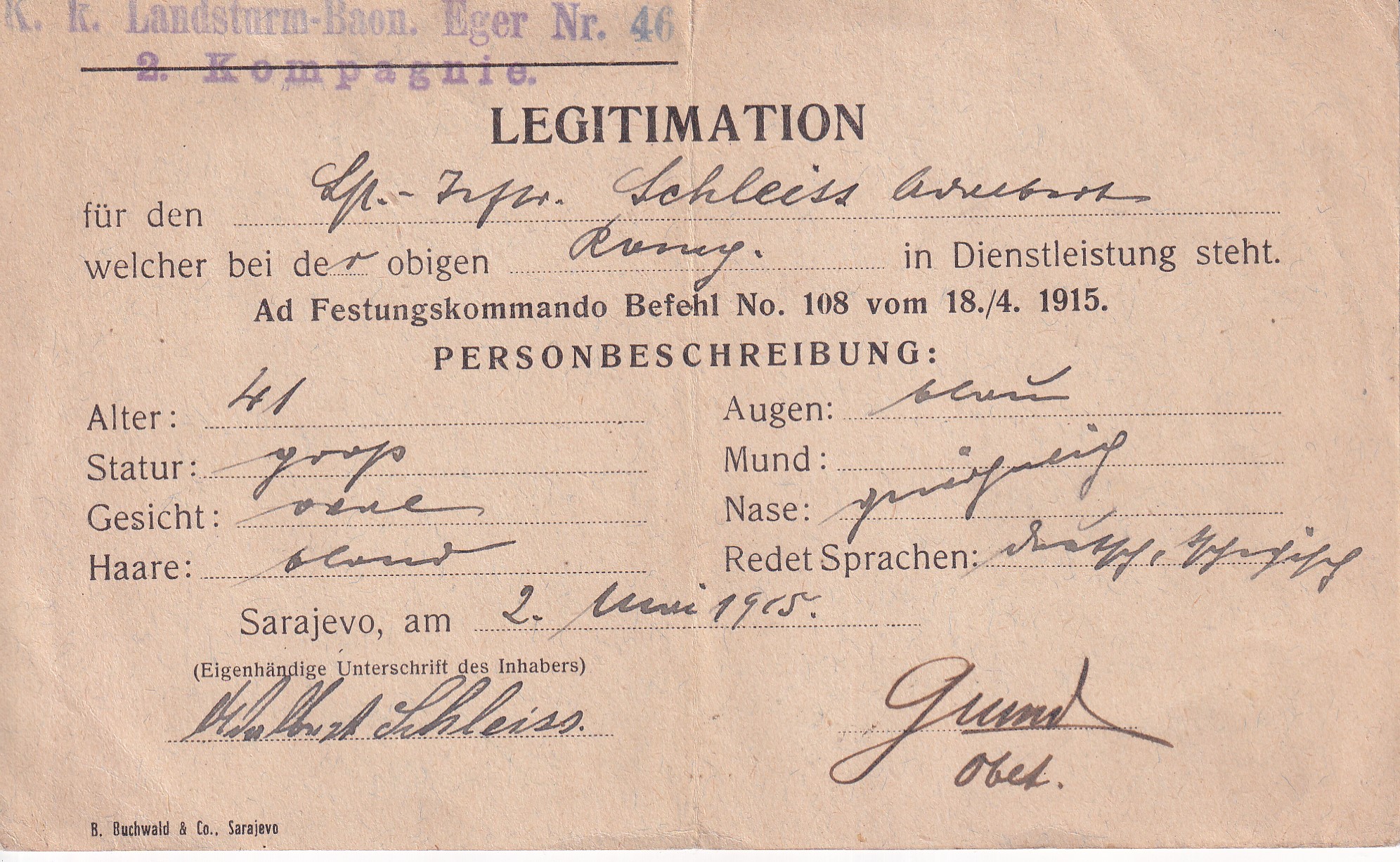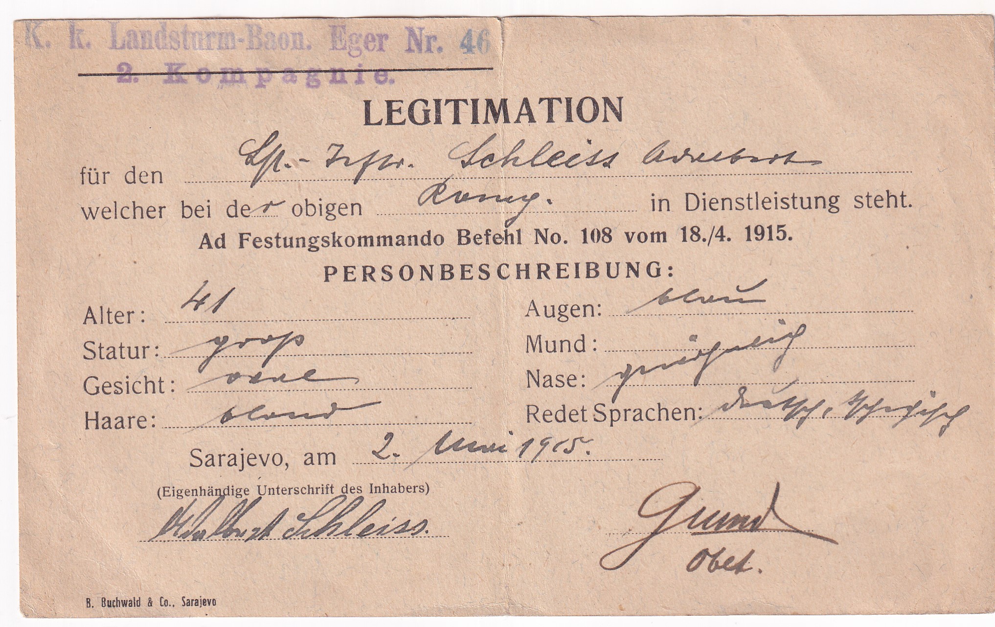 7 (K3-1) Rozměr 17 x 10 cm, legitimace je přeložena. Landsturm-baon Eger nr.46.