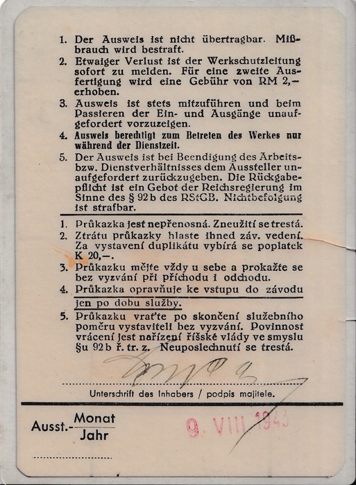 (47) Rozměr 8 x 11 cm. Legitimace protekorát Škodovy závody, Vodňany/Plzeň 1943. Průkaz opravňuje ke vstupu do závodu jen po dobu služby.