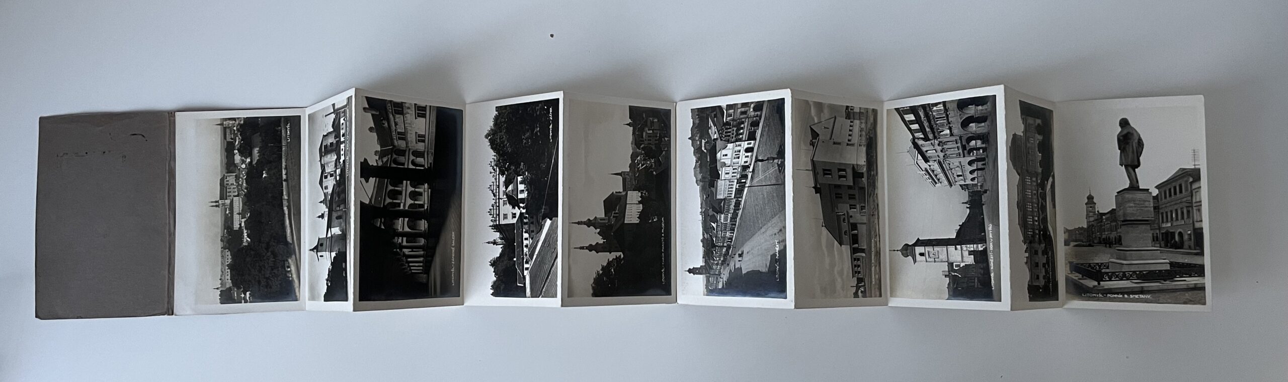 (Leporelo hhu) 10 x snímek, rozměr 9 x 14 cm. Litomyšl, okres Svitavy. Zámecká galerie. Zámek. Náměstí. Smetanův dům. Sokolovna. Náměstí – Dům u Rytířů. Pomník B.Smetany ad.