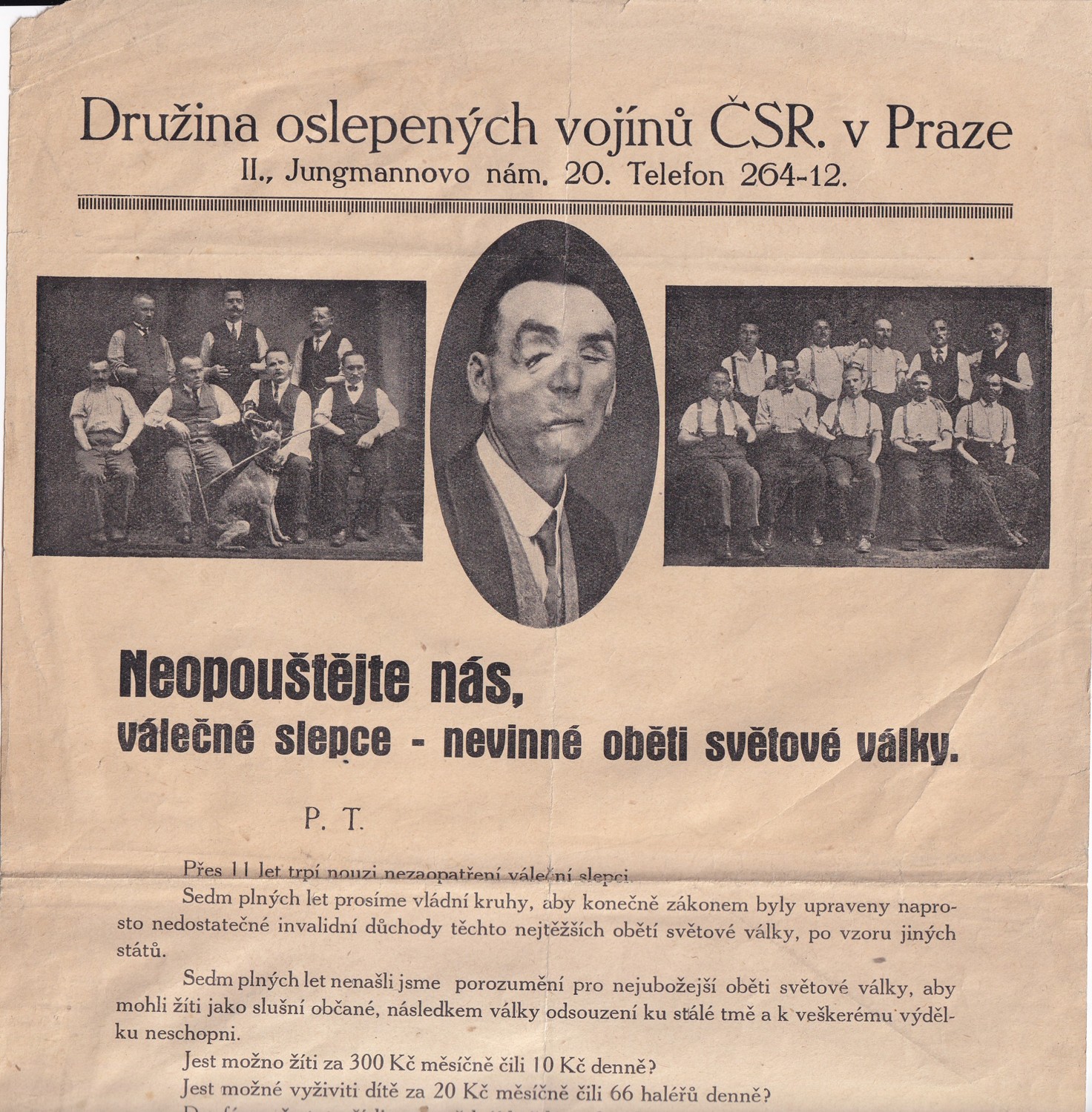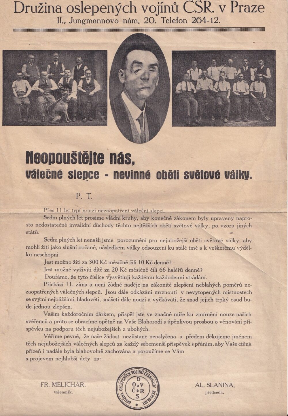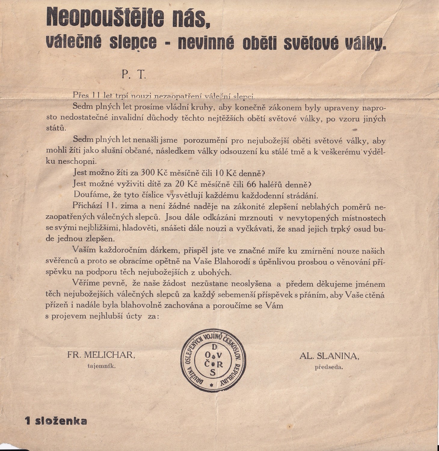 (hhj 58) Rozměr: 21 x 34 cm. Družina oslepených vojínů ČSR. v Praze Neopouštějte nás, válečné slepce – nevinné oběti světové války.