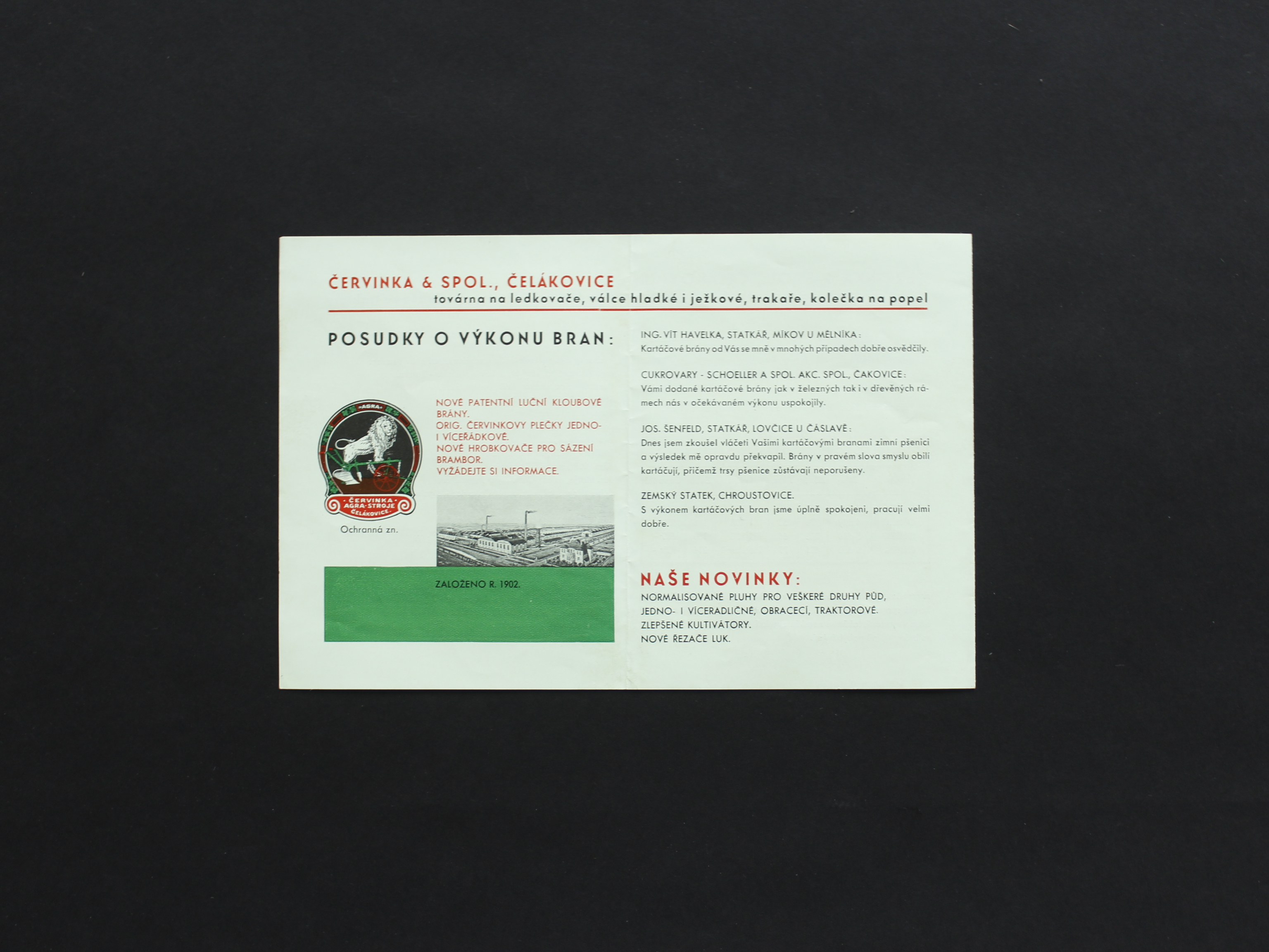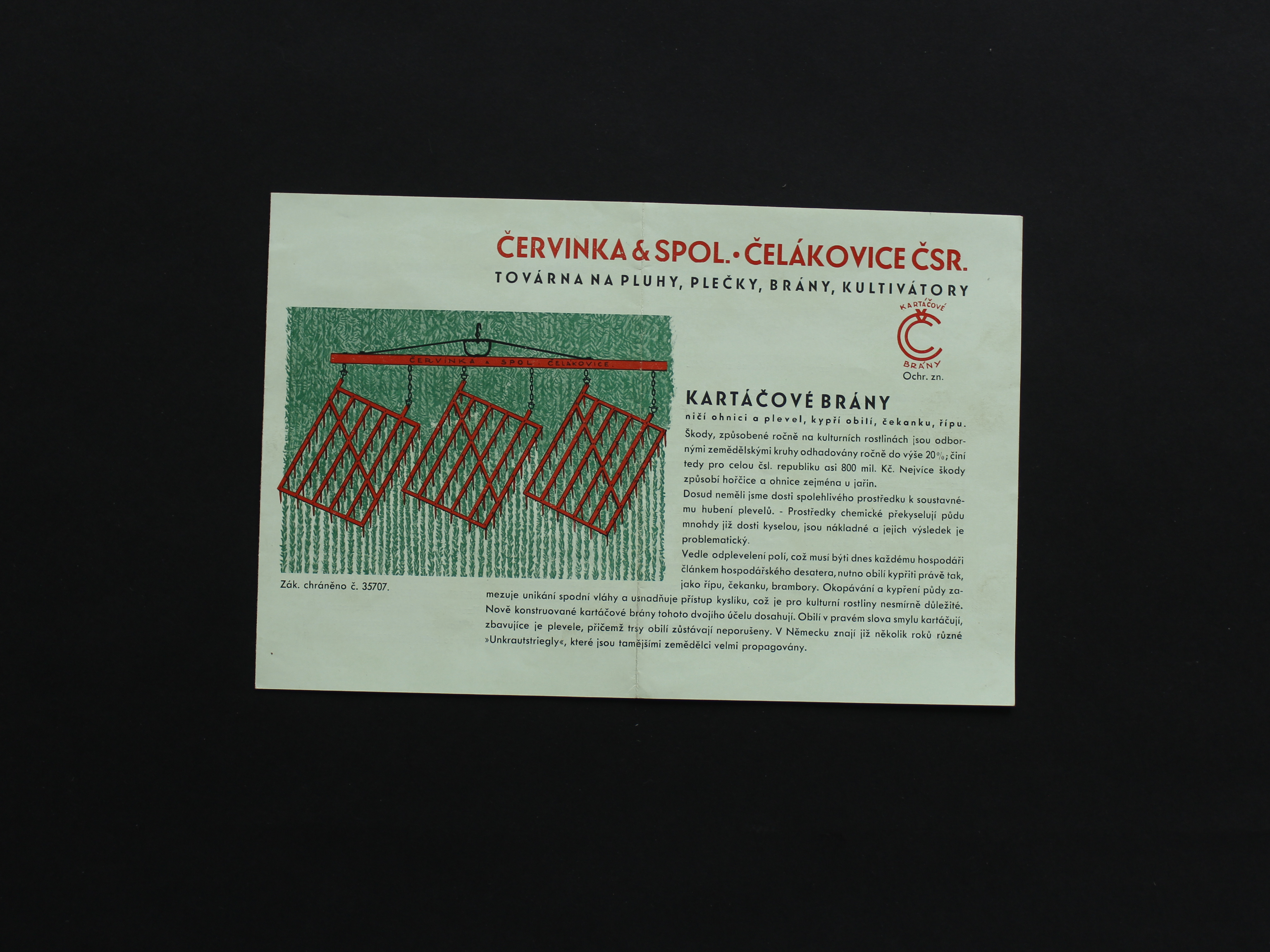 SKU: 9882 Category:Letáky Tags:AAR, Čelakovice, Červinka, kartáčové brány, kultivátory, leták, letáky, místopisné z Česka, okres Praha, plečky, pluhy, první polovina 20století 1900-1945, staré tisky, technické přístroje a elektřina, tisky, továrny, zemědělství a pěstování