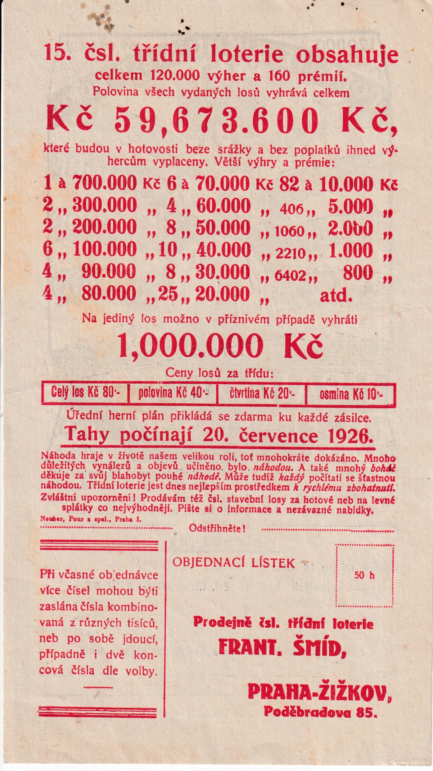 Leták prodejna čsl.třídní loterie F.Šmíd Žižkov, objednávka r.1926 - Obrázek 2