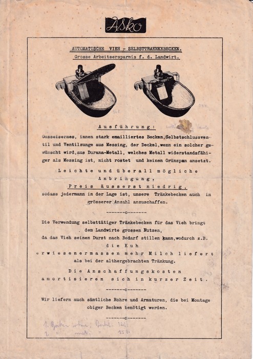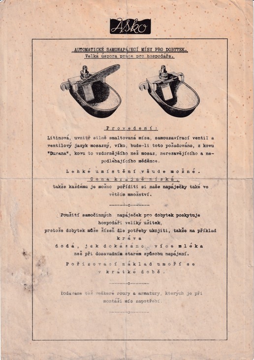 SKU: 9864 Category:Letáky Tags:AAF, Asko, hoposdářství, leták, letáky, místopisné z Česka, napáječky, první polovina 20století 1900-1945, samonapájecí mísa pro dobytek, technické přístroje a elektřina