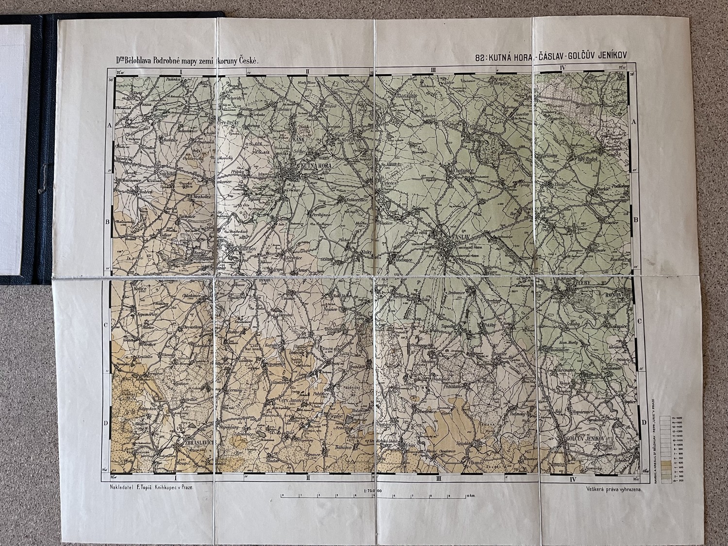 2 (hhb) Rozměr mapy 47 x 39 cm. Příloha K Dra J. Bělohlava „Podrobným mapám zemí Koruny České“ List 82. Kutná Hora – Čáslav – Golčův Jeníkov 21,5 x 19 cm. Mapa je vložena v deskách 13,5 x 20,5 cm. Nakladatel F.Topič.