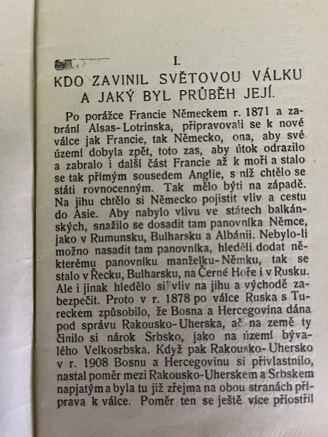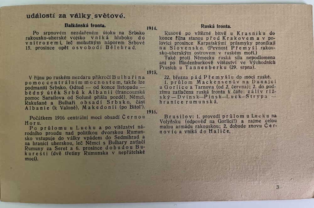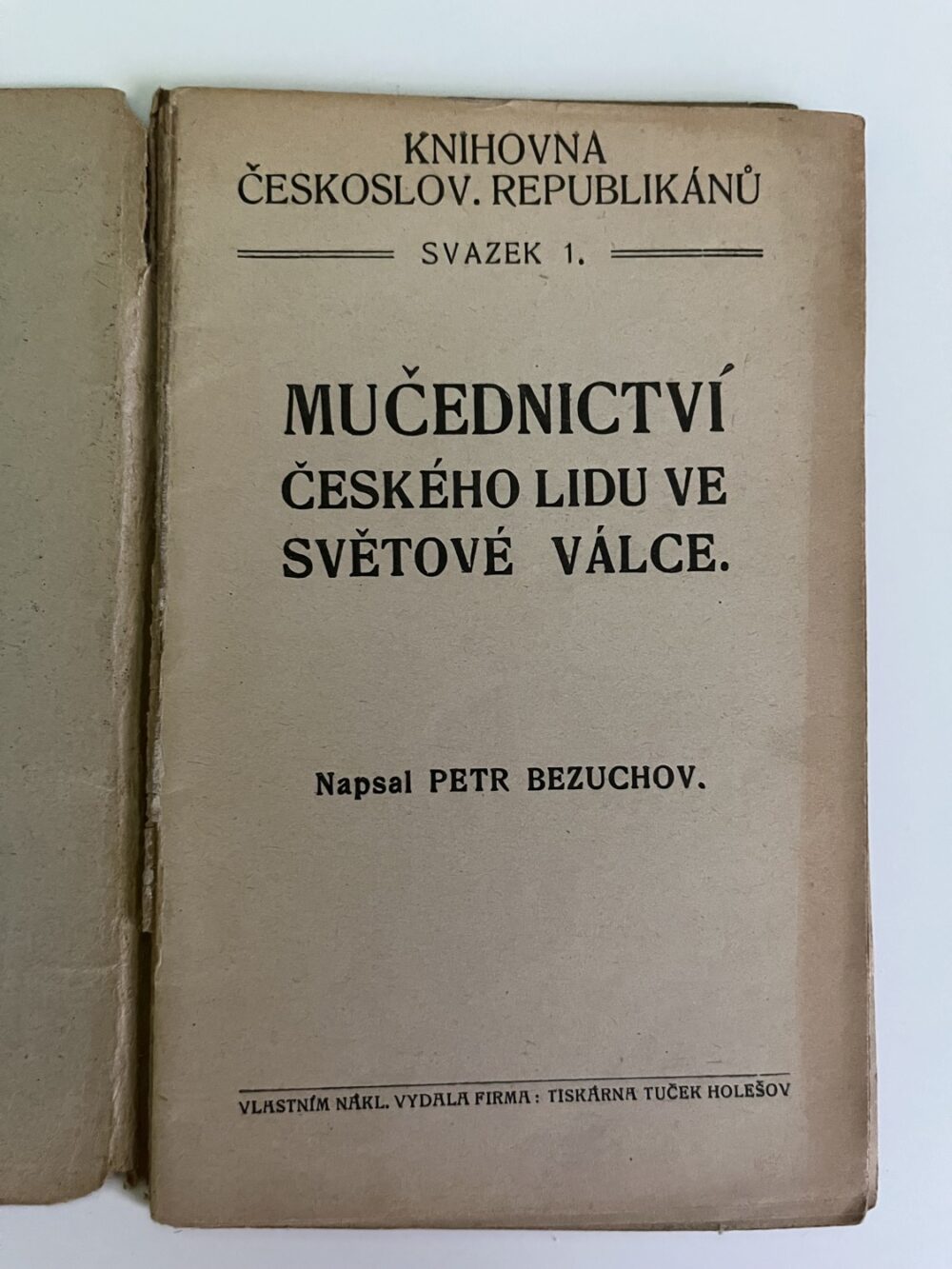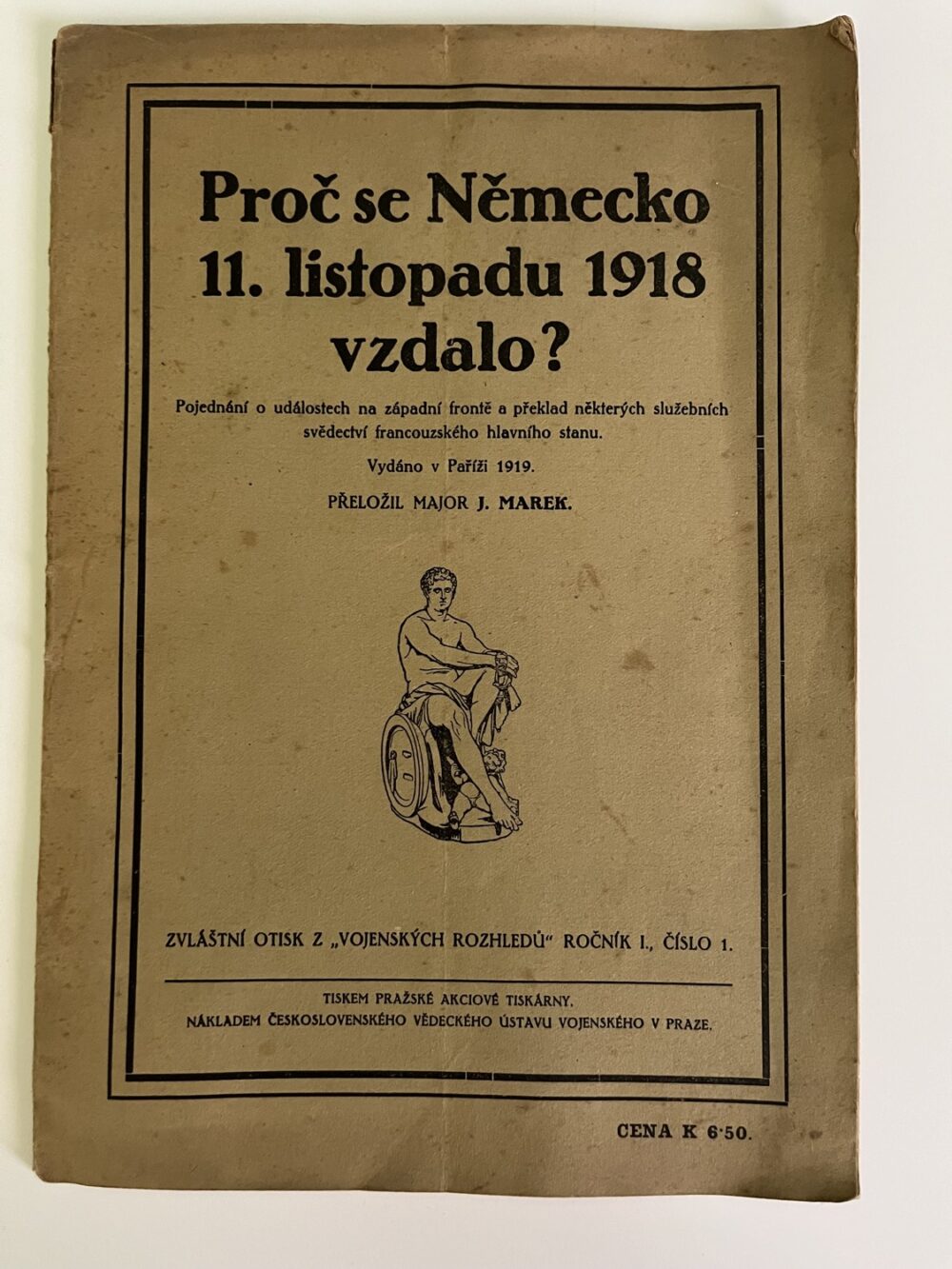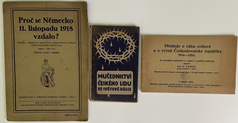 (hhj 17) 3 x kniha. Proč se Německo 11. listopadu 1918 vzdalo? – Pojednání o událostech na západní frontě a překlad některých služebních svědectví franzouzského hlavního stanu, vydáno v Paříži 1919. Přeložil Major J. Marek. Počet stran 24 + 3 x mapka. Mučednictví českého lidu ve světové válce. Knihovna československých republikánů, napsal Petr Bezuchov, vydala firma: tiskárna Tuček Holešov. Počet stran 78 + obsah, vazba uvolněná. Přehledy o válce světové a o vývoji Československé republiky 1914 – 1924. Upravil Ad. E. Vašek gymn.profesor v Brně, 1924. Počet stran 24.