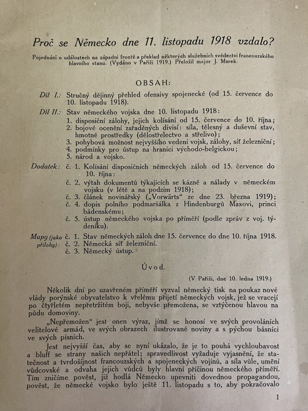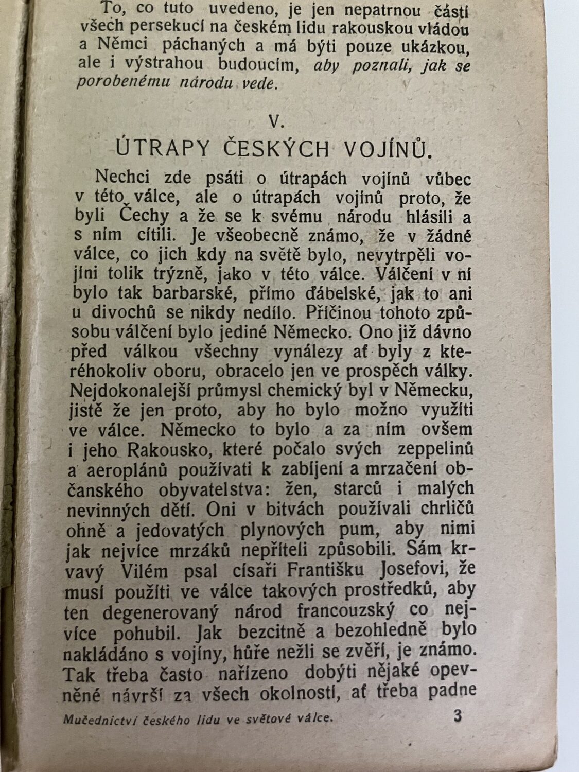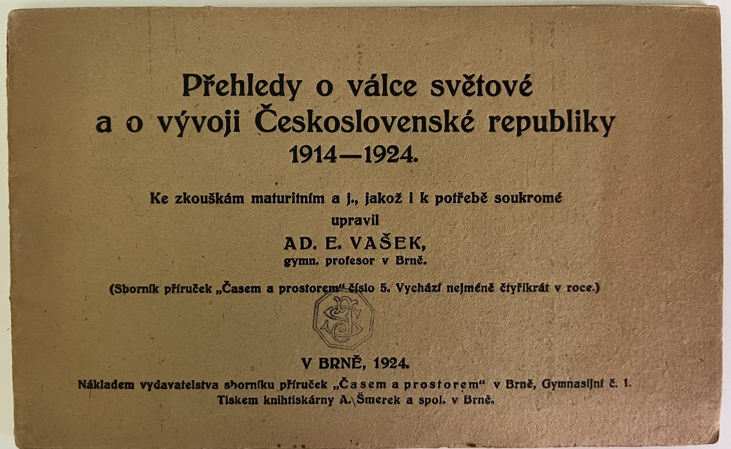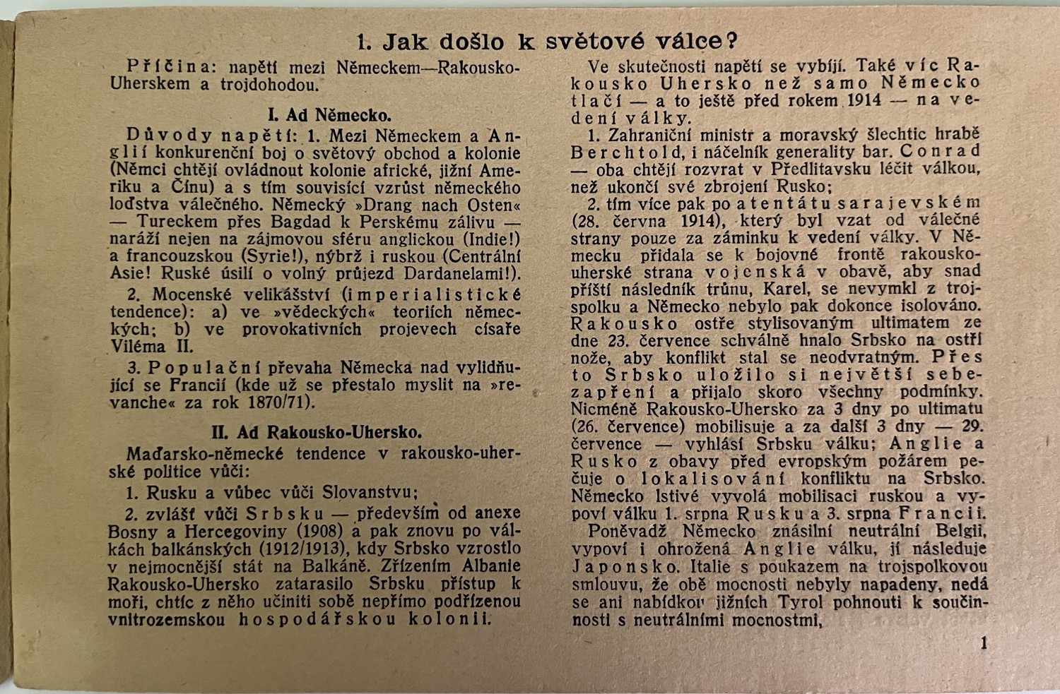 (hhj 17) 3 x kniha. Proč se Německo 11. listopadu 1918 vzdalo? – Pojednání o událostech na západní frontě a překlad některých služebních svědectví franzouzského hlavního stanu, vydáno v Paříži 1919. Přeložil Major J. Marek. Počet stran 24 + 3 x mapka. Mučednictví českého lidu ve světové válce. Knihovna československých republikánů, napsal Petr Bezuchov, vydala firma: tiskárna Tuček Holešov. Počet stran 78 + obsah, vazba uvolněná. Přehledy o válce světové a o vývoji Československé republiky 1914 – 1924. Upravil Ad. E. Vašek gymn.profesor v Brně, 1924. Počet stran 24.