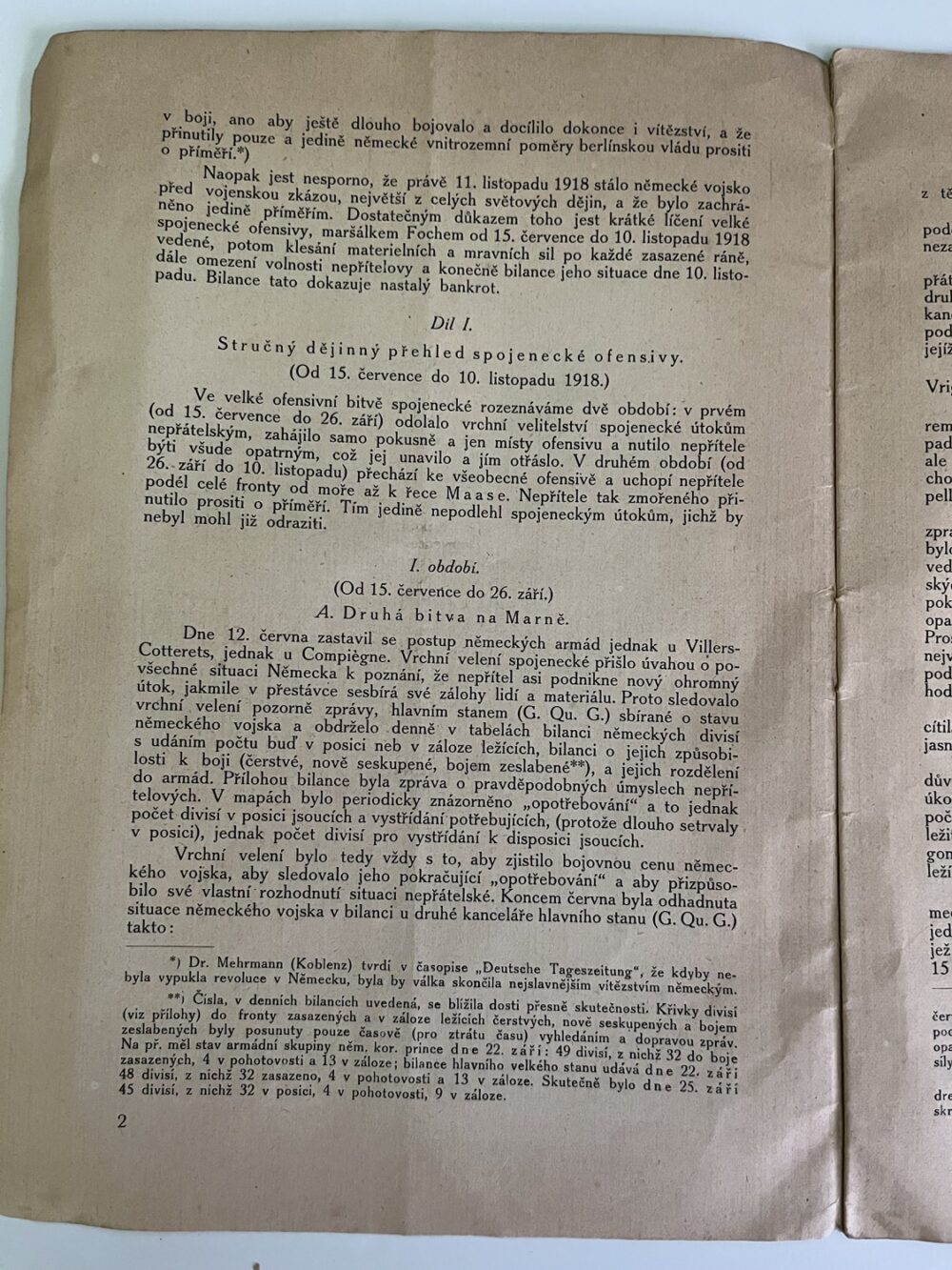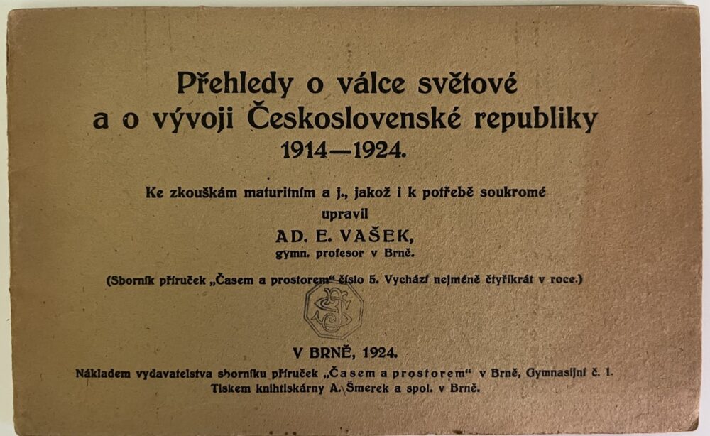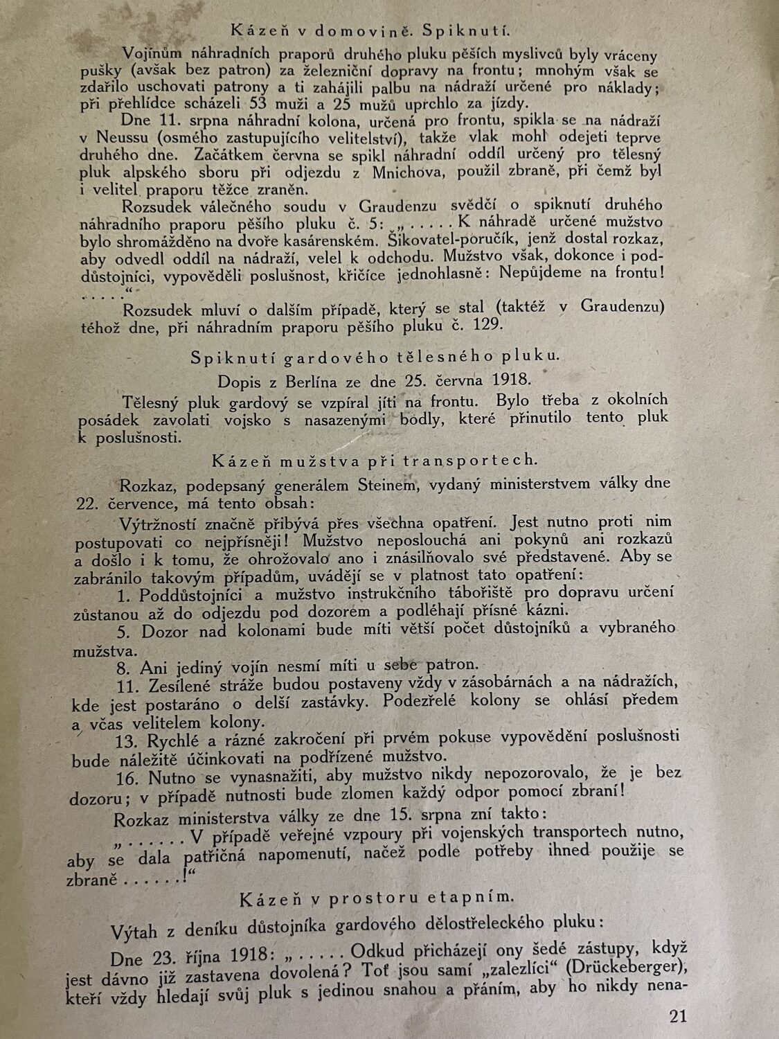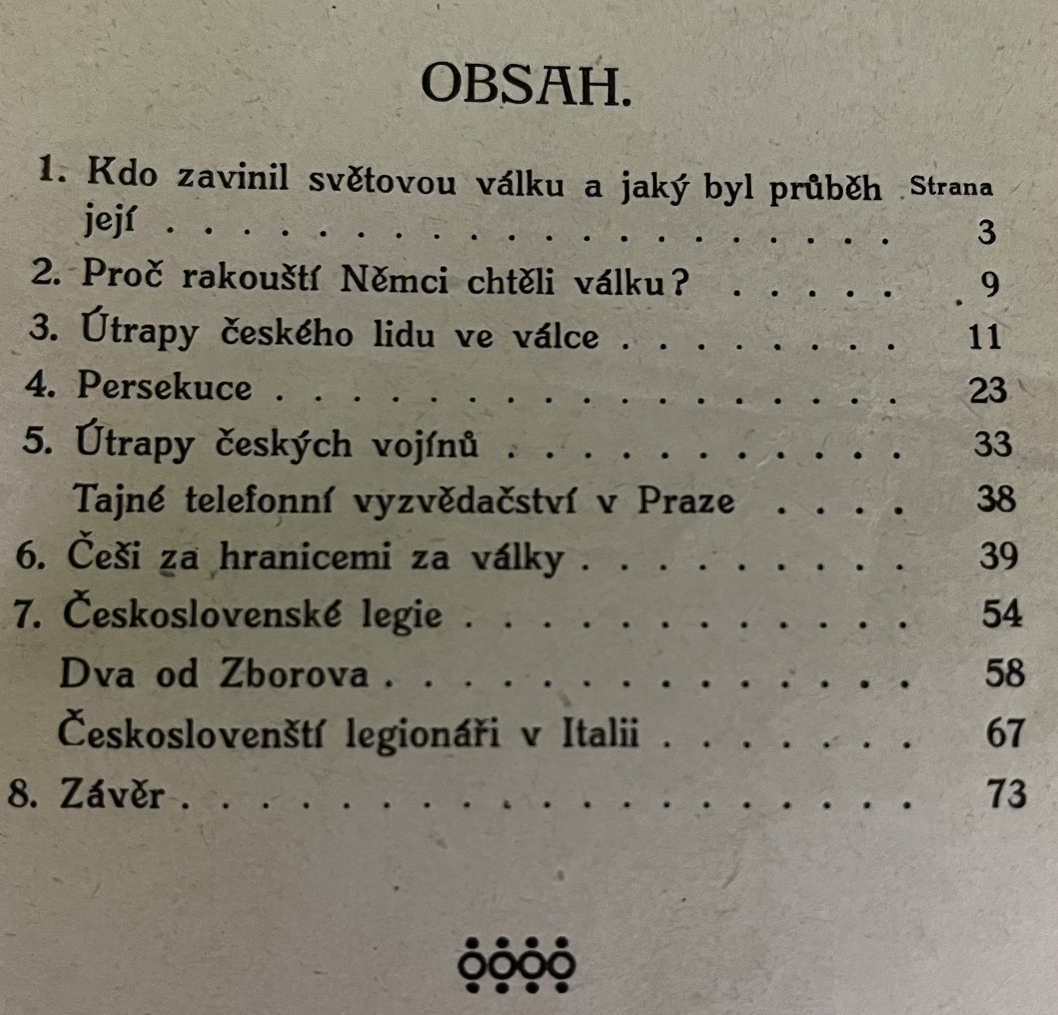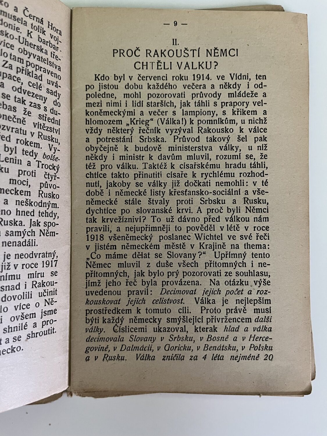(hhj 17) 3 x kniha. Proč se Německo 11. listopadu 1918 vzdalo? – Pojednání o událostech na západní frontě a překlad některých služebních svědectví franzouzského hlavního stanu, vydáno v Paříži 1919. Přeložil Major J. Marek. Počet stran 24 + 3 x mapka. Mučednictví českého lidu ve světové válce. Knihovna československých republikánů, napsal Petr Bezuchov, vydala firma: tiskárna Tuček Holešov. Počet stran 78 + obsah, vazba uvolněná. Přehledy o válce světové a o vývoji Československé republiky 1914 – 1924. Upravil Ad. E. Vašek gymn.profesor v Brně, 1924. Počet stran 24.