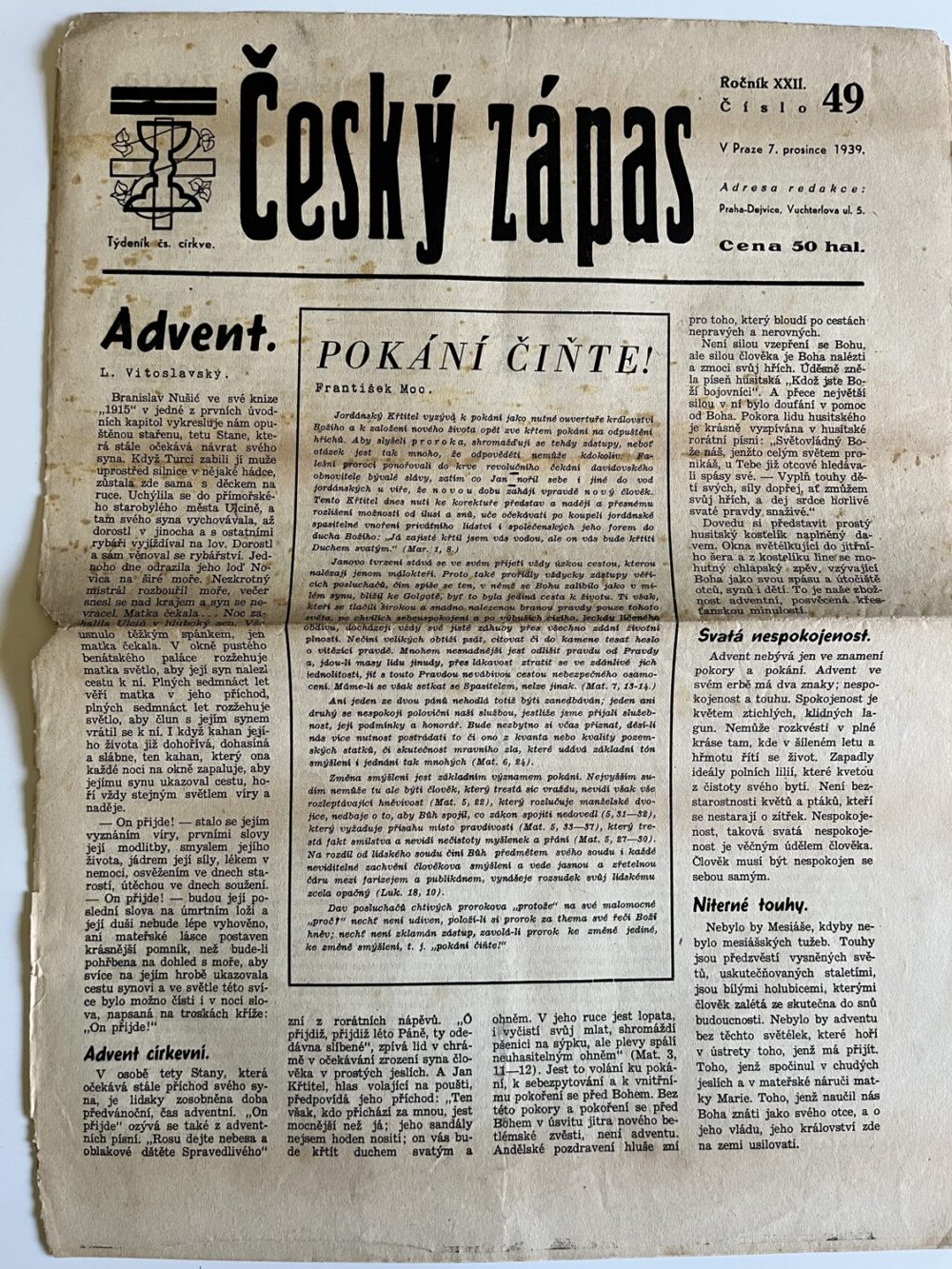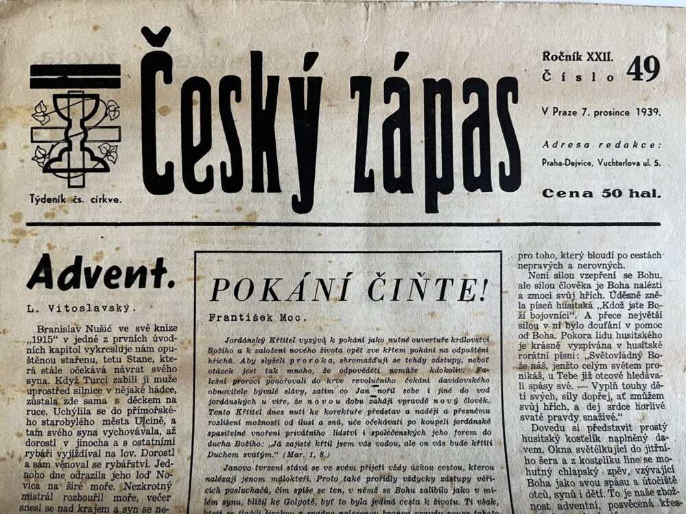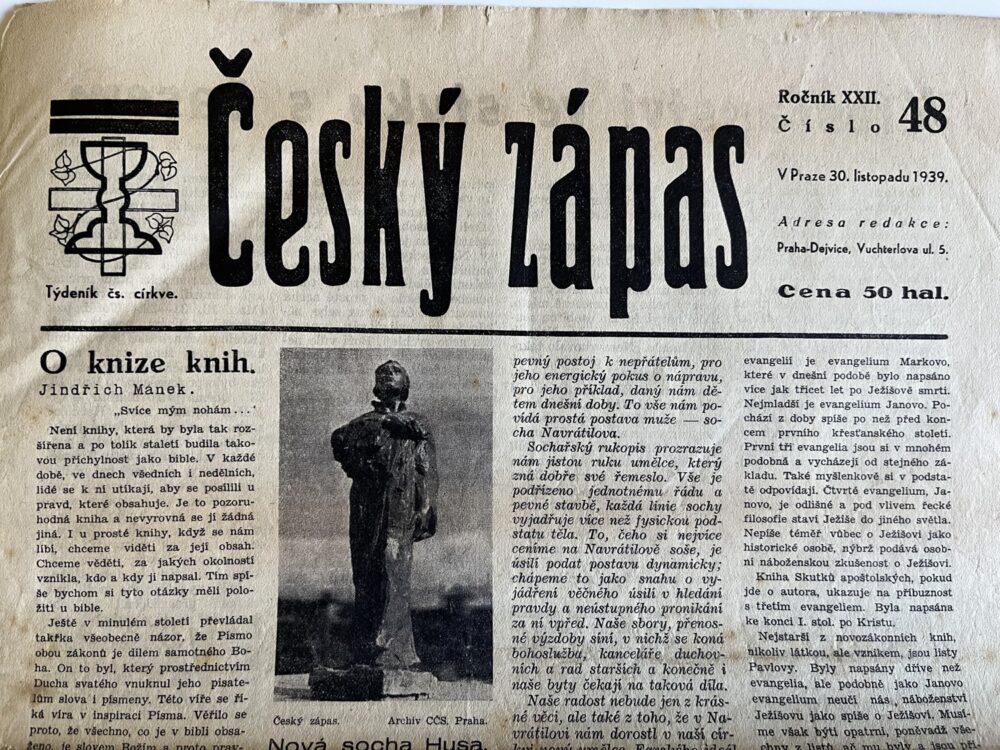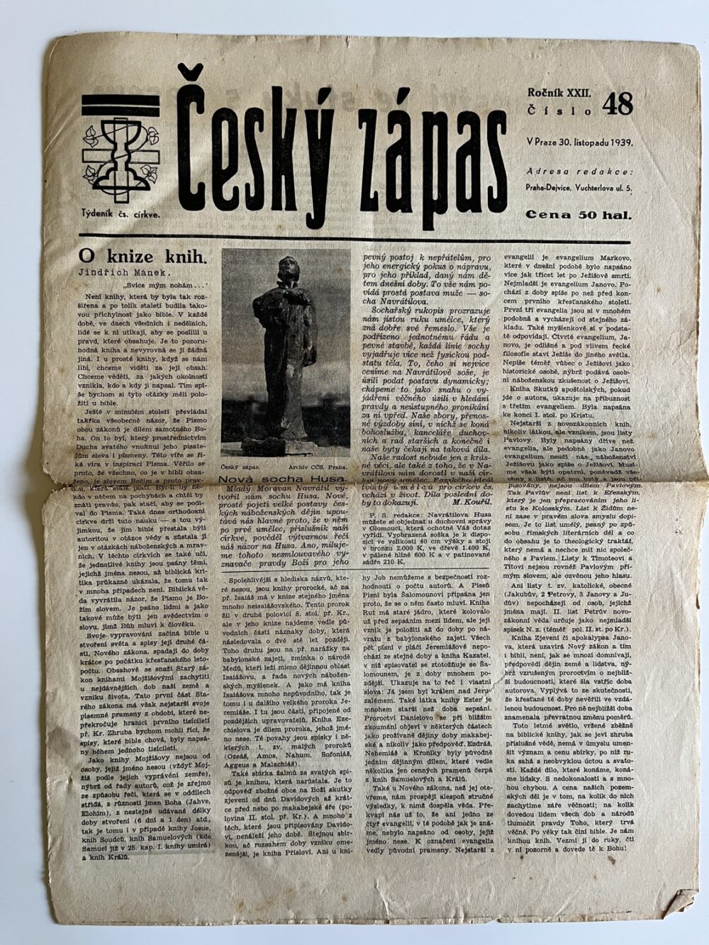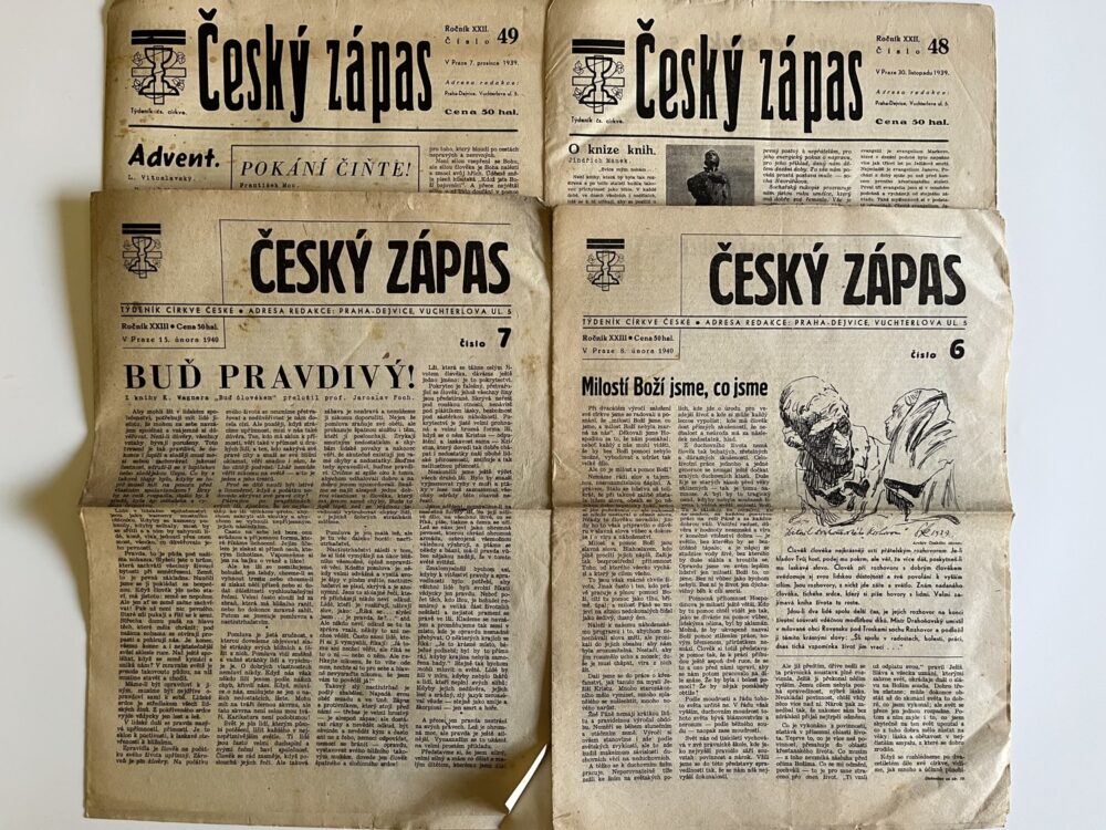 (hhj 24) 4 x Noviny Český zápas, týdeník církve české. 30.listopadu 1939 z obsahu: O knize knih, Jindřich Mánek. Nová socha Husa ad., 8 stran. 7.prosince 1939 z obsahu: Advent. Advent církevní. Niterné touhy. Svatá nespokojenost. Pokání čiňte! František Moc. Duch Kristův – norma křesťanského života ad., 8 stran.8.února 1940 z obsahu: Milostí Boží jsme, co jsme. K shromáždění náboženské obce. V červáncích obrození ad., 8 stran. 15.února 1940 z obsahu: Buď pravdivý! Postavení duchovního úřadu v náboženské obci. Josef Dobrovský v lidové tradici. O křesťanské osobnosti ad., 8 stran.
