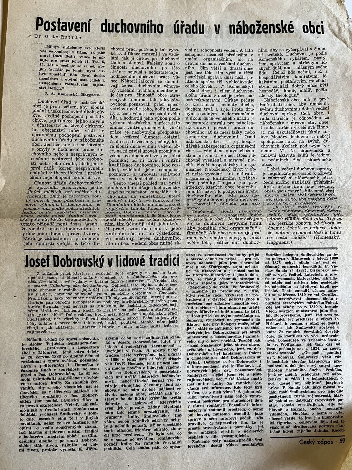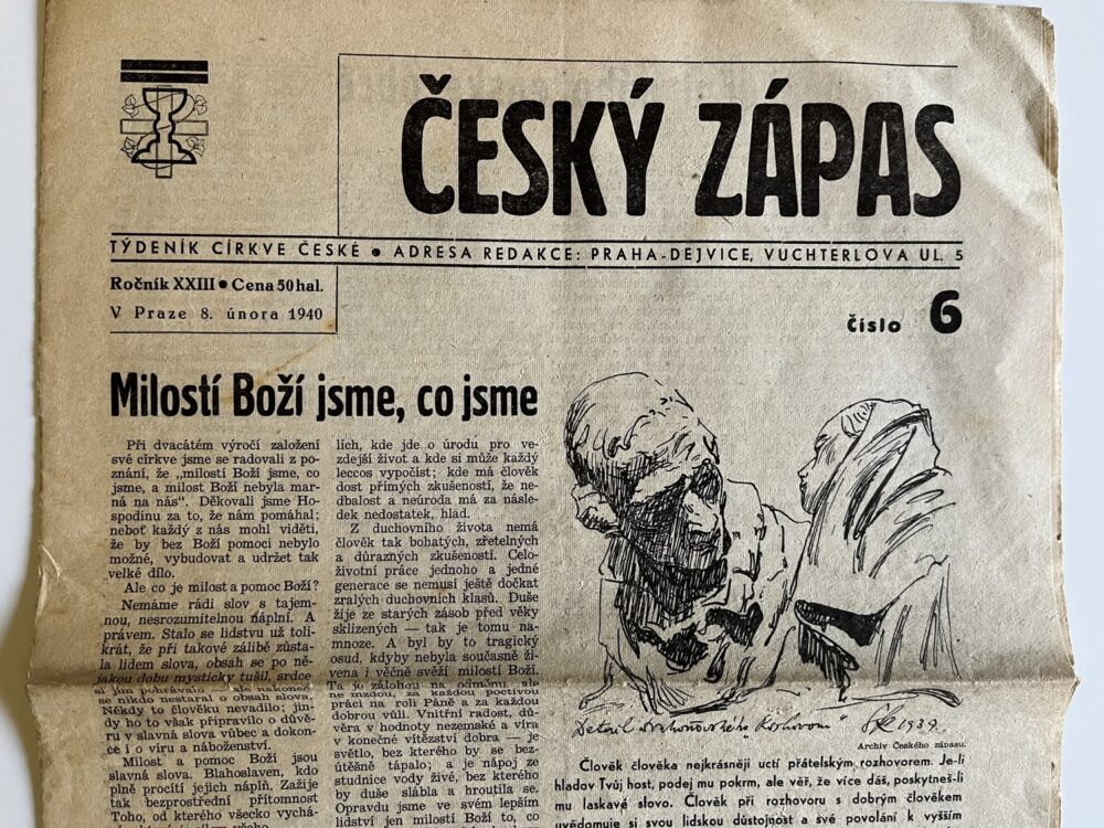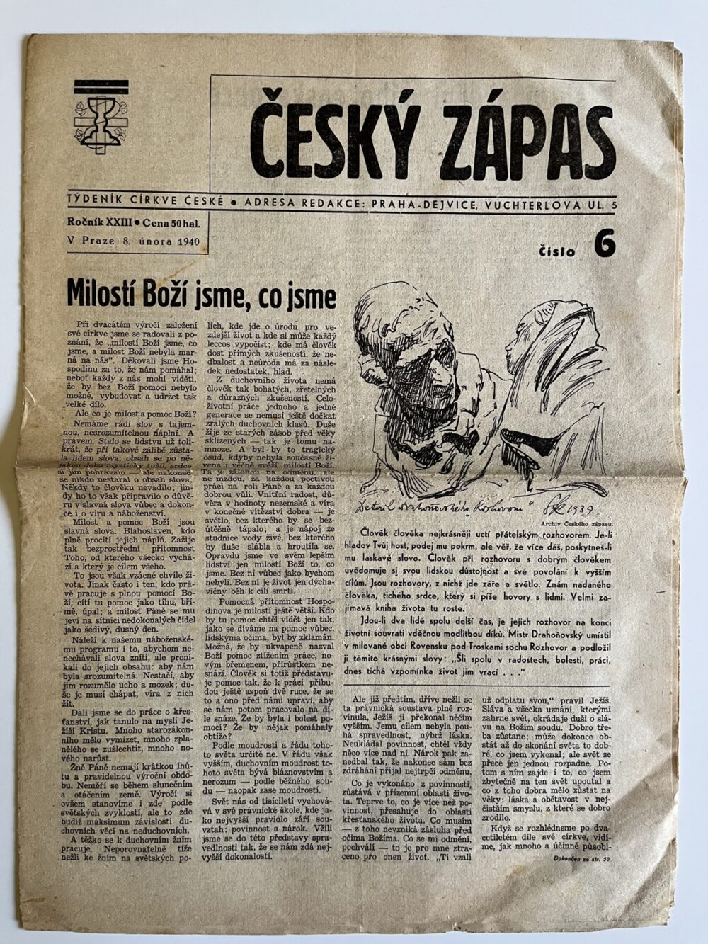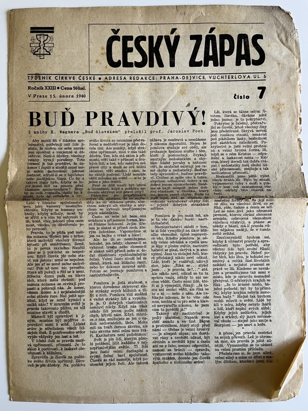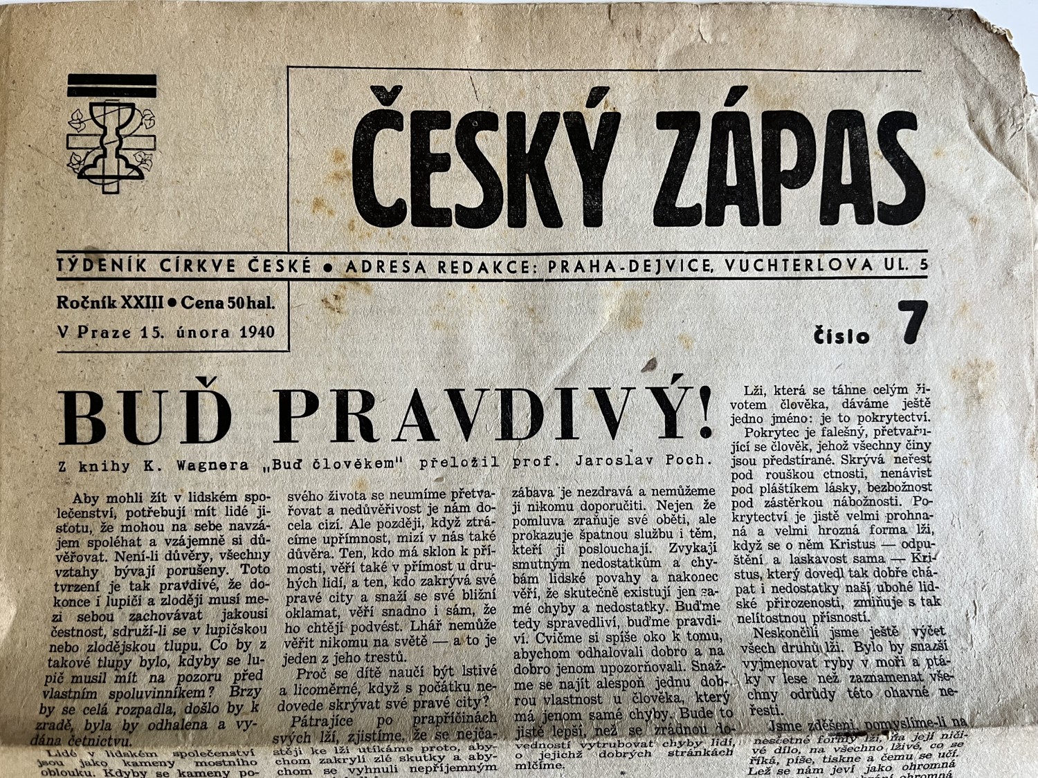 (hhj 24) 4 x Noviny Český zápas, týdeník církve české. 30.listopadu 1939 z obsahu: O knize knih, Jindřich Mánek. Nová socha Husa ad., 8 stran. 7.prosince 1939 z obsahu: Advent. Advent církevní. Niterné touhy. Svatá nespokojenost. Pokání čiňte! František Moc. Duch Kristův – norma křesťanského života ad., 8 stran.8.února 1940 z obsahu: Milostí Boží jsme, co jsme. K shromáždění náboženské obce. V červáncích obrození ad., 8 stran. 15.února 1940 z obsahu: Buď pravdivý! Postavení duchovního úřadu v náboženské obci. Josef Dobrovský v lidové tradici. O křesťanské osobnosti ad., 8 stran.