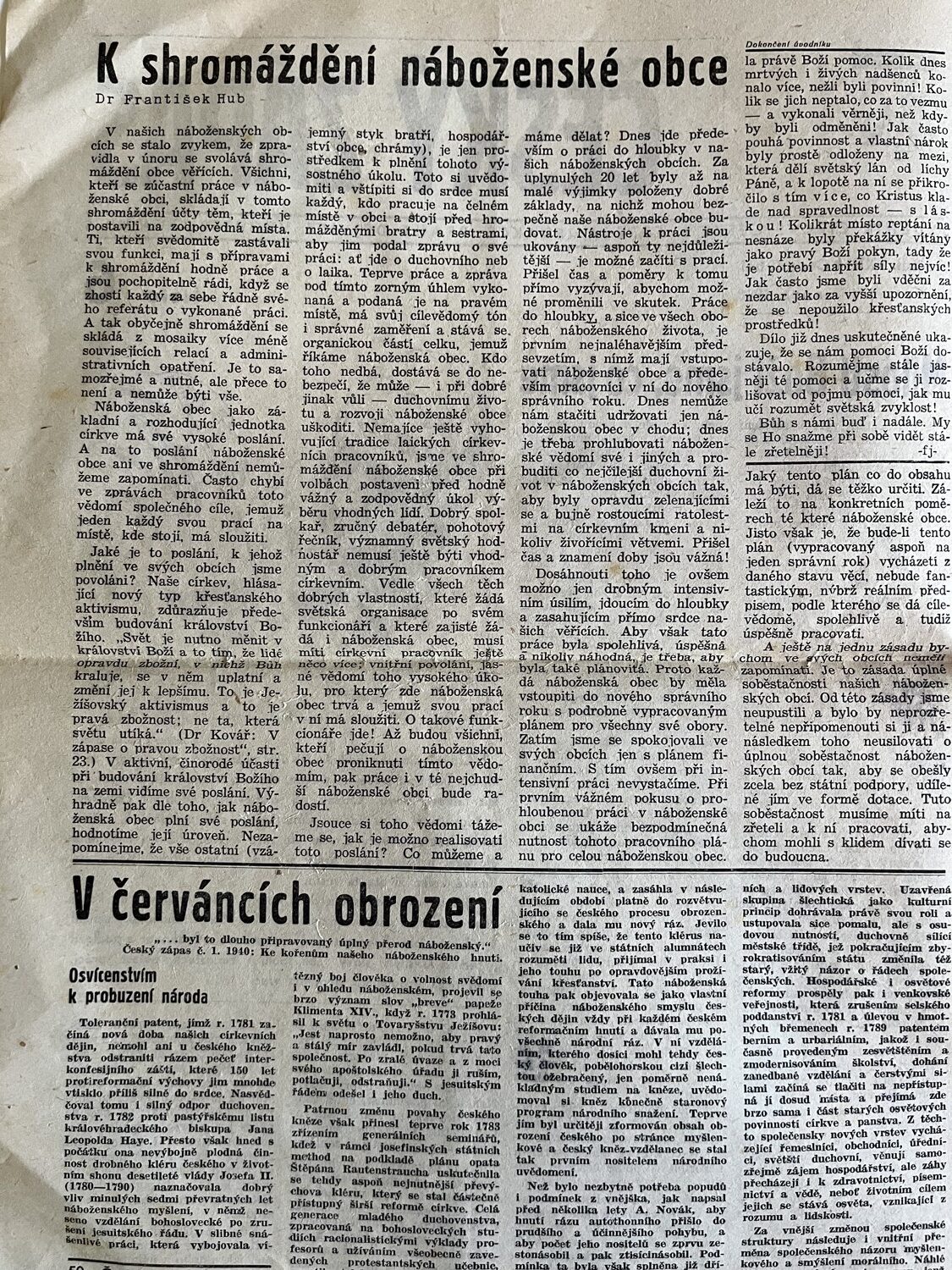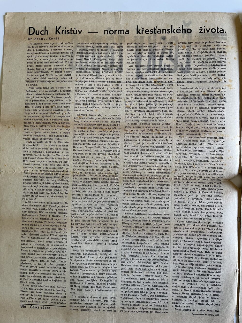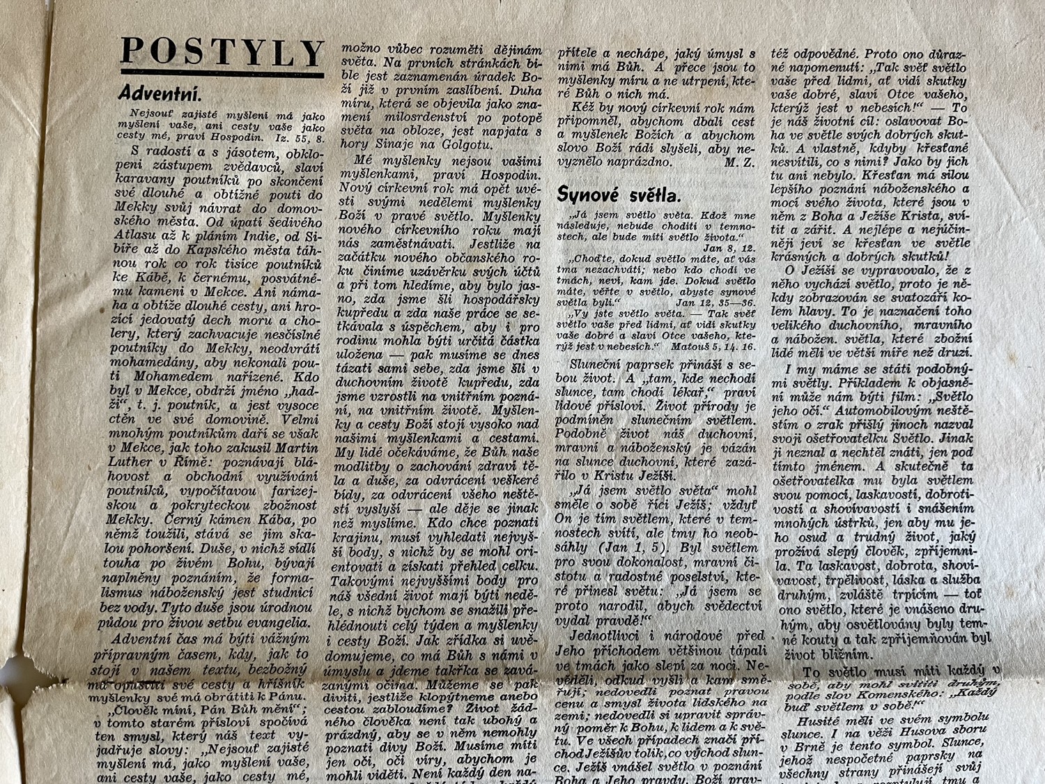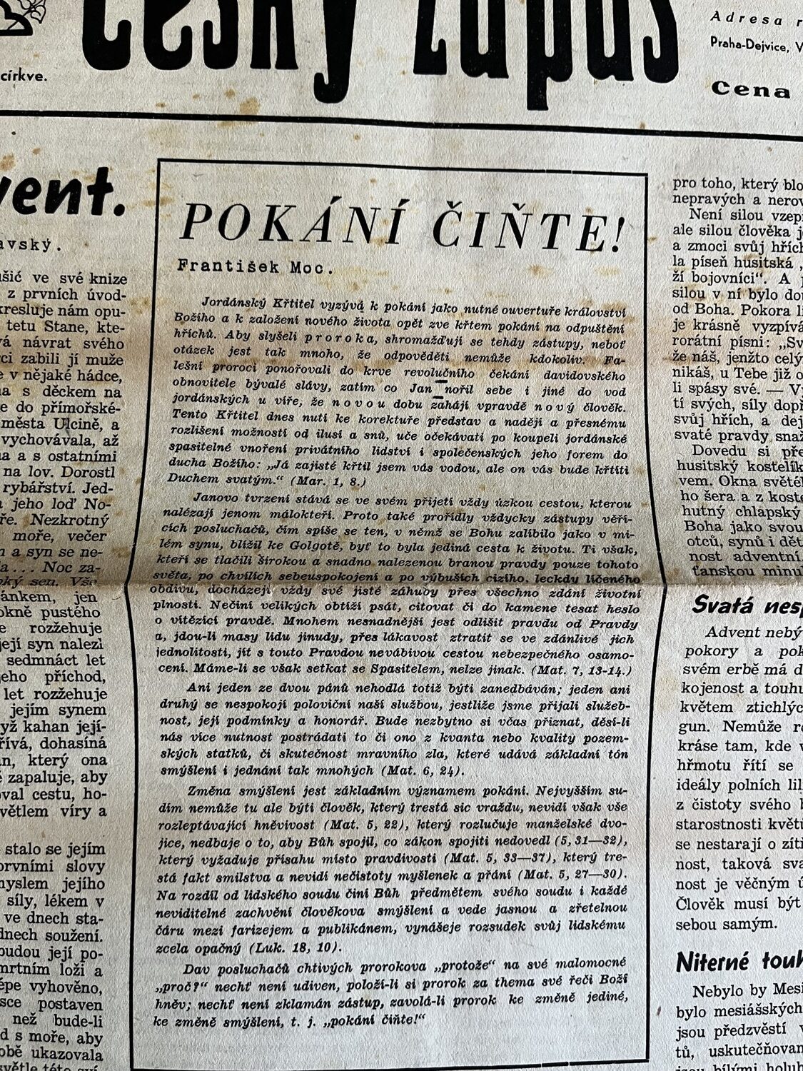 (hhj 24) 4 x Noviny Český zápas, týdeník církve české. 30.listopadu 1939 z obsahu: O knize knih, Jindřich Mánek. Nová socha Husa ad., 8 stran. 7.prosince 1939 z obsahu: Advent. Advent církevní. Niterné touhy. Svatá nespokojenost. Pokání čiňte! František Moc. Duch Kristův – norma křesťanského života ad., 8 stran.8.února 1940 z obsahu: Milostí Boží jsme, co jsme. K shromáždění náboženské obce. V červáncích obrození ad., 8 stran. 15.února 1940 z obsahu: Buď pravdivý! Postavení duchovního úřadu v náboženské obci. Josef Dobrovský v lidové tradici. O křesťanské osobnosti ad., 8 stran.