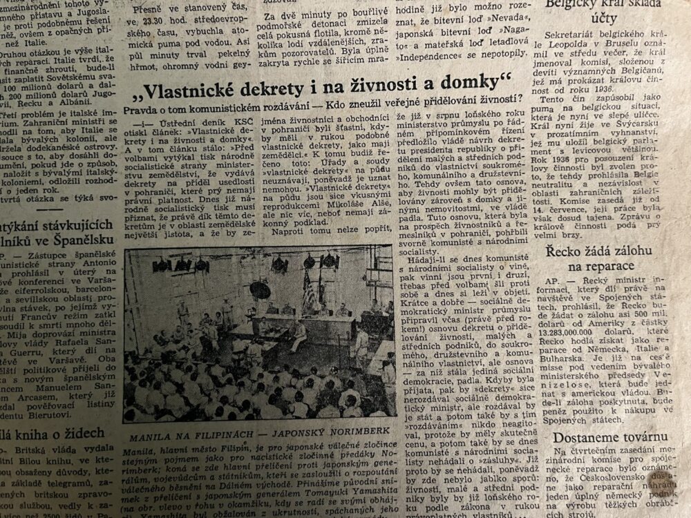 (hhj 4) Rozměr: 32 x 47 cm. Z obsahu:Pět komisí bude jednat o příštím míru. Ve středu rozsudek nad protektorátní vládou. Tisíc pět set metrů vysoký vodní sloup. Vlastnické dekrety i na živnosti a domky. Půl milionu nových zemědělských strojů ad. 4 strany. Přední kraj místy potrhaný.