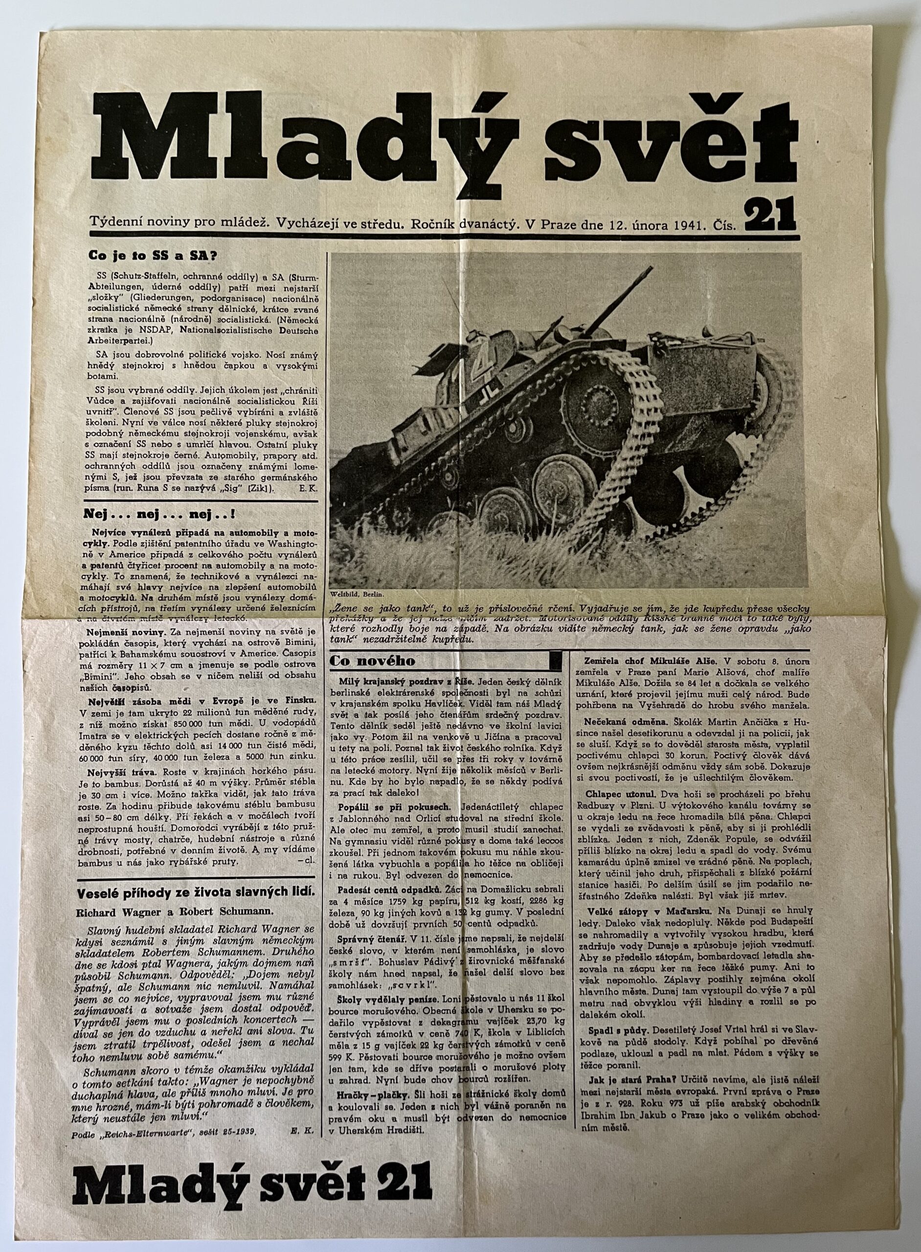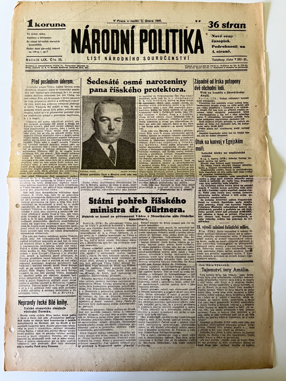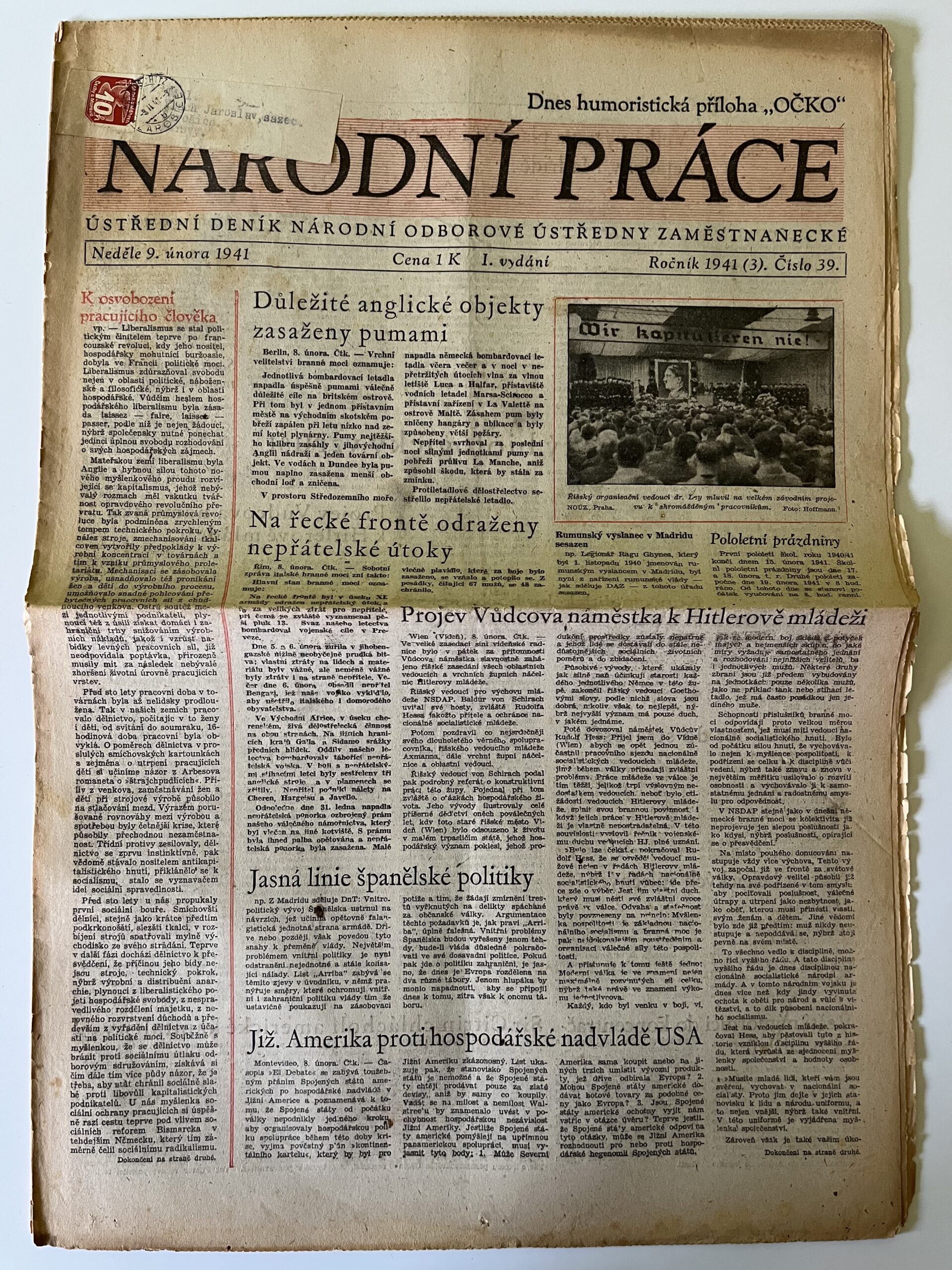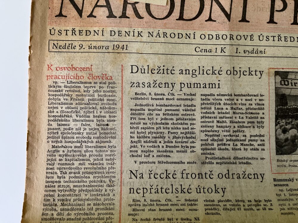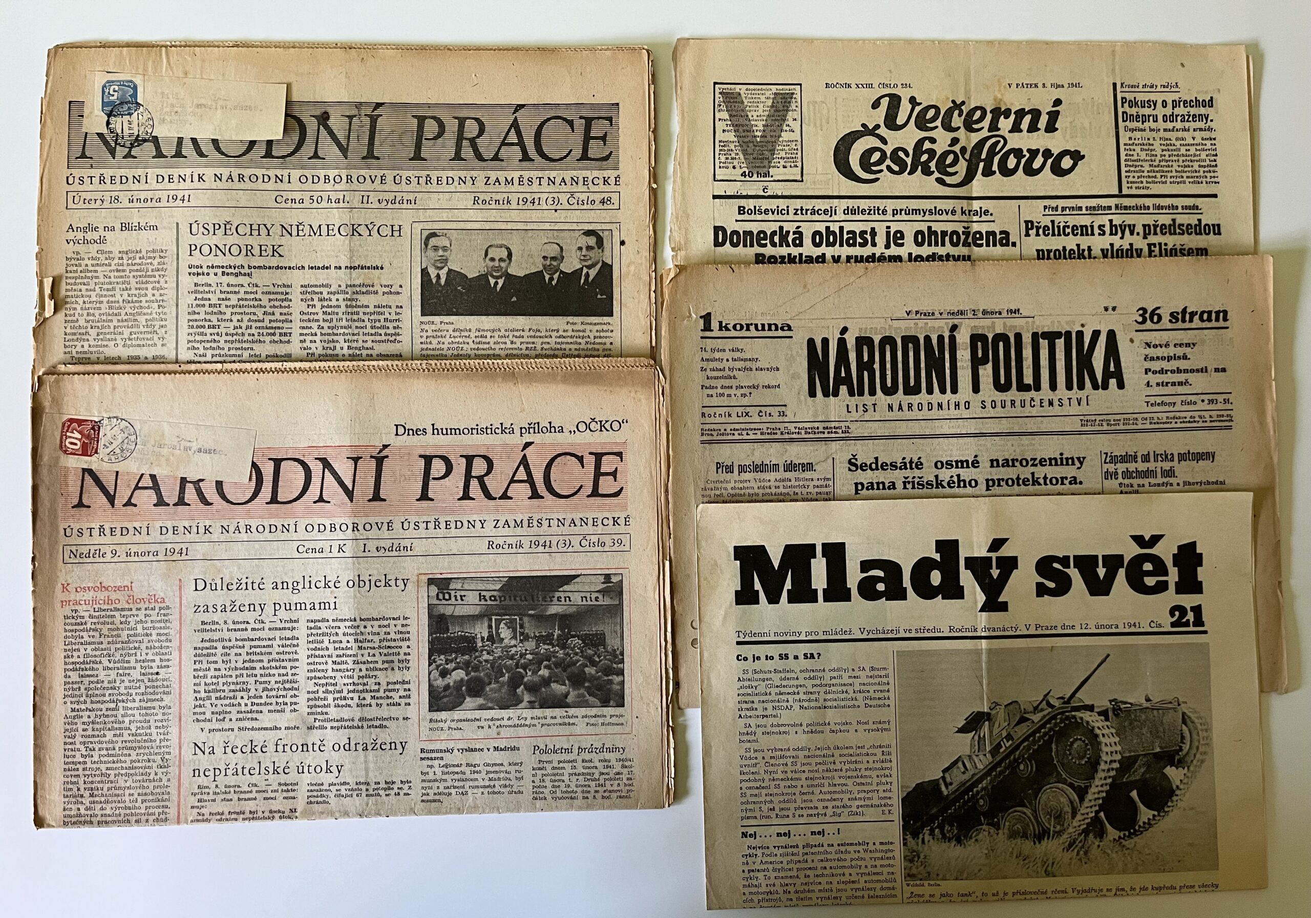 13 (K3-3) Noviny Mladý svět, Národní politika, Národní práce. Rozměr jedné strany 32 x 47 cm. Celek novin obsahuje 2 x Národní práce 9.února 1941 – Důležité anglické objekty zasaženy pumami. Na řecké frontě odraženy nepřátelské útoky…aj. 12 stran. 18. února 1941 – Úspěchy německých ponorek. Boje na řecké frontě trvají…aj. 4 listy. 1 x Večerní České Slovo 3.října 1941- Donecká oblast je ohrožena. Ďábelsky zločinné úklady proti českému lidu…aj. 1 list. 1 x Národní politika 2.února 1941 – Před posledním úderem…aj. 1 list. 1 x Mladý svět 12.února 1941 Co je to SS a SA? Co nového…aj. 2 listy.