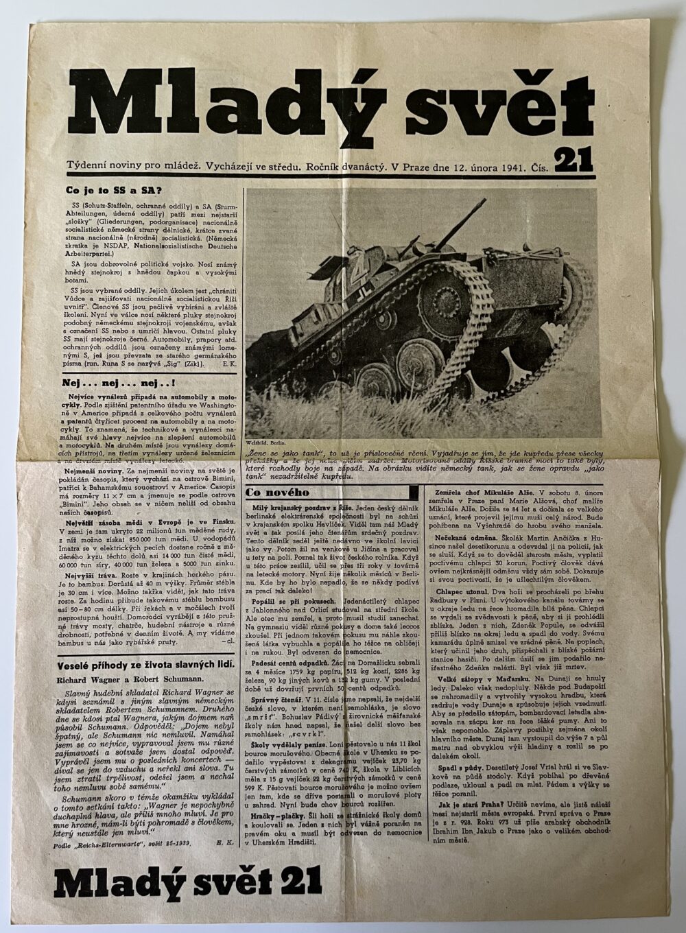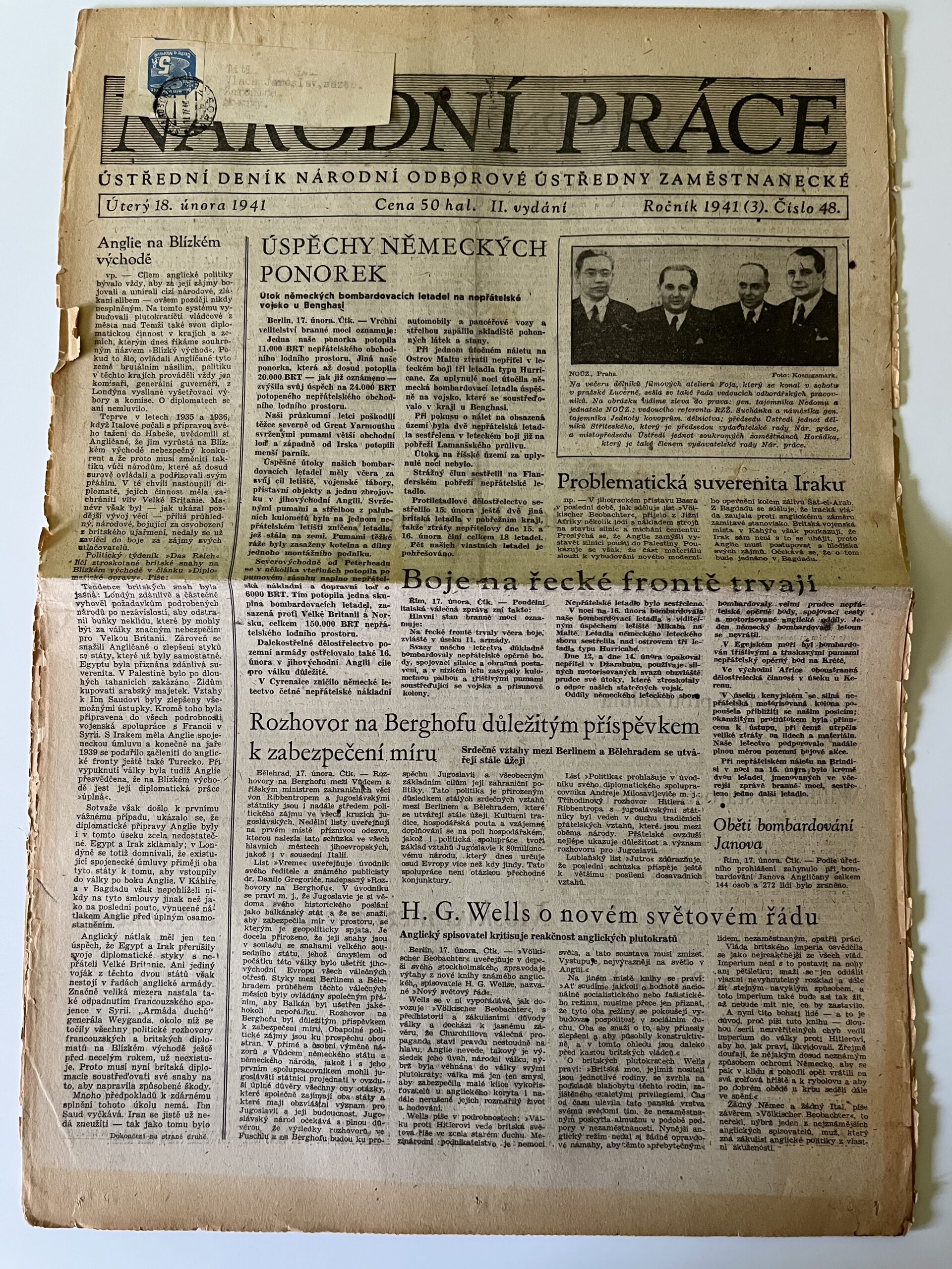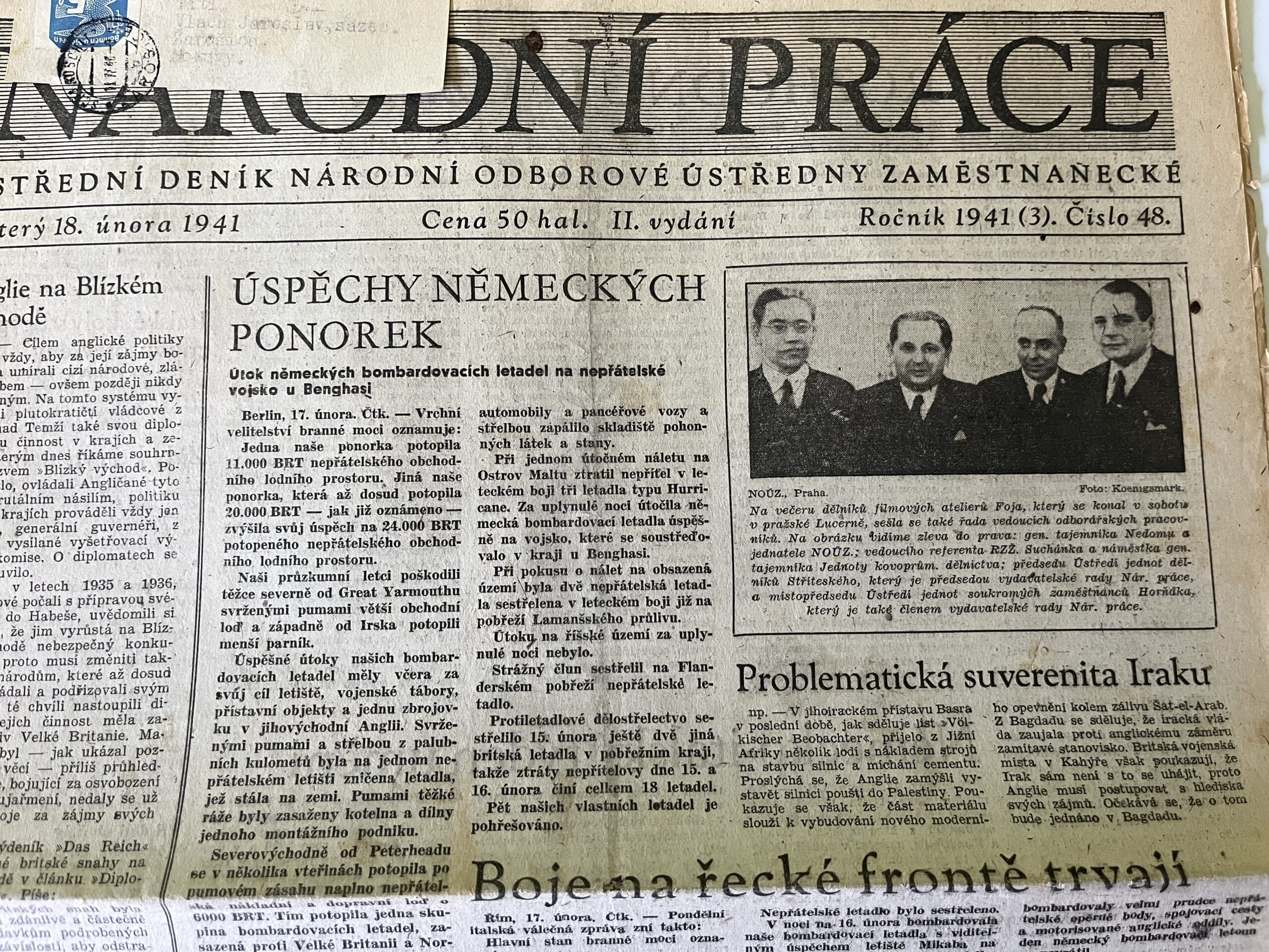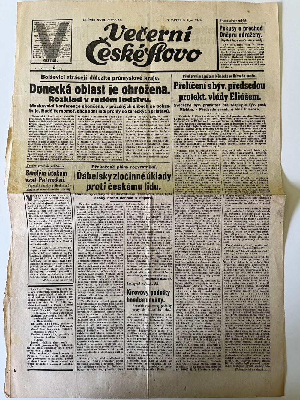 13 (K3-3) Noviny Mladý svět, Národní politika, Národní práce. Rozměr jedné strany 32 x 47 cm. Celek novin obsahuje 2 x Národní práce 9.února 1941 – Důležité anglické objekty zasaženy pumami. Na řecké frontě odraženy nepřátelské útoky…aj. 12 stran. 18. února 1941 – Úspěchy německých ponorek. Boje na řecké frontě trvají…aj. 4 listy. 1 x Večerní České Slovo 3.října 1941- Donecká oblast je ohrožena. Ďábelsky zločinné úklady proti českému lidu…aj. 1 list. 1 x Národní politika 2.února 1941 – Před posledním úderem…aj. 1 list. 1 x Mladý svět 12.února 1941 Co je to SS a SA? Co nového…aj. 2 listy.