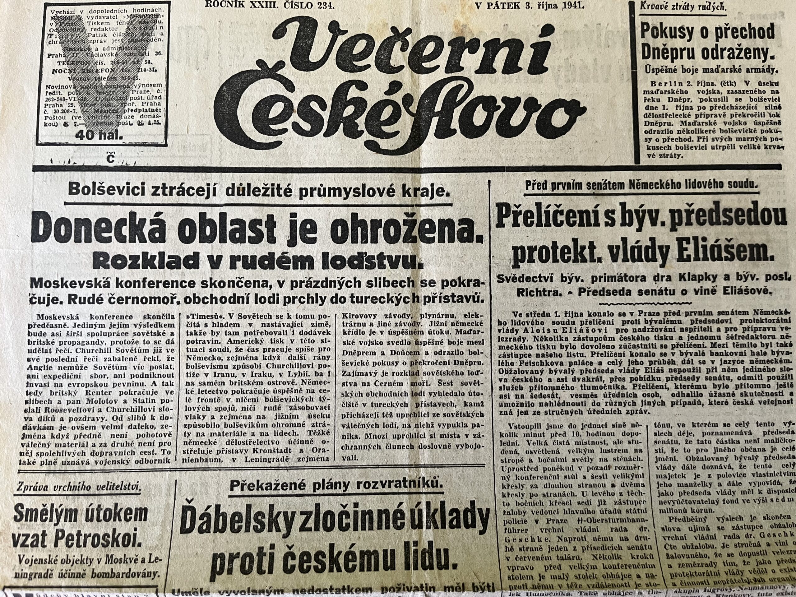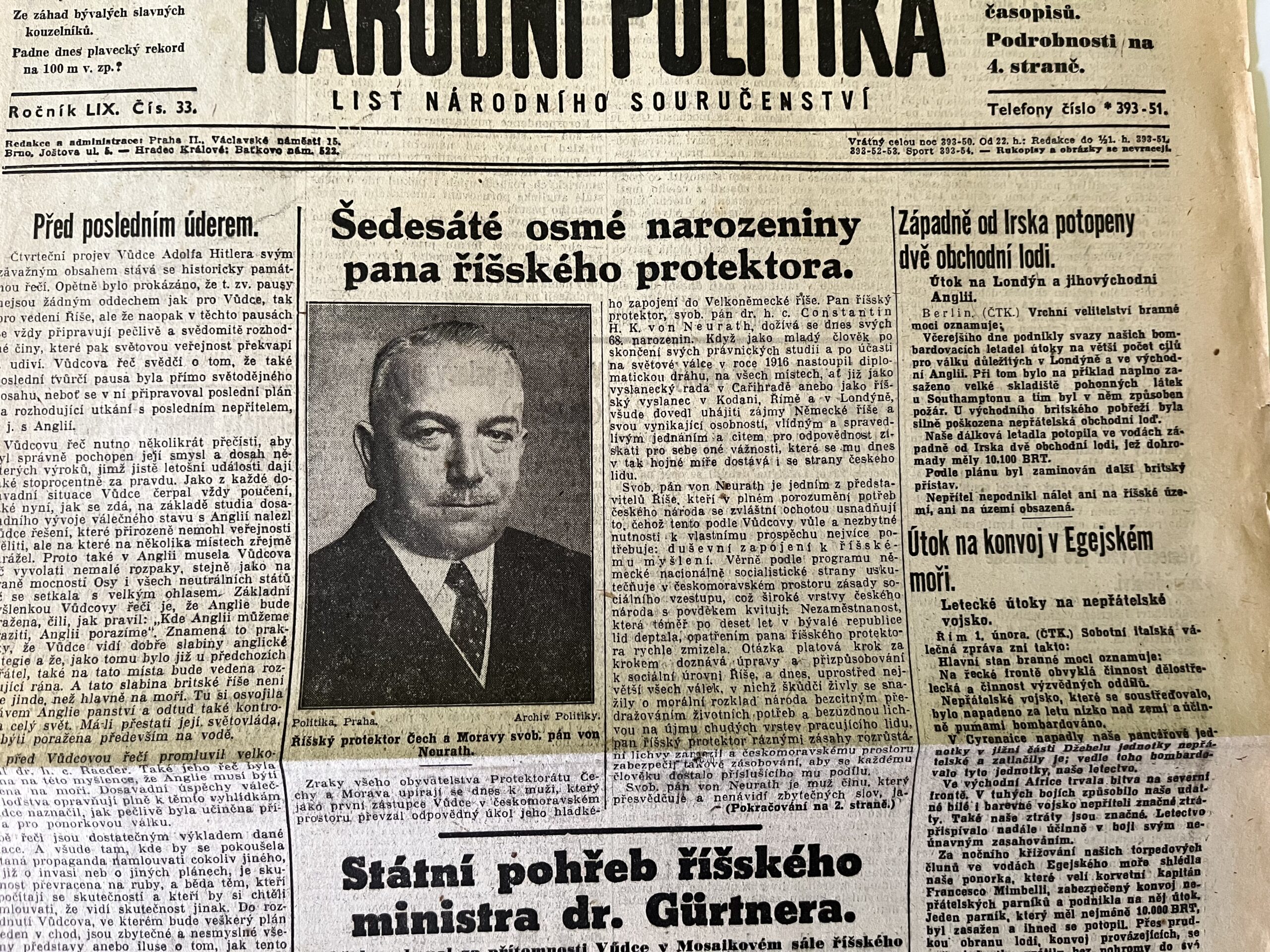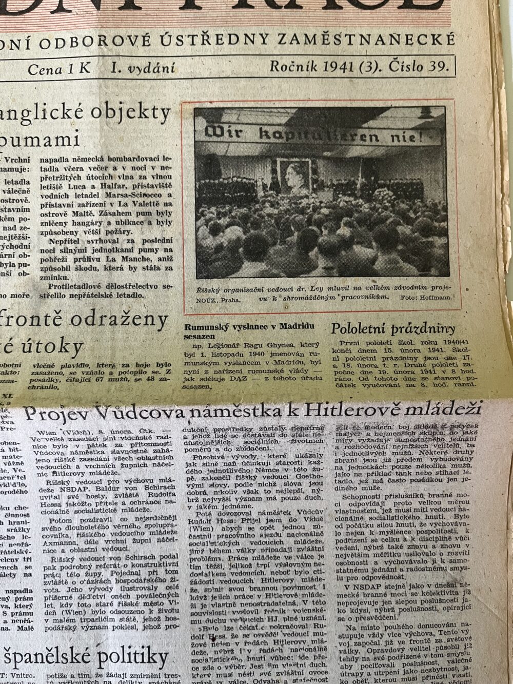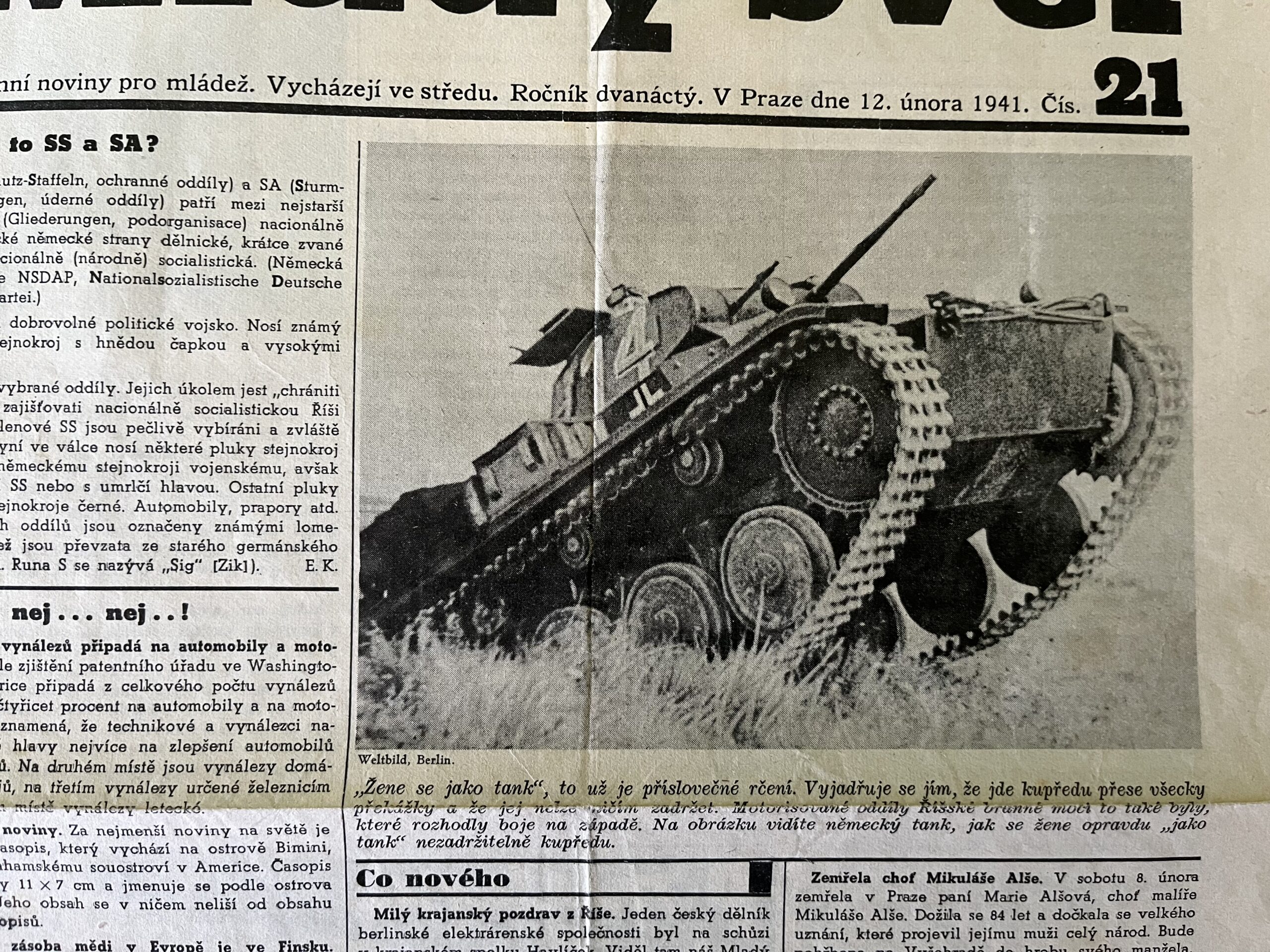 13 (K3-3) Noviny Mladý svět, Národní politika, Národní práce. Rozměr jedné strany 32 x 47 cm. Celek novin obsahuje 2 x Národní práce 9.února 1941 – Důležité anglické objekty zasaženy pumami. Na řecké frontě odraženy nepřátelské útoky…aj. 12 stran. 18. února 1941 – Úspěchy německých ponorek. Boje na řecké frontě trvají…aj. 4 listy. 1 x Večerní České Slovo 3.října 1941- Donecká oblast je ohrožena. Ďábelsky zločinné úklady proti českému lidu…aj. 1 list. 1 x Národní politika 2.února 1941 – Před posledním úderem…aj. 1 list. 1 x Mladý svět 12.února 1941 Co je to SS a SA? Co nového…aj. 2 listy.