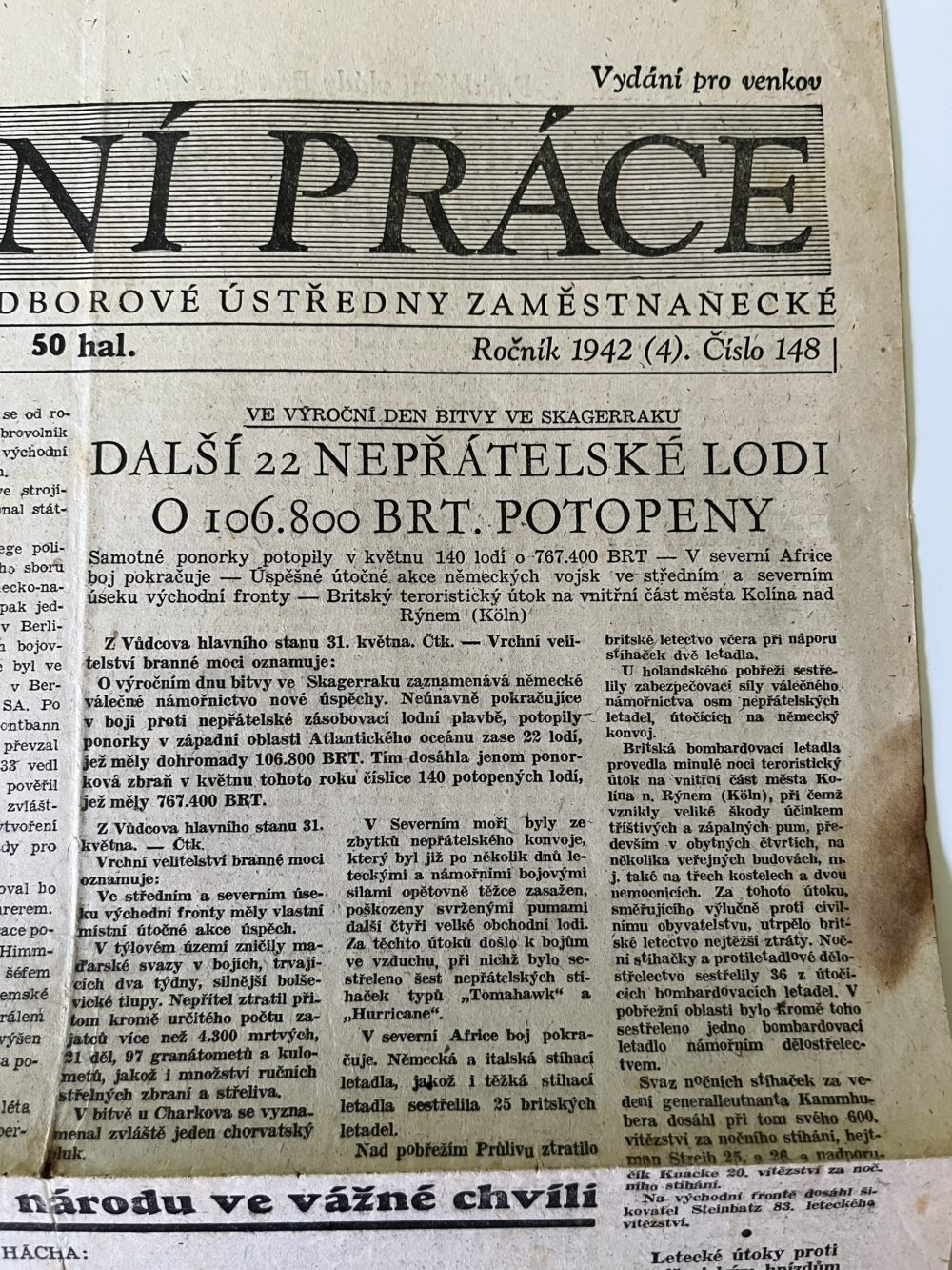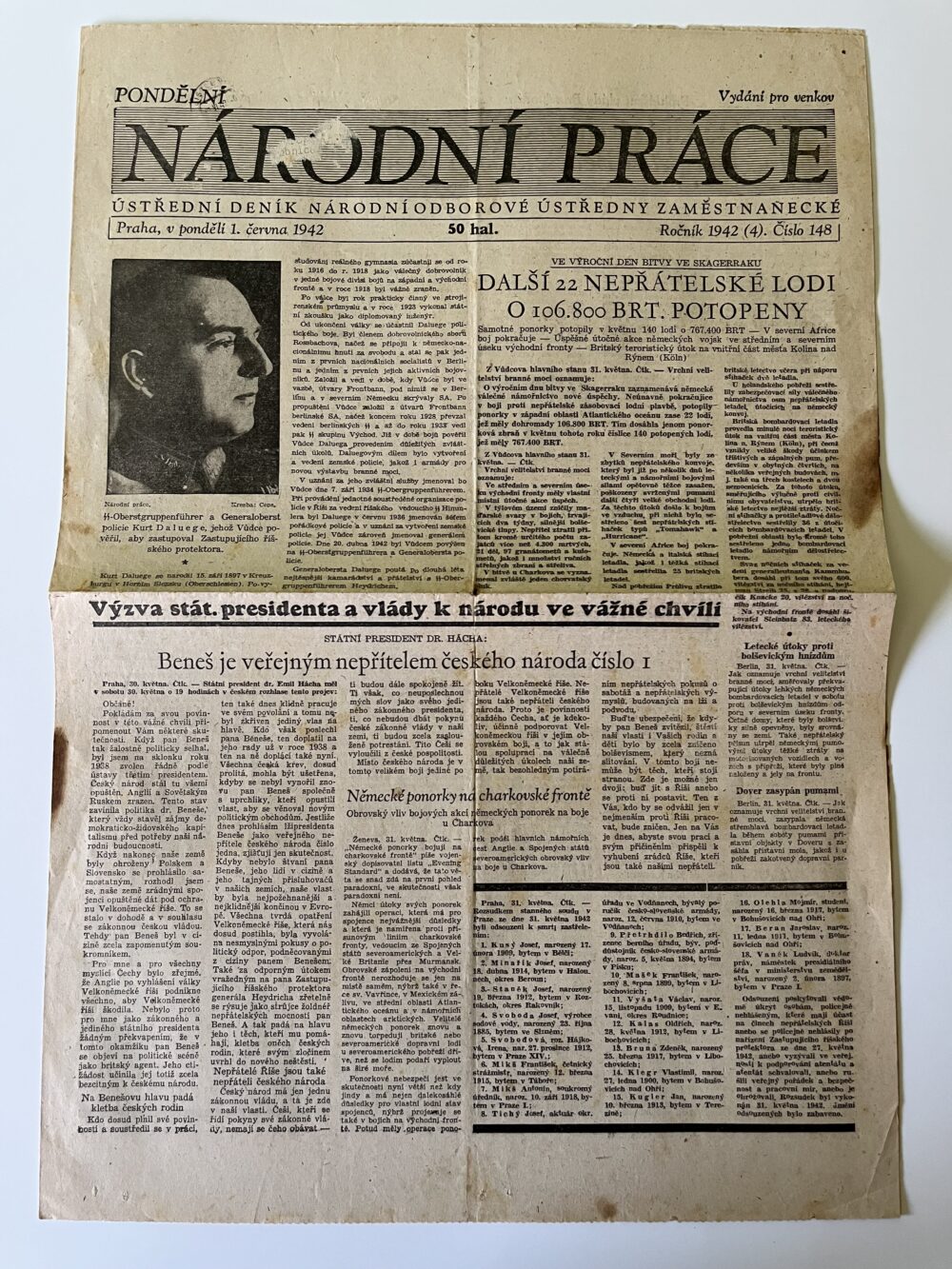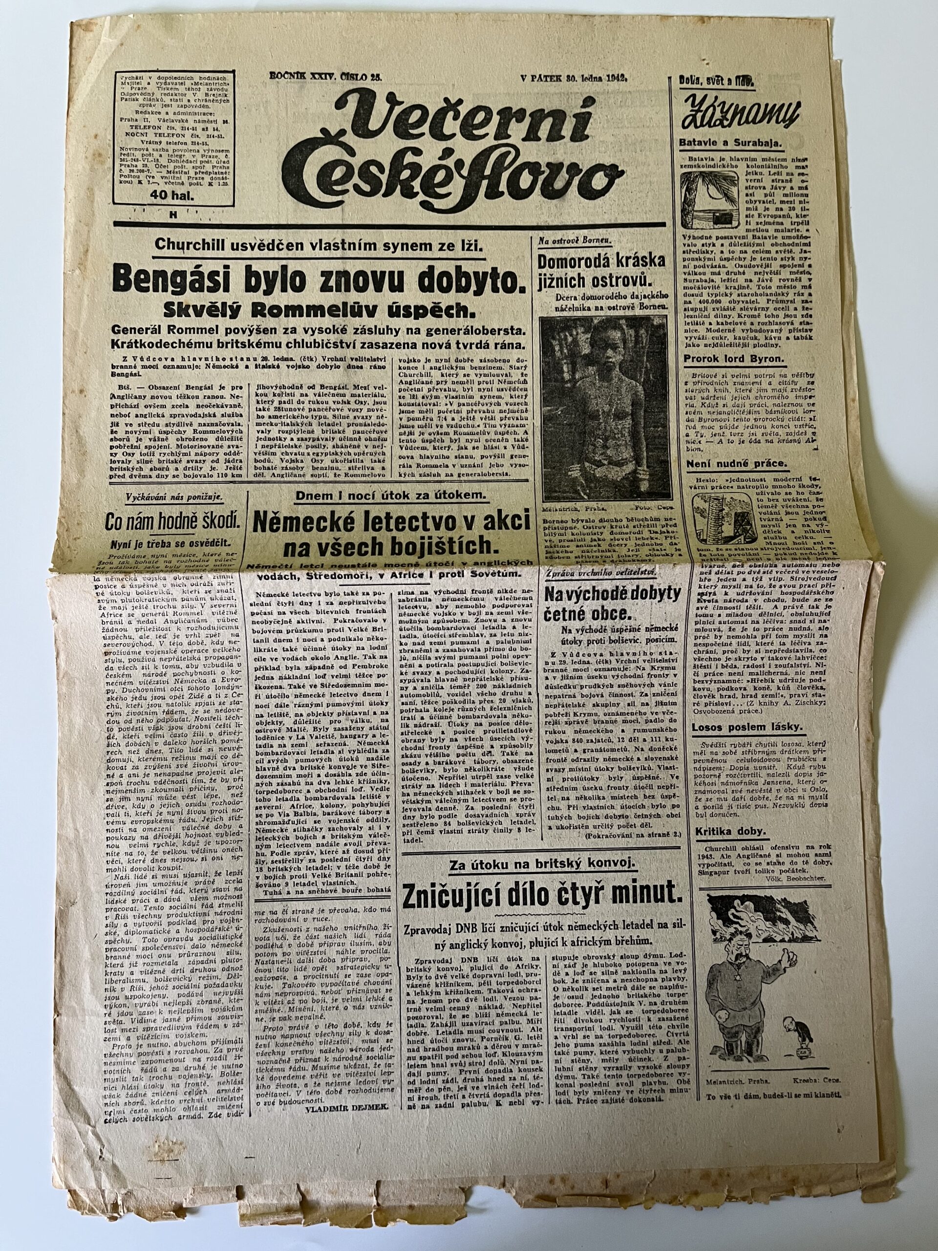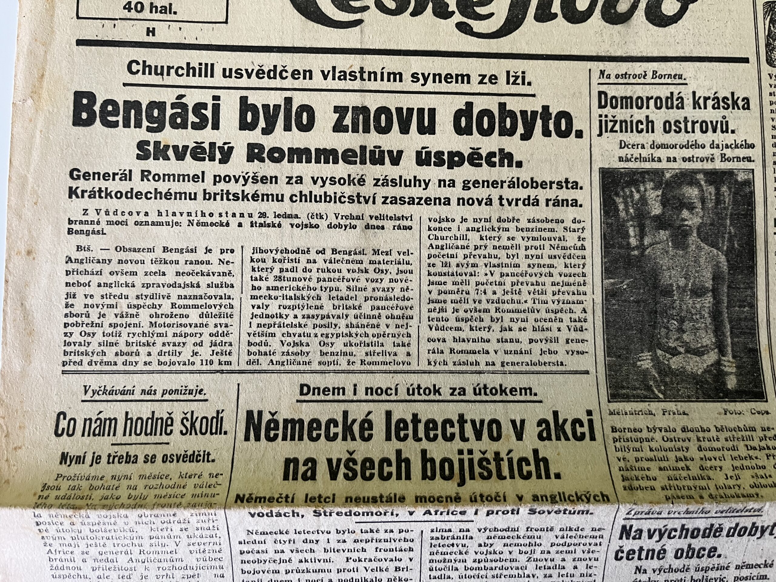 14 (K3-3) oviny Národní práce, Večerní a Nedělní České SlovoRozměr jedné strany 32 x 47 cm. Celek novin obsahuje 1 x Večerní České Slovo, 30. ledna 1942 – Německé letectvo v akci na všech bojištích.Churchill usvědčen vlastním synem ze lži…aj. 3 listy. 1 x Nedělní České Slovo, 1.února 1942 – Velká řeč Vůdcova o boji za Říši, Evropu a civilisované lidstvo. Bude opět rok velkých vítězství!aj. 3 listy. 2 x Národní práce 1.června 1942 – Výzva stát.presidenta a vlády k národu ve vážné chvíli…aj. 4 strany. 4 června 1942 – Český lid odsoudil emigrantské štváče…aj. 1 list.