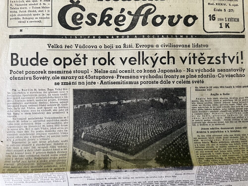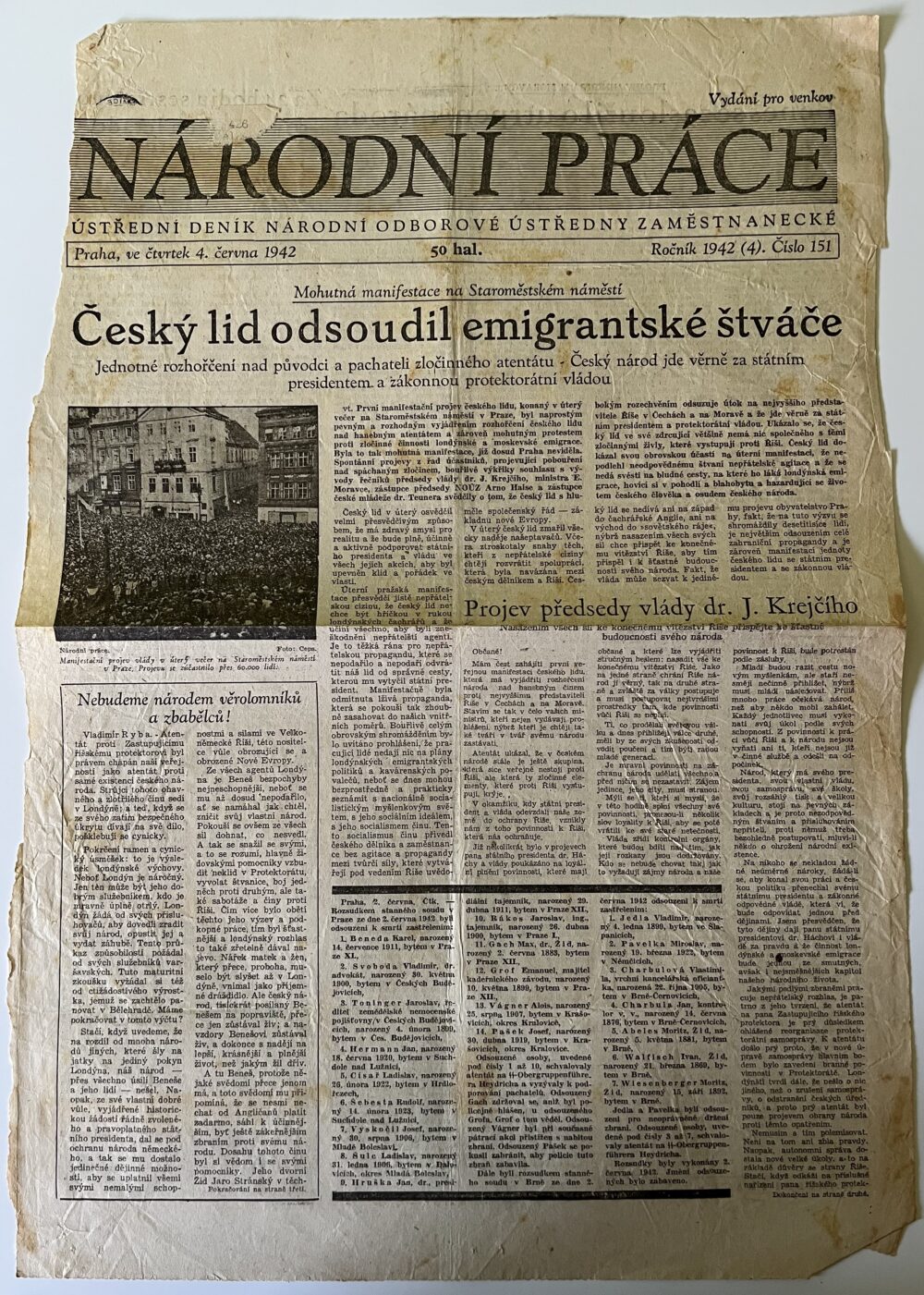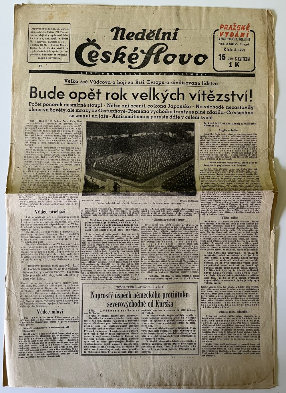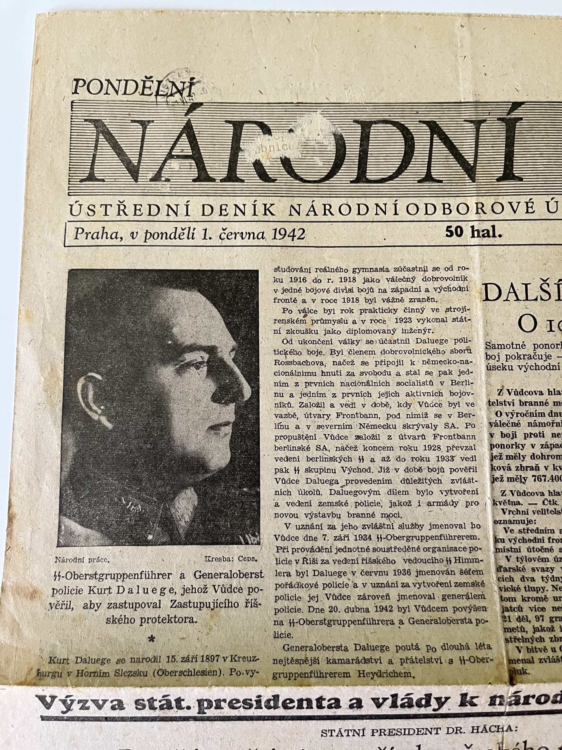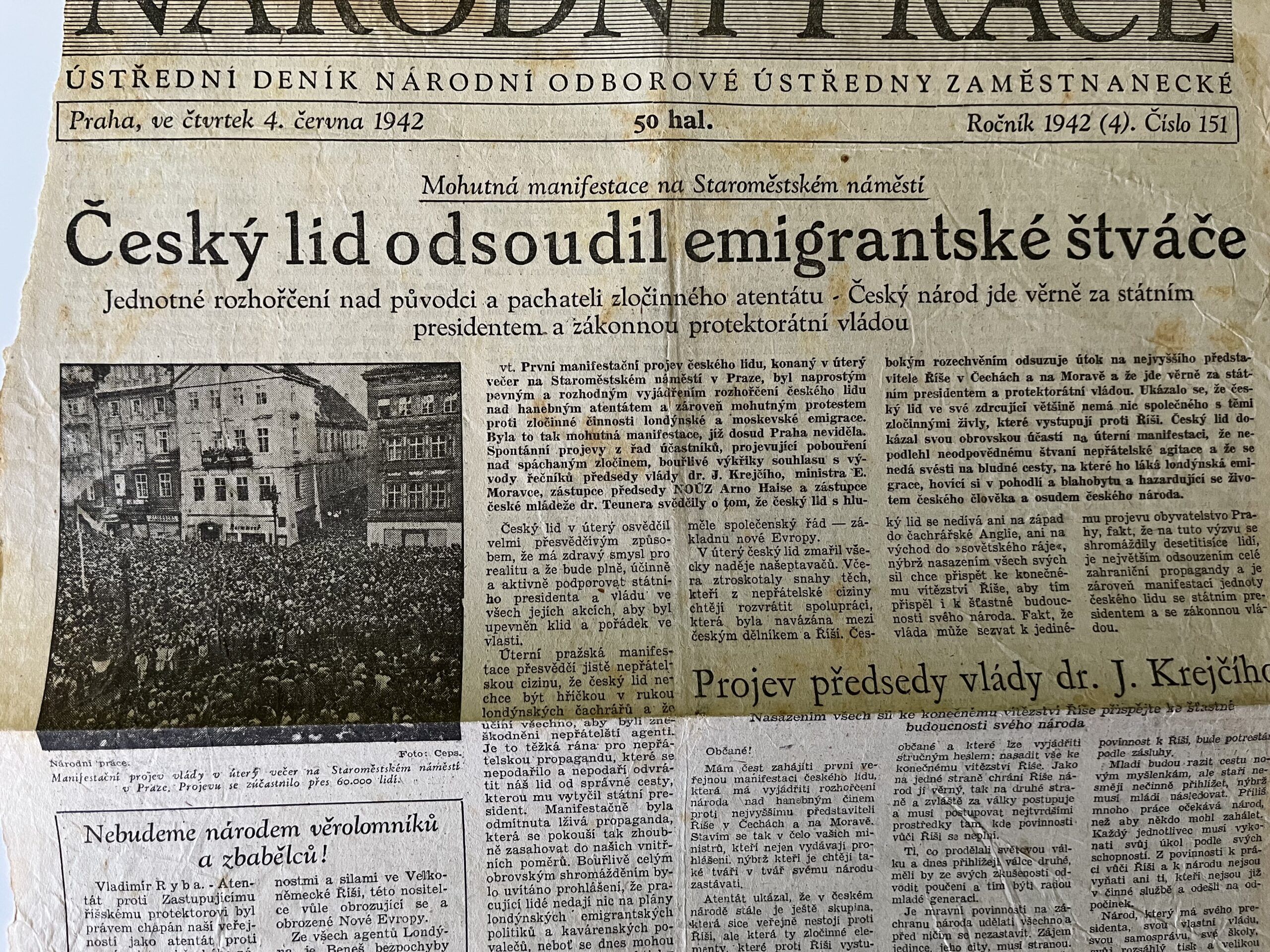 14 (K3-3) oviny Národní práce, Večerní a Nedělní České SlovoRozměr jedné strany 32 x 47 cm. Celek novin obsahuje 1 x Večerní České Slovo, 30. ledna 1942 – Německé letectvo v akci na všech bojištích.Churchill usvědčen vlastním synem ze lži…aj. 3 listy. 1 x Nedělní České Slovo, 1.února 1942 – Velká řeč Vůdcova o boji za Říši, Evropu a civilisované lidstvo. Bude opět rok velkých vítězství!aj. 3 listy. 2 x Národní práce 1.června 1942 – Výzva stát.presidenta a vlády k národu ve vážné chvíli…aj. 4 strany. 4 června 1942 – Český lid odsoudil emigrantské štváče…aj. 1 list.