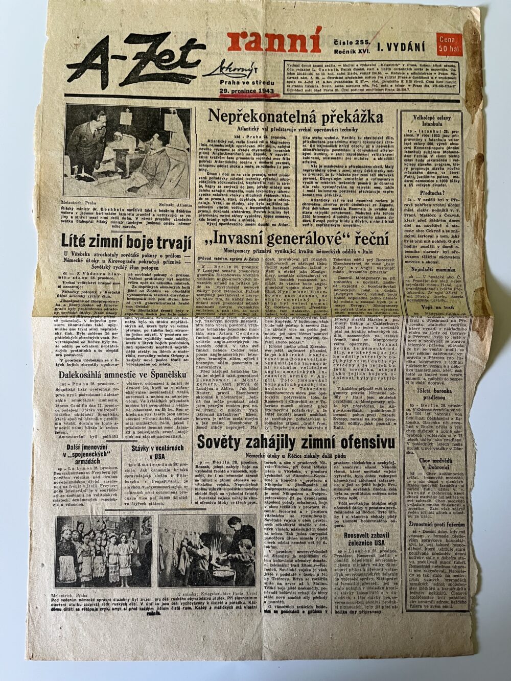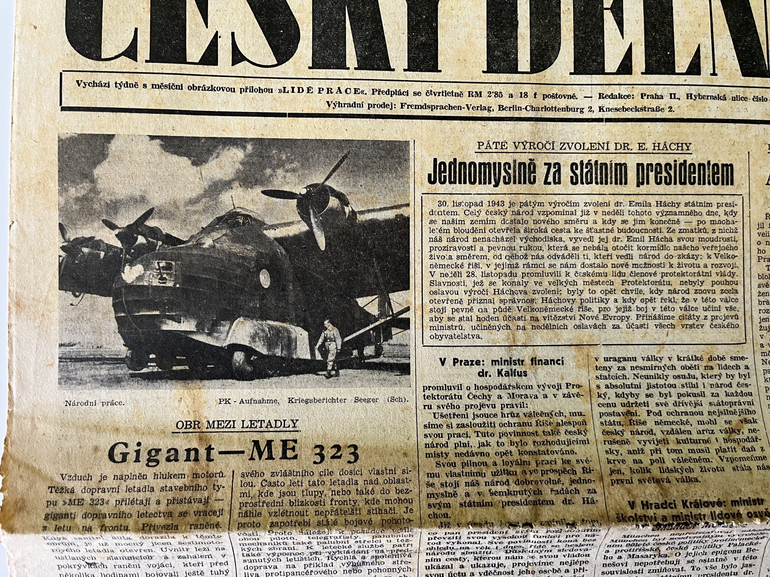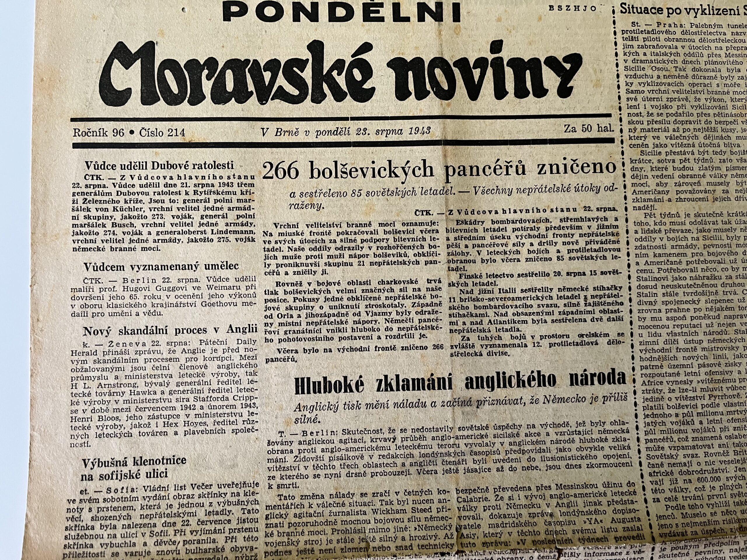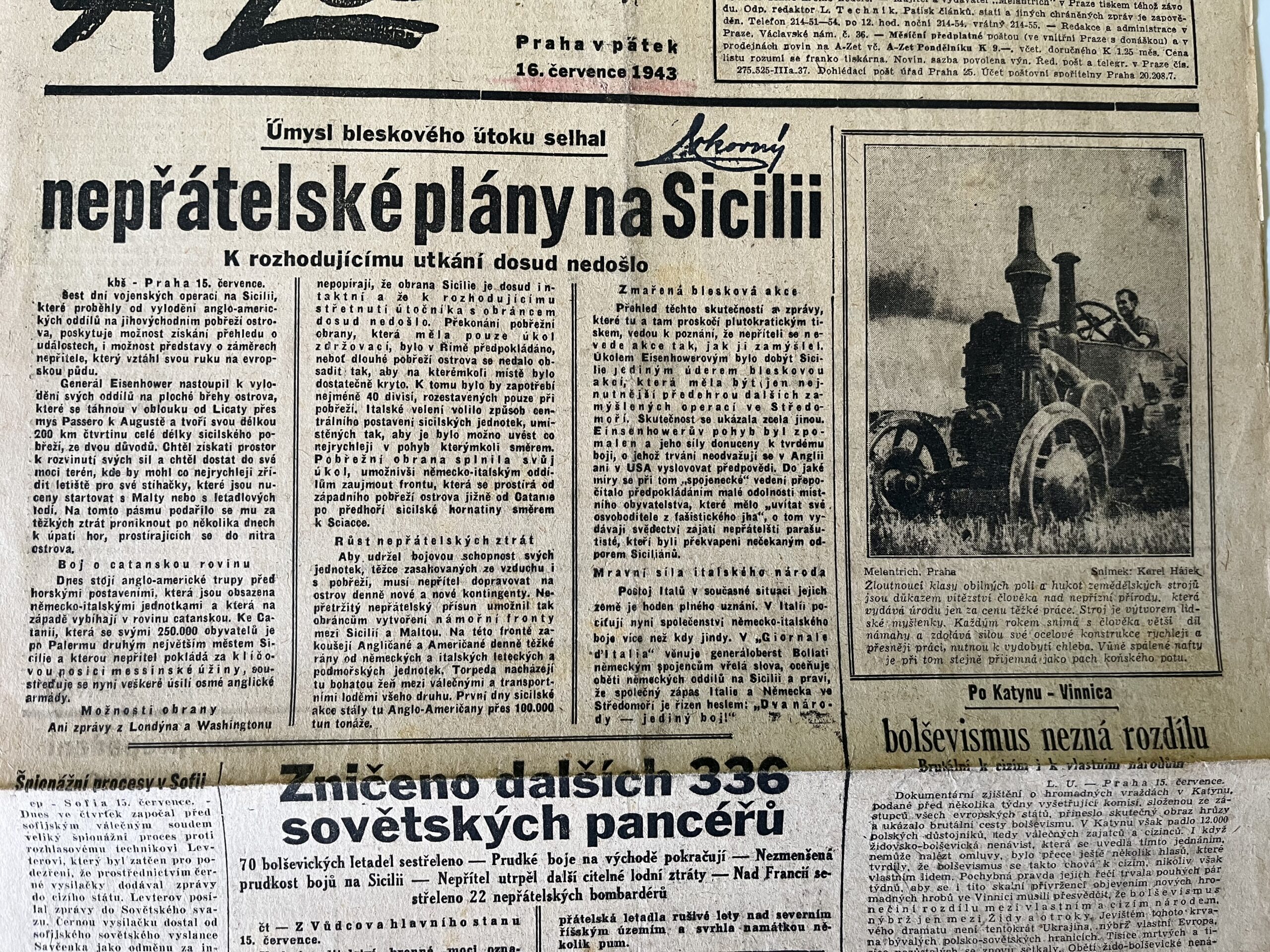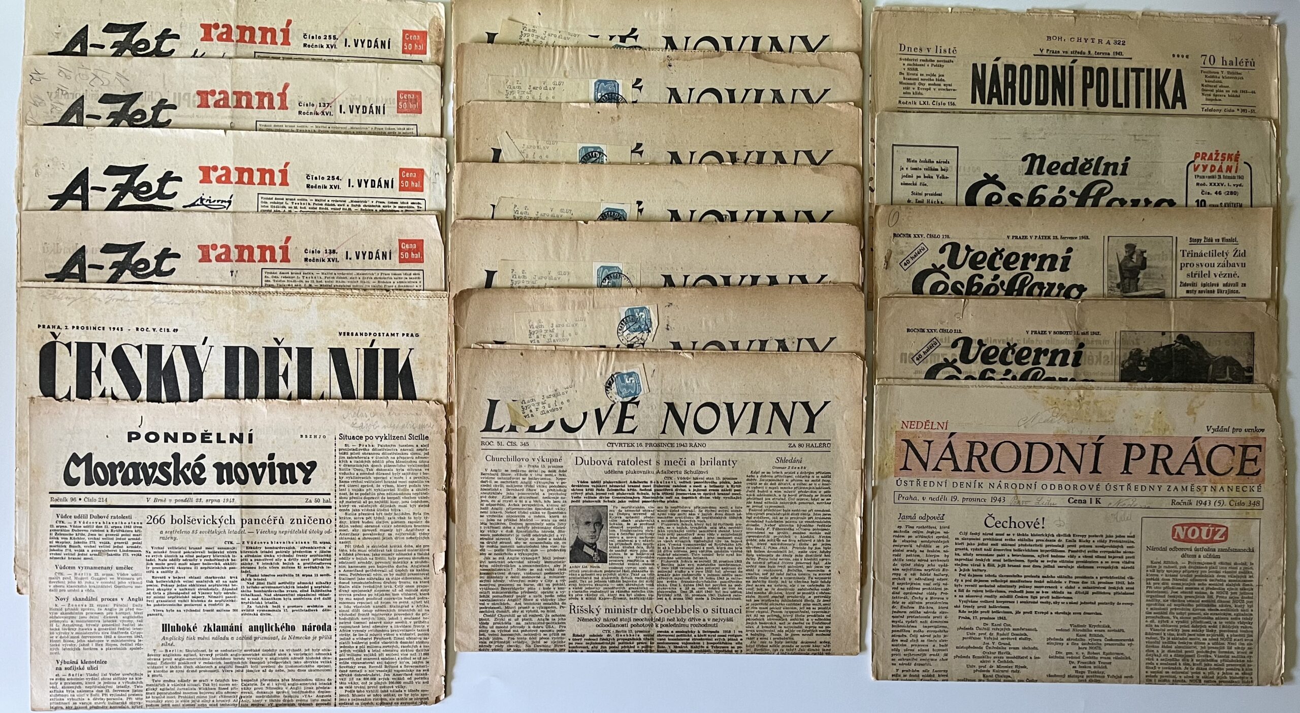 15 (K3-3) Lidové noviny,A-Zet,Český Dělník,Večerní Slovo. Rozměr jedné strany 32 x 47 cm. Set novin obsahují 7 x Lidové noviny, 3.únor 1943 – Vůdce povede Říši k největšímu ze všech vítězství. Prudké obranné boje na východě… aj., 4 strany. 23.května 1943 – Nerozlučná bojová a osudová pospolitost Osy. Sovětské útoky ztroskotaly…aj., 6 listů. 22.června 1943 – Silné tlupy na Černé Hoře zničeny. Sovětům hrozí špatná sklizeň…aj. 4 listy. 23.června 1943 – Druhý sjezd evropských novinářů. Evropa musí bojovat až do konce…aj. 4 strany. 23.července 1943 Všechny útoky bolševiků ztroskotaly. Velké ztráty nepřátel ve Středomoří…aj. 4 strany. 3.srpna 1943 – Marné pokusy o průlom na Sicilii. Eisenhowerovy nesplněné plány…aj. 4 strany. 16.prosince 1943 – Dubová ratolest s meči a brilanty. Říšský ministr dr. Goebbels o situaci…aj.4 strany. 1 x Národní Politika 9.června 1943 – Pádná rána nepřátelské propagandě. Letectvo v německém zbrojení…aj. 2 listy. 1 x Nedělní Slovo 28.listopadu 1943 – Plány USA na vykořisťování světa…aj. 10 stran. 2 x Večerní České Slovo 11.září 1943 – Bezpečná víra ve vítězství Říše. Vůdcův projev o Italii…aj. 4 strany. 23.července 1943 – Papežovo odsouzení teroristů…aj. 1 list. 1 x Národní Práce 19.prosince 1943 – NOÚZ, Úspěšná obrana a protiútoky na východě…aj. 8 stran. 4 x A – Zet 15.července 1 list, 16. července 1 list, 28.prosince 1943 1 list, 29.prosince 1943 1 list. 1 x Moravské noviny 23.srpna 1943 – 266 bolševických pancéřů zničeno. Palestinský problém…aj. 2 listy, v přehybu poškozeny. 1 x Český dělník 2.prosince 1943 – Gigant – ME 323…aj. 4 listy, v přehybu poškozeny.