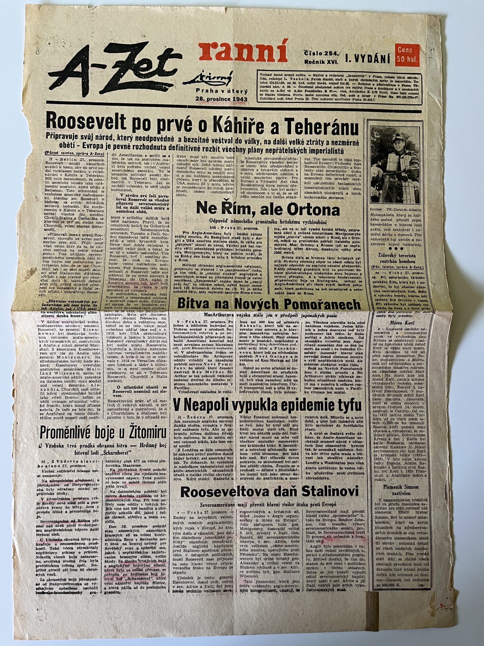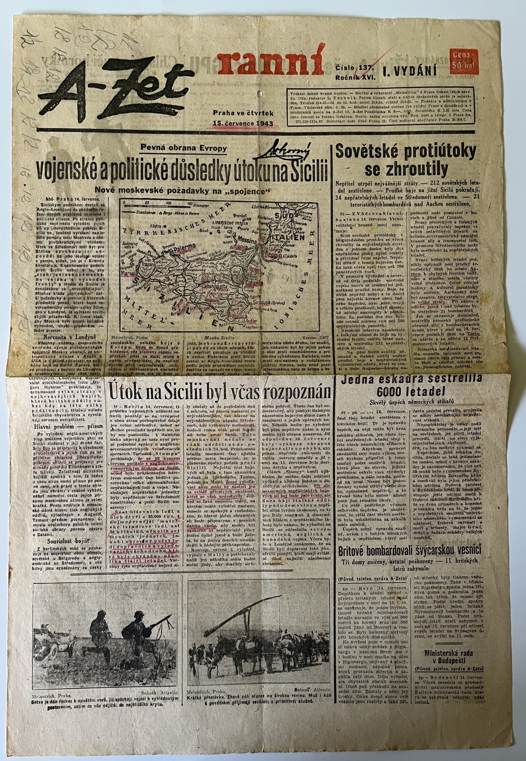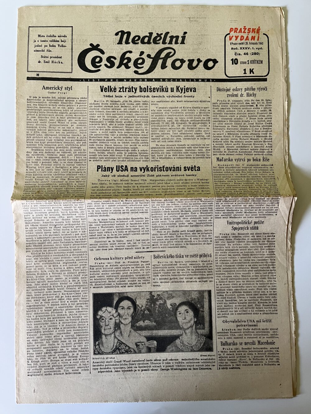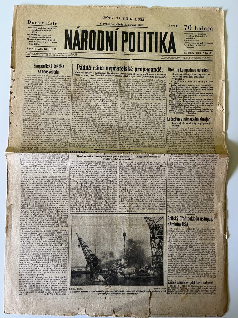 15 (K3-3) Lidové noviny,A-Zet,Český Dělník,Večerní Slovo. Rozměr jedné strany 32 x 47 cm. Set novin obsahují 7 x Lidové noviny, 3.únor 1943 – Vůdce povede Říši k největšímu ze všech vítězství. Prudké obranné boje na východě… aj., 4 strany. 23.května 1943 – Nerozlučná bojová a osudová pospolitost Osy. Sovětské útoky ztroskotaly…aj., 6 listů. 22.června 1943 – Silné tlupy na Černé Hoře zničeny. Sovětům hrozí špatná sklizeň…aj. 4 listy. 23.června 1943 – Druhý sjezd evropských novinářů. Evropa musí bojovat až do konce…aj. 4 strany. 23.července 1943 Všechny útoky bolševiků ztroskotaly. Velké ztráty nepřátel ve Středomoří…aj. 4 strany. 3.srpna 1943 – Marné pokusy o průlom na Sicilii. Eisenhowerovy nesplněné plány…aj. 4 strany. 16.prosince 1943 – Dubová ratolest s meči a brilanty. Říšský ministr dr. Goebbels o situaci…aj.4 strany. 1 x Národní Politika 9.června 1943 – Pádná rána nepřátelské propagandě. Letectvo v německém zbrojení…aj. 2 listy. 1 x Nedělní Slovo 28.listopadu 1943 – Plány USA na vykořisťování světa…aj. 10 stran. 2 x Večerní České Slovo 11.září 1943 – Bezpečná víra ve vítězství Říše. Vůdcův projev o Italii…aj. 4 strany. 23.července 1943 – Papežovo odsouzení teroristů…aj. 1 list. 1 x Národní Práce 19.prosince 1943 – NOÚZ, Úspěšná obrana a protiútoky na východě…aj. 8 stran. 4 x A – Zet 15.července 1 list, 16. července 1 list, 28.prosince 1943 1 list, 29.prosince 1943 1 list. 1 x Moravské noviny 23.srpna 1943 – 266 bolševických pancéřů zničeno. Palestinský problém…aj. 2 listy, v přehybu poškozeny. 1 x Český dělník 2.prosince 1943 – Gigant – ME 323…aj. 4 listy, v přehybu poškozeny.