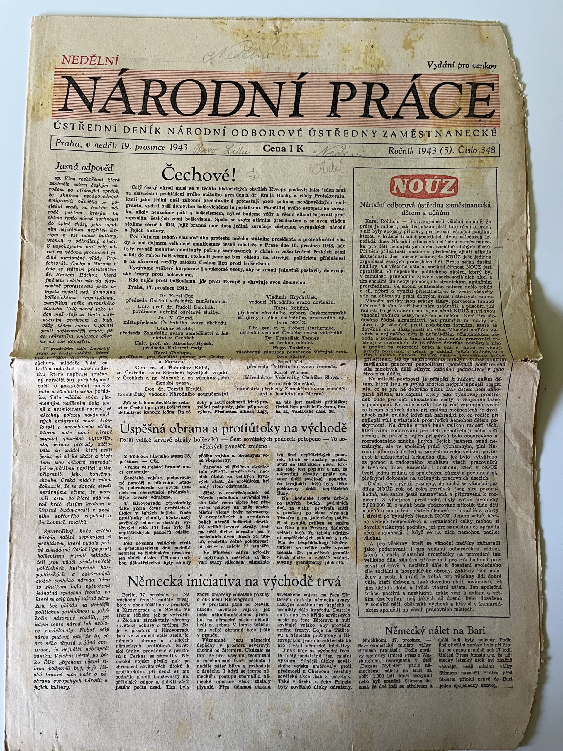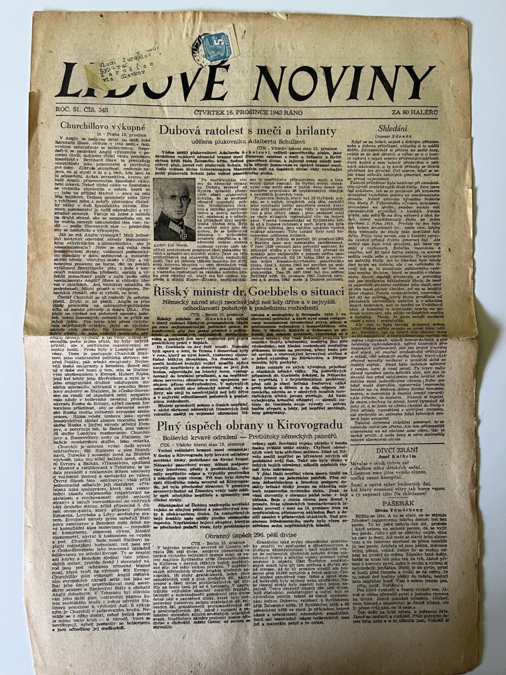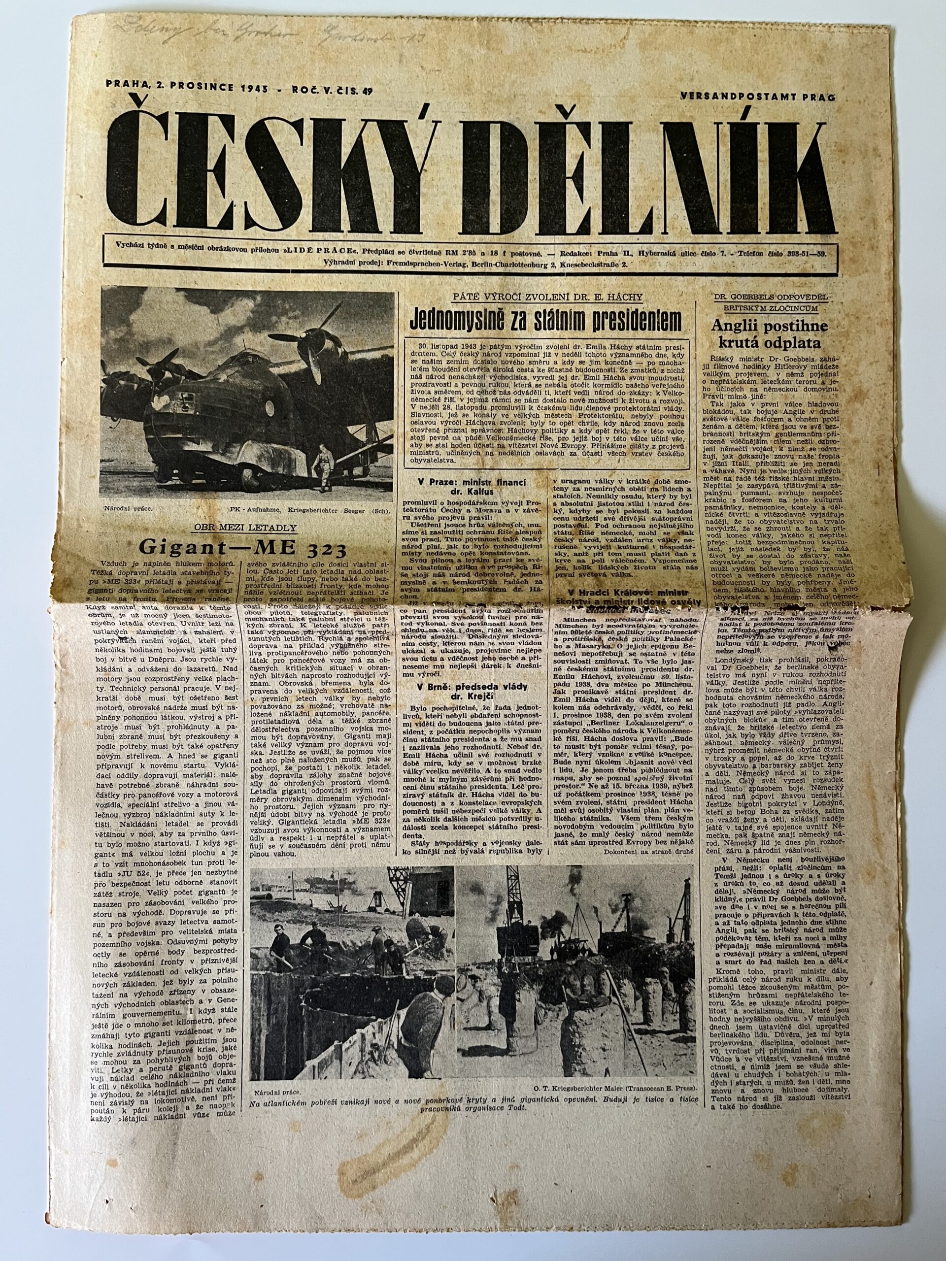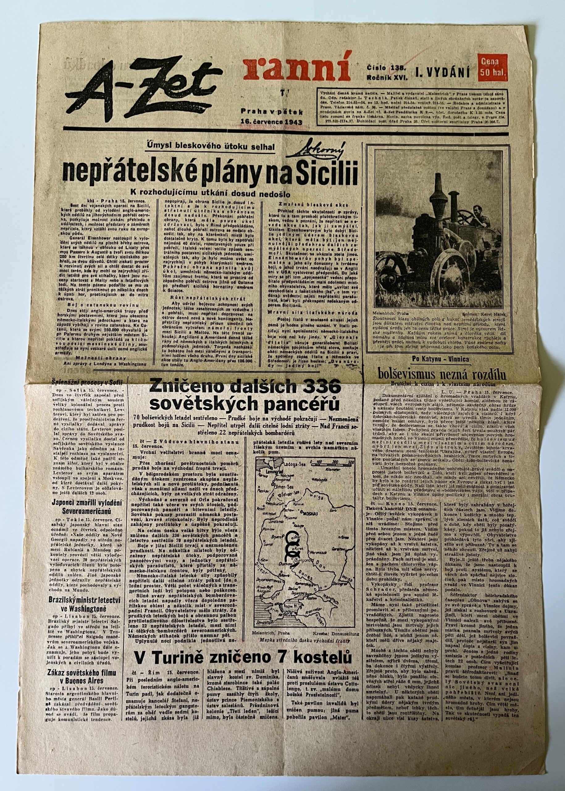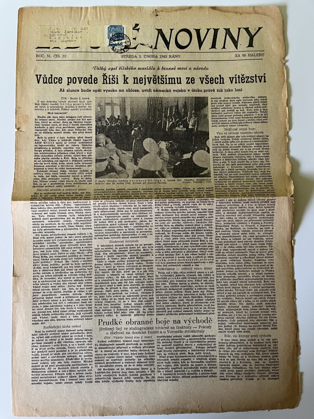 15 (K3-3) Lidové noviny,A-Zet,Český Dělník,Večerní Slovo. Rozměr jedné strany 32 x 47 cm. Set novin obsahují 7 x Lidové noviny, 3.únor 1943 – Vůdce povede Říši k největšímu ze všech vítězství. Prudké obranné boje na východě… aj., 4 strany. 23.května 1943 – Nerozlučná bojová a osudová pospolitost Osy. Sovětské útoky ztroskotaly…aj., 6 listů. 22.června 1943 – Silné tlupy na Černé Hoře zničeny. Sovětům hrozí špatná sklizeň…aj. 4 listy. 23.června 1943 – Druhý sjezd evropských novinářů. Evropa musí bojovat až do konce…aj. 4 strany. 23.července 1943 Všechny útoky bolševiků ztroskotaly. Velké ztráty nepřátel ve Středomoří…aj. 4 strany. 3.srpna 1943 – Marné pokusy o průlom na Sicilii. Eisenhowerovy nesplněné plány…aj. 4 strany. 16.prosince 1943 – Dubová ratolest s meči a brilanty. Říšský ministr dr. Goebbels o situaci…aj.4 strany. 1 x Národní Politika 9.června 1943 – Pádná rána nepřátelské propagandě. Letectvo v německém zbrojení…aj. 2 listy. 1 x Nedělní Slovo 28.listopadu 1943 – Plány USA na vykořisťování světa…aj. 10 stran. 2 x Večerní České Slovo 11.září 1943 – Bezpečná víra ve vítězství Říše. Vůdcův projev o Italii…aj. 4 strany. 23.července 1943 – Papežovo odsouzení teroristů…aj. 1 list. 1 x Národní Práce 19.prosince 1943 – NOÚZ, Úspěšná obrana a protiútoky na východě…aj. 8 stran. 4 x A – Zet 15.července 1 list, 16. července 1 list, 28.prosince 1943 1 list, 29.prosince 1943 1 list. 1 x Moravské noviny 23.srpna 1943 – 266 bolševických pancéřů zničeno. Palestinský problém…aj. 2 listy, v přehybu poškozeny. 1 x Český dělník 2.prosince 1943 – Gigant – ME 323…aj. 4 listy, v přehybu poškozeny.