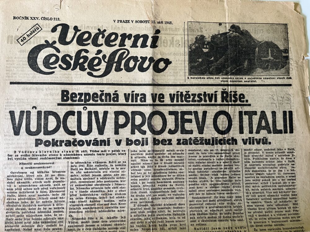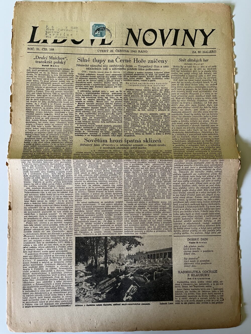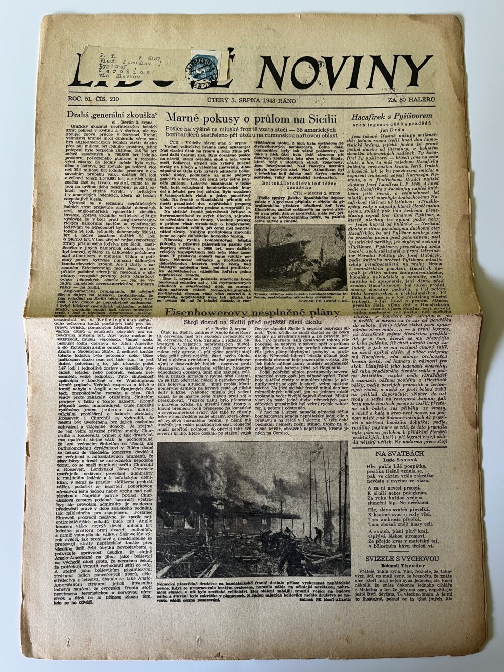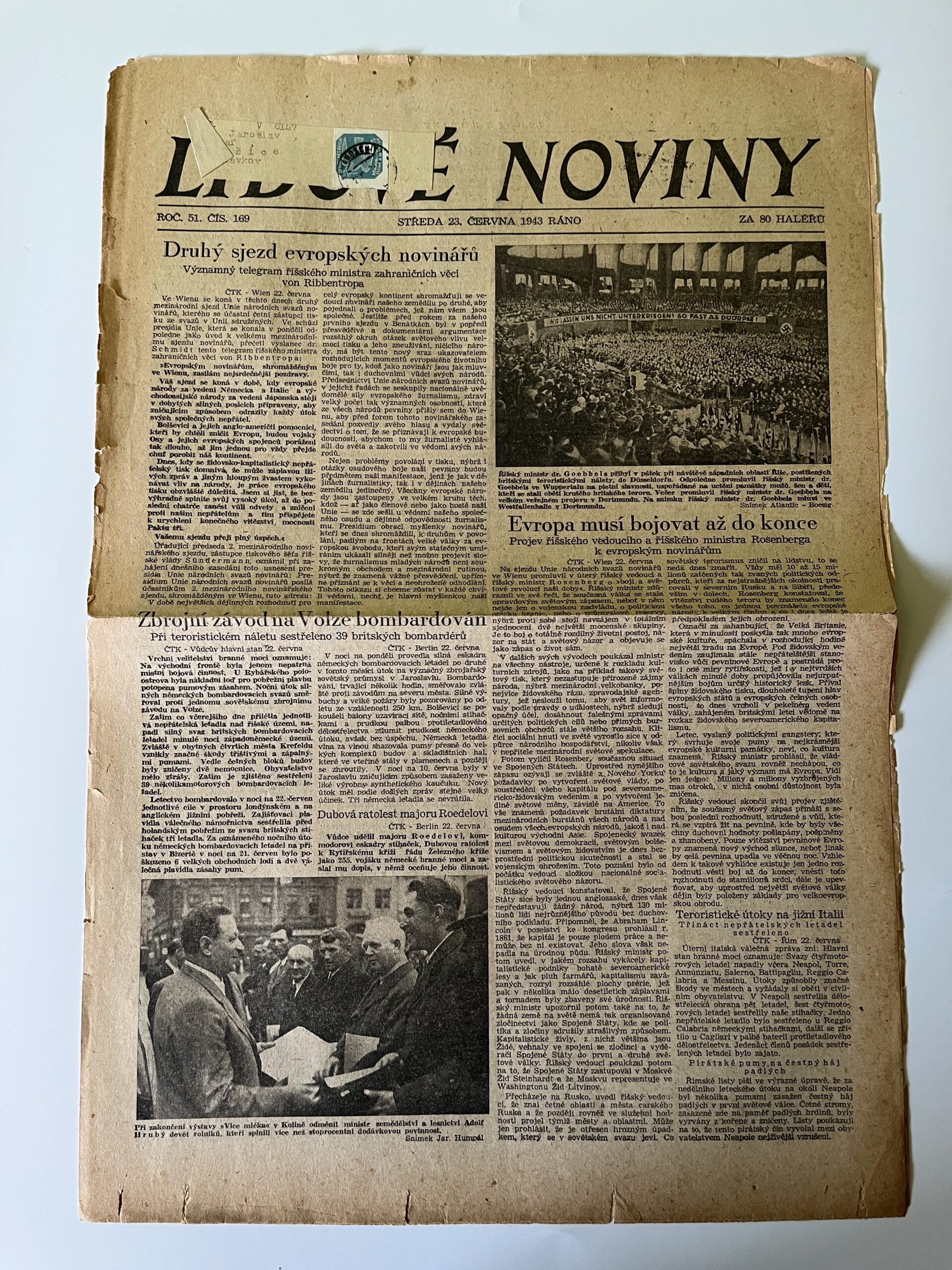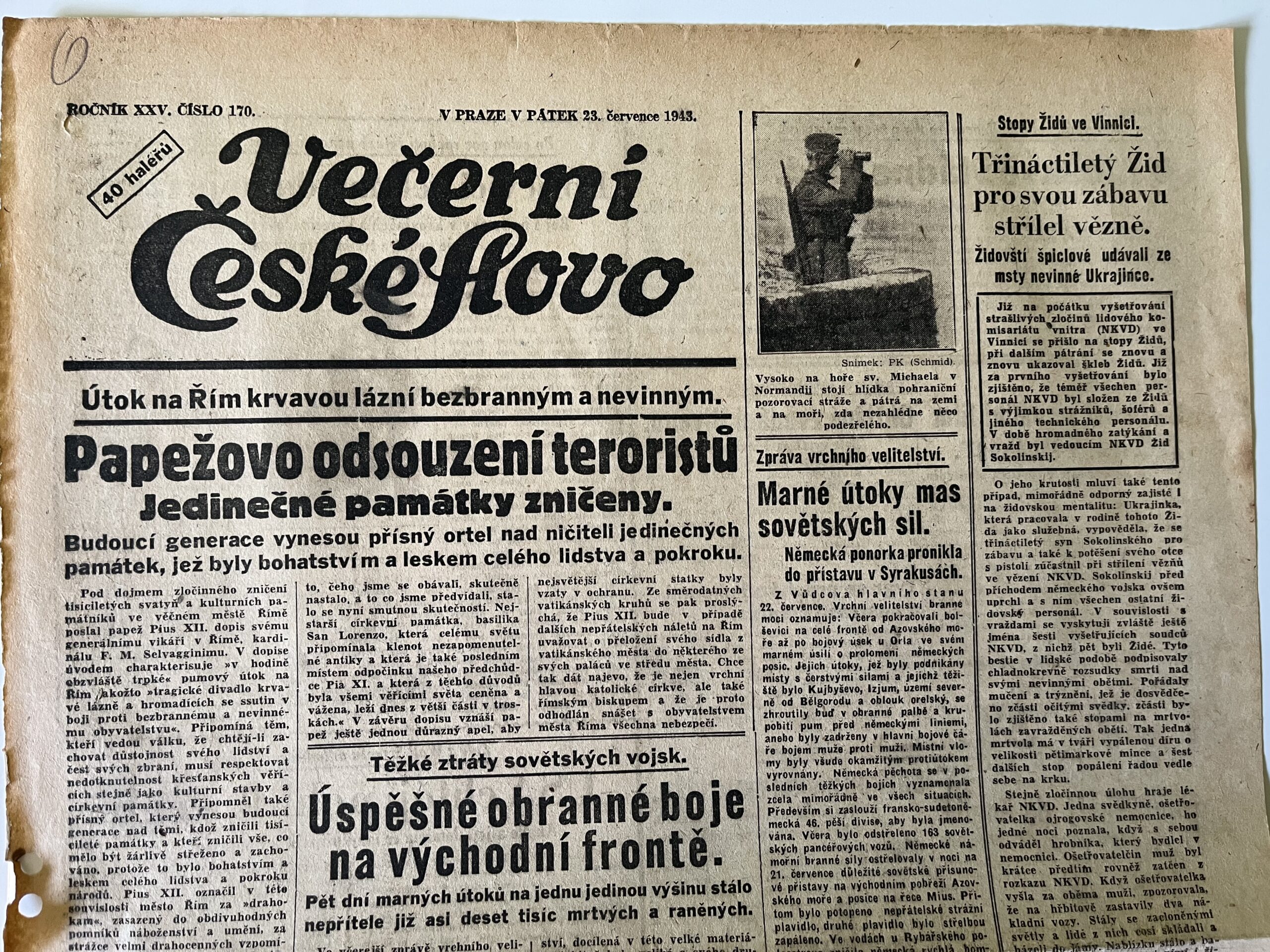 15 (K3-3) Lidové noviny,A-Zet,Český Dělník,Večerní Slovo. Rozměr jedné strany 32 x 47 cm. Set novin obsahují 7 x Lidové noviny, 3.únor 1943 – Vůdce povede Říši k největšímu ze všech vítězství. Prudké obranné boje na východě… aj., 4 strany. 23.května 1943 – Nerozlučná bojová a osudová pospolitost Osy. Sovětské útoky ztroskotaly…aj., 6 listů. 22.června 1943 – Silné tlupy na Černé Hoře zničeny. Sovětům hrozí špatná sklizeň…aj. 4 listy. 23.června 1943 – Druhý sjezd evropských novinářů. Evropa musí bojovat až do konce…aj. 4 strany. 23.července 1943 Všechny útoky bolševiků ztroskotaly. Velké ztráty nepřátel ve Středomoří…aj. 4 strany. 3.srpna 1943 – Marné pokusy o průlom na Sicilii. Eisenhowerovy nesplněné plány…aj. 4 strany. 16.prosince 1943 – Dubová ratolest s meči a brilanty. Říšský ministr dr. Goebbels o situaci…aj.4 strany. 1 x Národní Politika 9.června 1943 – Pádná rána nepřátelské propagandě. Letectvo v německém zbrojení…aj. 2 listy. 1 x Nedělní Slovo 28.listopadu 1943 – Plány USA na vykořisťování světa…aj. 10 stran. 2 x Večerní České Slovo 11.září 1943 – Bezpečná víra ve vítězství Říše. Vůdcův projev o Italii…aj. 4 strany. 23.července 1943 – Papežovo odsouzení teroristů…aj. 1 list. 1 x Národní Práce 19.prosince 1943 – NOÚZ, Úspěšná obrana a protiútoky na východě…aj. 8 stran. 4 x A – Zet 15.července 1 list, 16. července 1 list, 28.prosince 1943 1 list, 29.prosince 1943 1 list. 1 x Moravské noviny 23.srpna 1943 – 266 bolševických pancéřů zničeno. Palestinský problém…aj. 2 listy, v přehybu poškozeny. 1 x Český dělník 2.prosince 1943 – Gigant – ME 323…aj. 4 listy, v přehybu poškozeny.