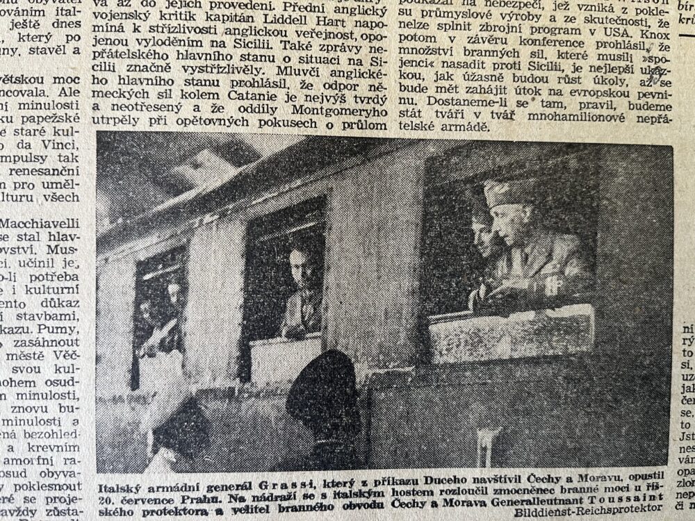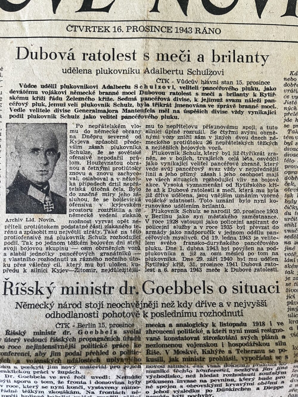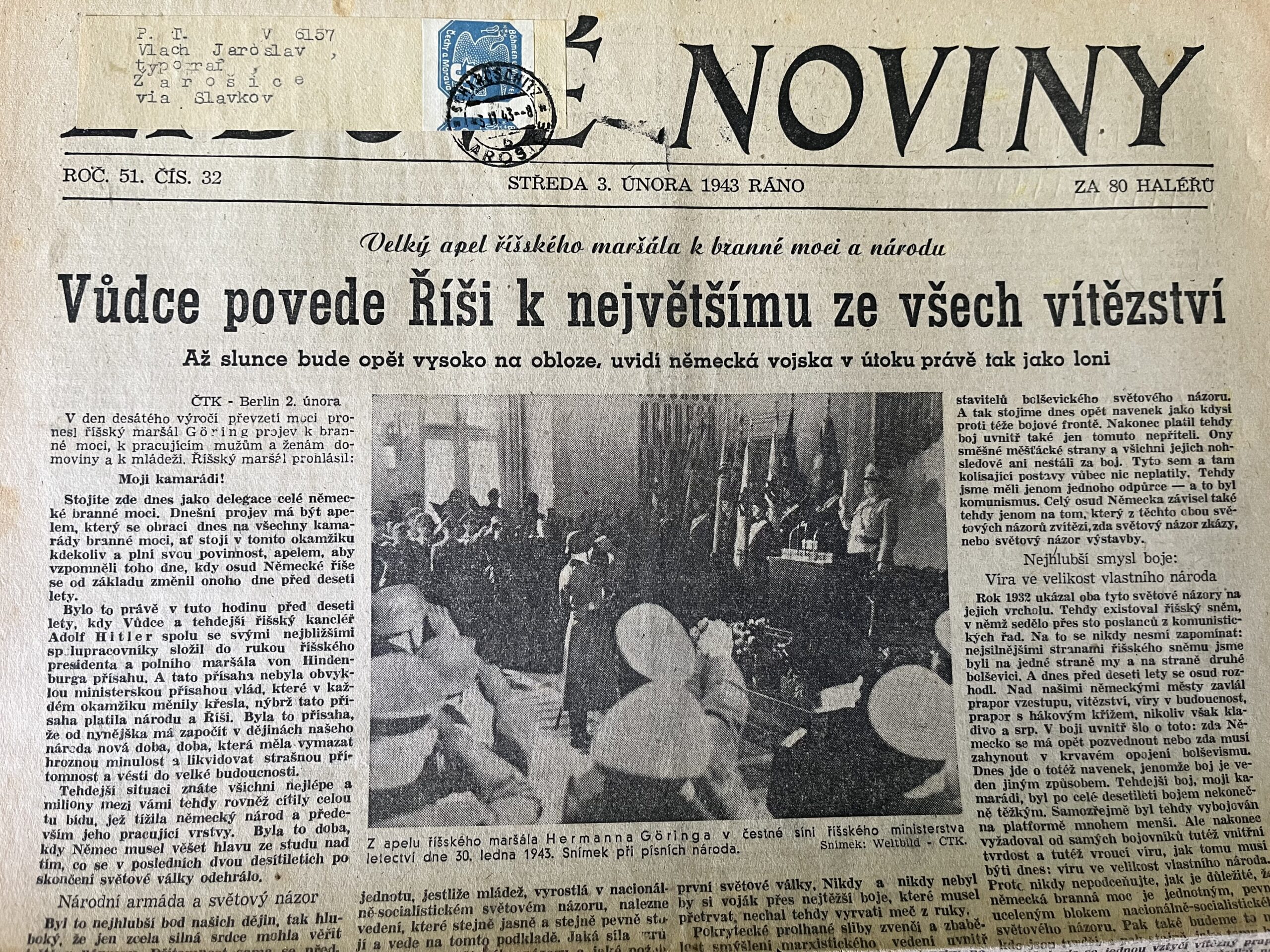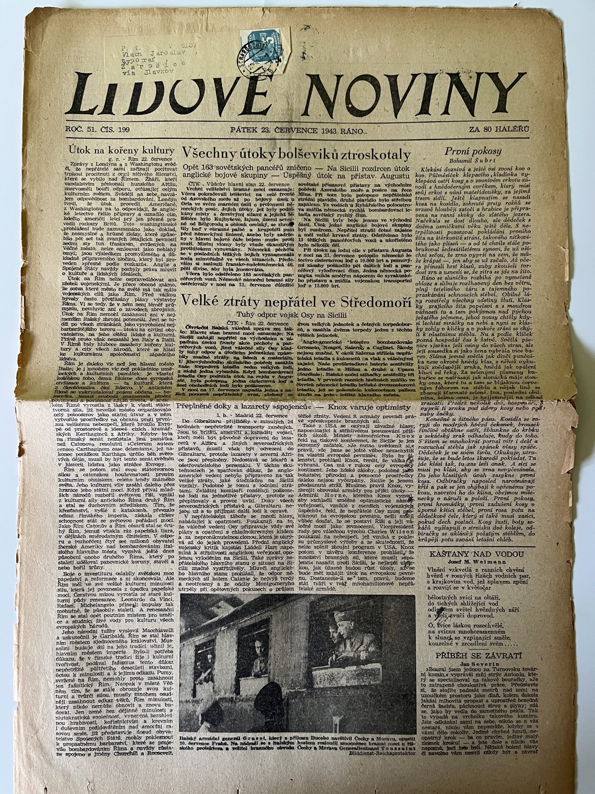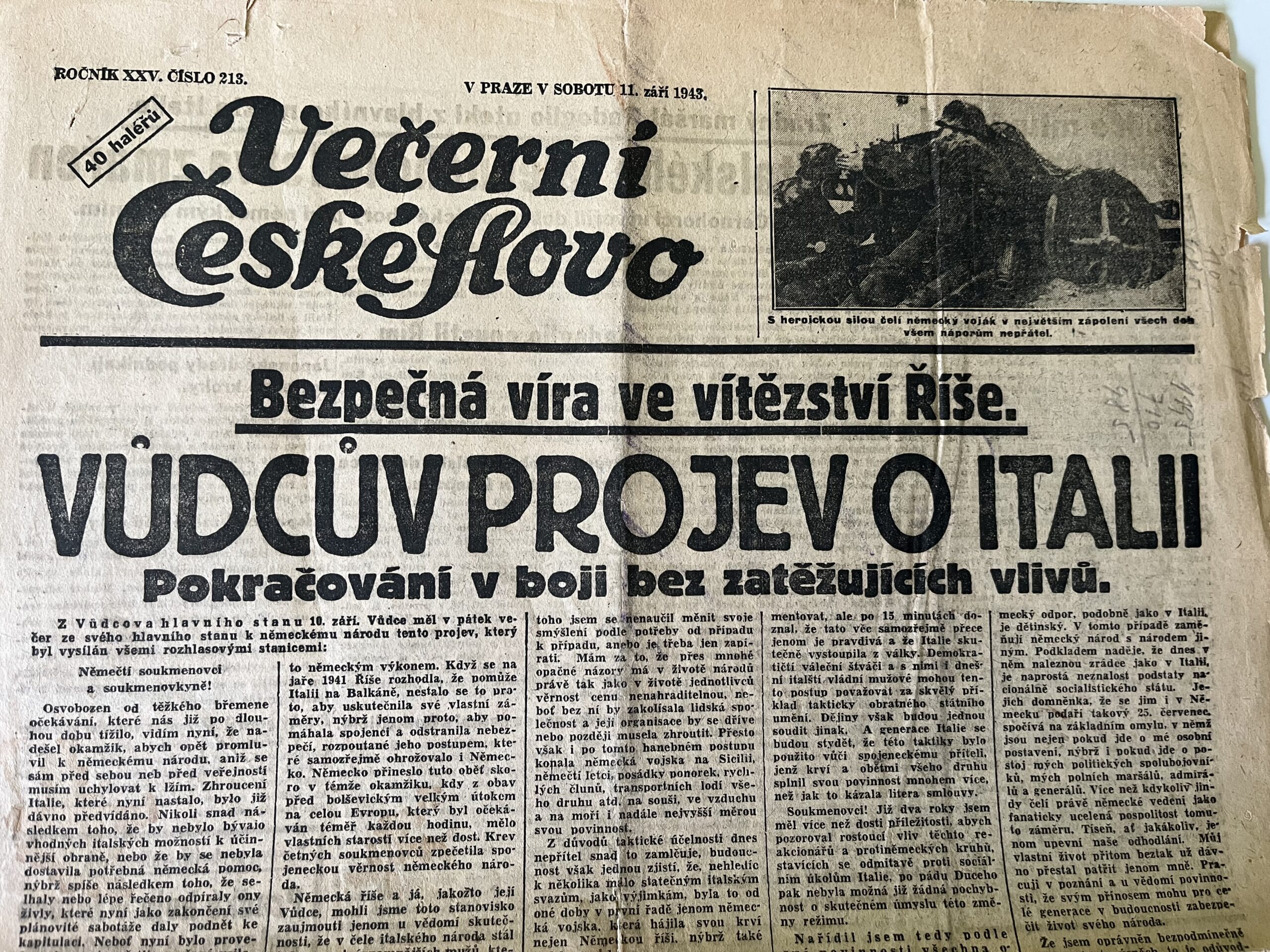 15 (K3-3) Lidové noviny,A-Zet,Český Dělník,Večerní Slovo. Rozměr jedné strany 32 x 47 cm. Set novin obsahují 7 x Lidové noviny, 3.únor 1943 – Vůdce povede Říši k největšímu ze všech vítězství. Prudké obranné boje na východě… aj., 4 strany. 23.května 1943 – Nerozlučná bojová a osudová pospolitost Osy. Sovětské útoky ztroskotaly…aj., 6 listů. 22.června 1943 – Silné tlupy na Černé Hoře zničeny. Sovětům hrozí špatná sklizeň…aj. 4 listy. 23.června 1943 – Druhý sjezd evropských novinářů. Evropa musí bojovat až do konce…aj. 4 strany. 23.července 1943 Všechny útoky bolševiků ztroskotaly. Velké ztráty nepřátel ve Středomoří…aj. 4 strany. 3.srpna 1943 – Marné pokusy o průlom na Sicilii. Eisenhowerovy nesplněné plány…aj. 4 strany. 16.prosince 1943 – Dubová ratolest s meči a brilanty. Říšský ministr dr. Goebbels o situaci…aj.4 strany. 1 x Národní Politika 9.června 1943 – Pádná rána nepřátelské propagandě. Letectvo v německém zbrojení…aj. 2 listy. 1 x Nedělní Slovo 28.listopadu 1943 – Plány USA na vykořisťování světa…aj. 10 stran. 2 x Večerní České Slovo 11.září 1943 – Bezpečná víra ve vítězství Říše. Vůdcův projev o Italii…aj. 4 strany. 23.července 1943 – Papežovo odsouzení teroristů…aj. 1 list. 1 x Národní Práce 19.prosince 1943 – NOÚZ, Úspěšná obrana a protiútoky na východě…aj. 8 stran. 4 x A – Zet 15.července 1 list, 16. července 1 list, 28.prosince 1943 1 list, 29.prosince 1943 1 list. 1 x Moravské noviny 23.srpna 1943 – 266 bolševických pancéřů zničeno. Palestinský problém…aj. 2 listy, v přehybu poškozeny. 1 x Český dělník 2.prosince 1943 – Gigant – ME 323…aj. 4 listy, v přehybu poškozeny.
