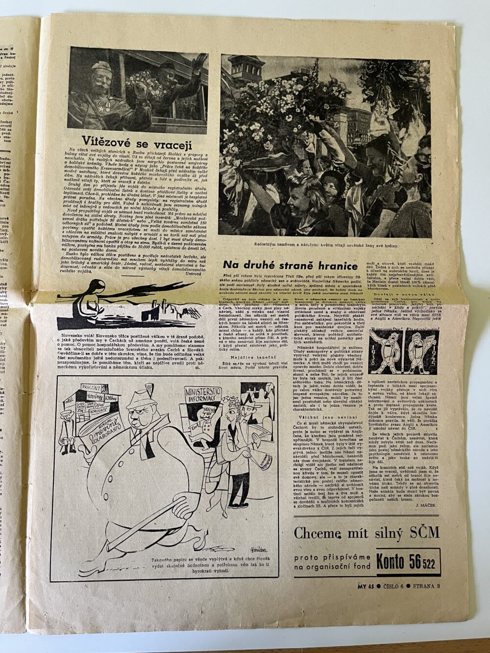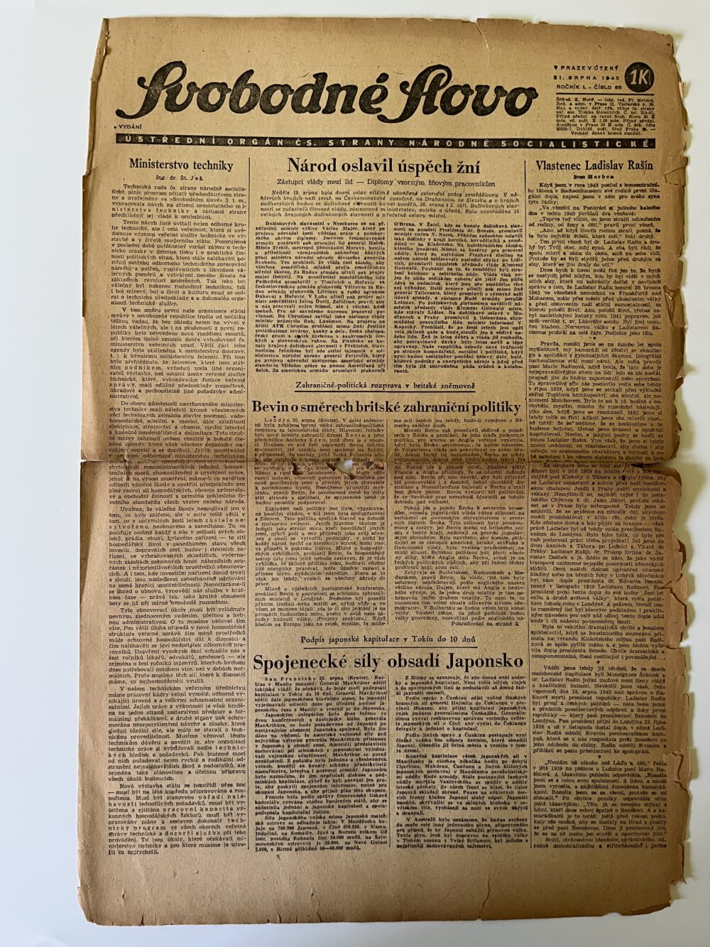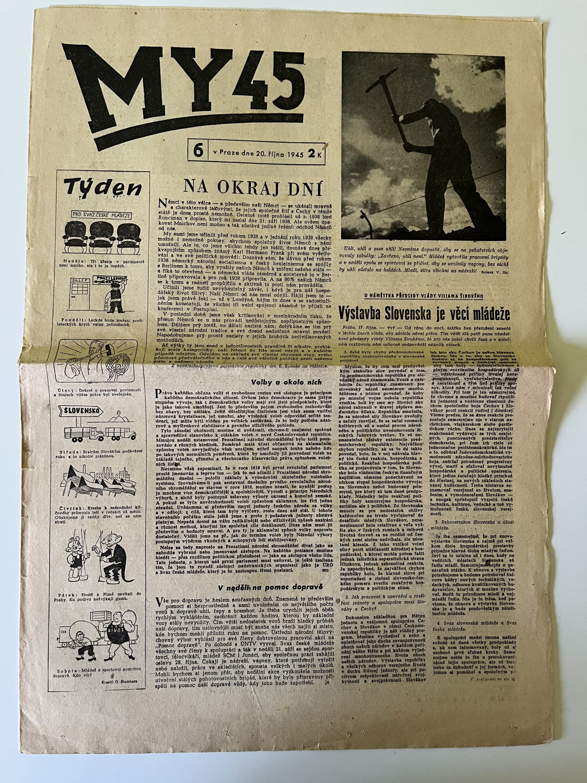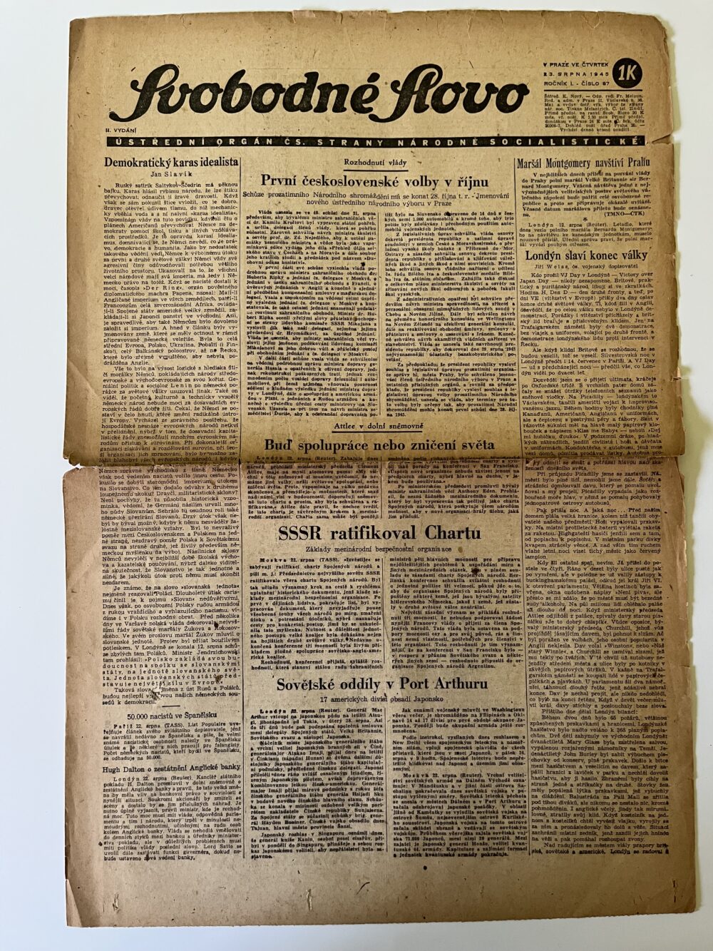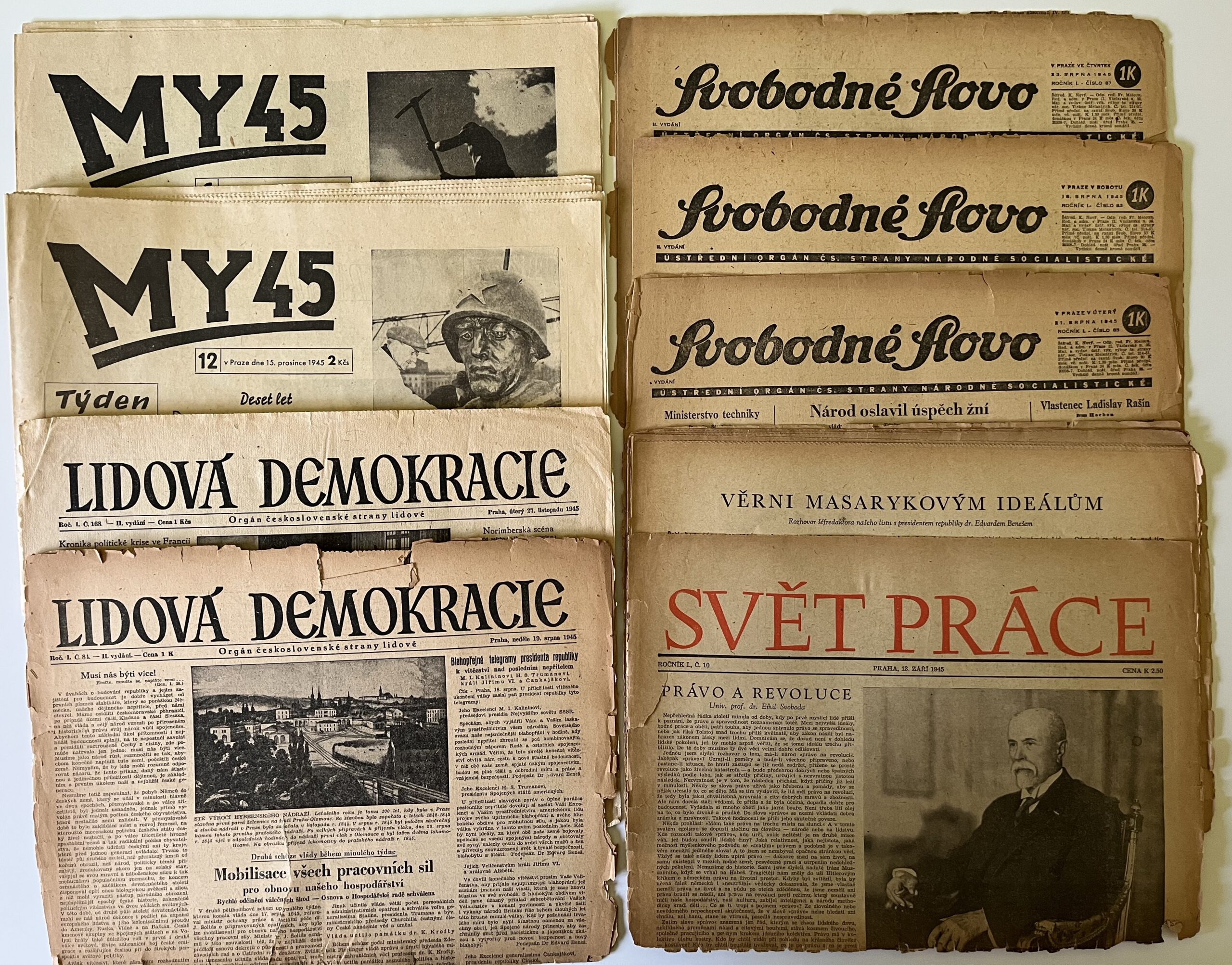7 (K3-3) MY 45,Svobodné Slovo,Svět práce,Lidová demokr. Rozměr jedné strany 32 x 47 cm. Celek novin obsahuje Svět práce 13.září 1945 – Právo a revoluce. Masarykův odkaz. Věrni Masarykovým ideálům. T.G.M v tělovýchově…aj. 8 listů. 2 x Lidová demokracie 19.srpna 1945 Mobilisace všech pracovních sil…aj. 1 list. 27.listopadu 1945 První svobodné volby v Rakousku od r.1930. Norimberská scéna…aj. 1 list. 3 x Svobodné Slovo – První československé volby v říjnu. Buď spolupráce nebo zničení světa…aj. 4 strany. Svobodné Slovo 18.srpna 1945 – Jdeme za ideálem lidové demokracie. Poselství amerických krajanů národu…aj. 4 strany. Svobodné Slovo 21.srpna 1945 – Národ oslavil úspěch žní. Vlastenec Ladislav Rašín…aj. 4 strany. 2 x MY45 15.prosince 1945 – Deset let. Pro stát a národ…aj. 12 stran, hezký stav. MY45 20.října 1945 – Na okraj dní. Volby a okolo nich. Výstavba Slovenska je věcí mládeže…aj.6 stran, zachovalý stav. Některé noviny jsou v přehybu poškozené.