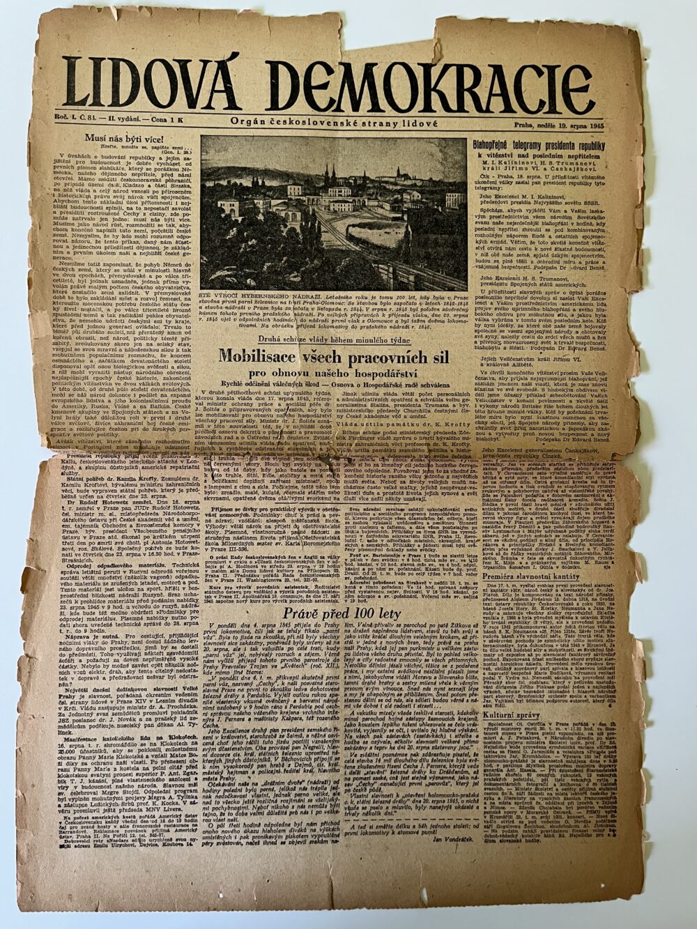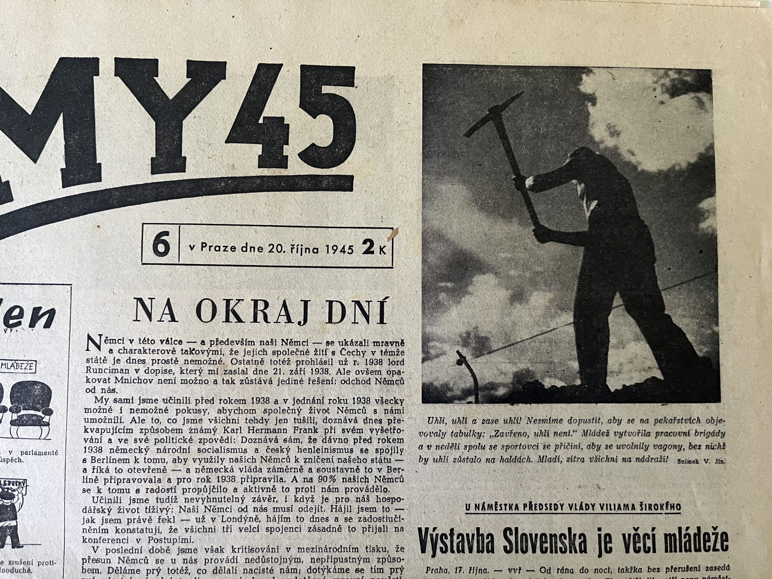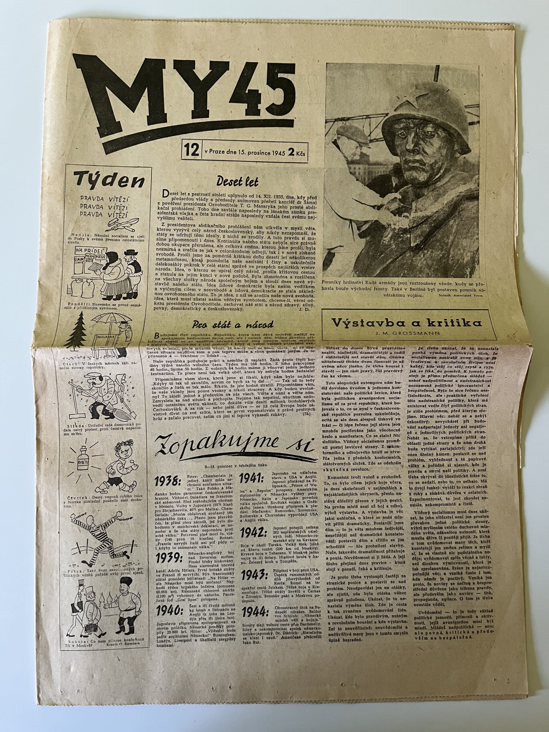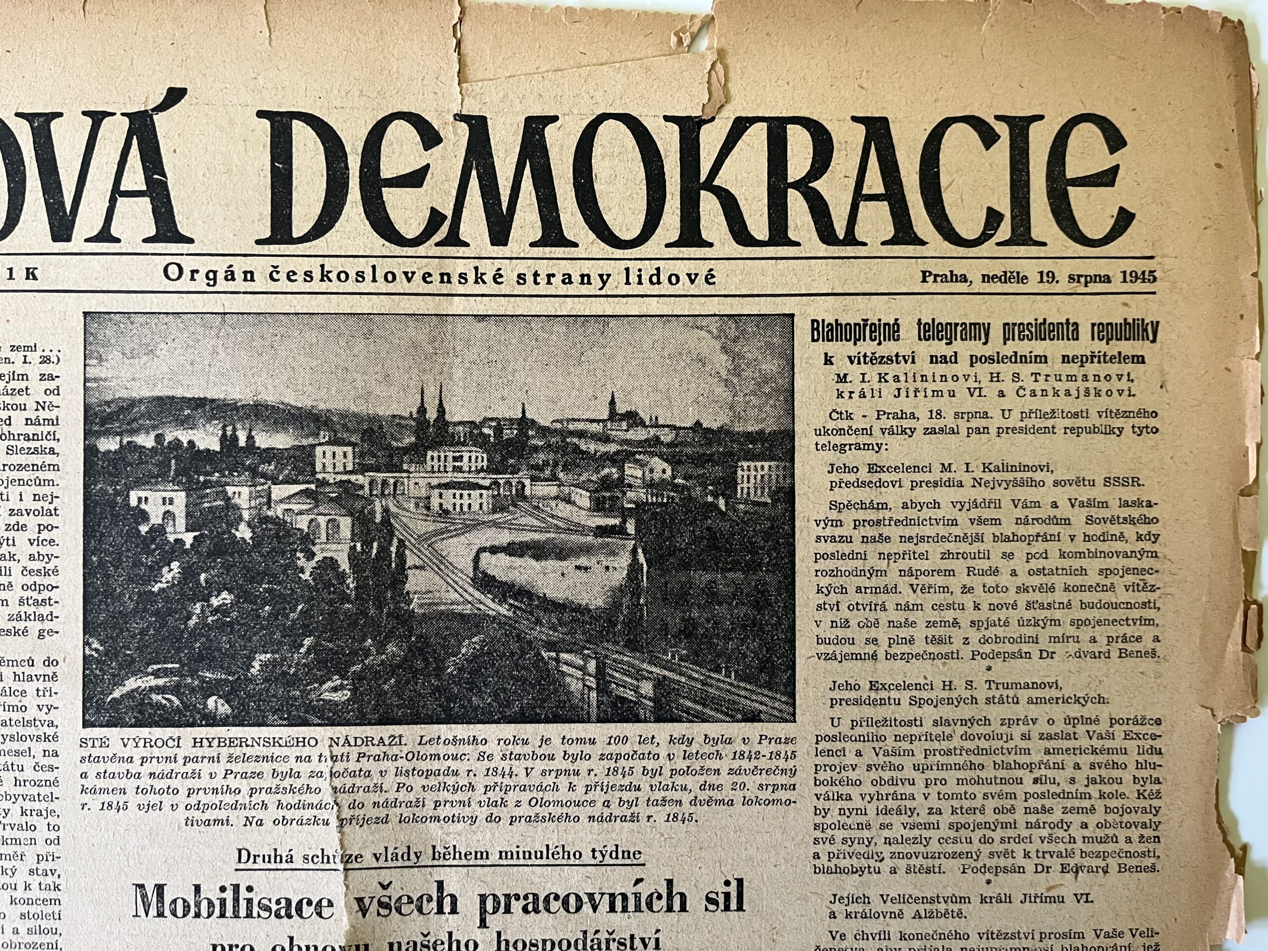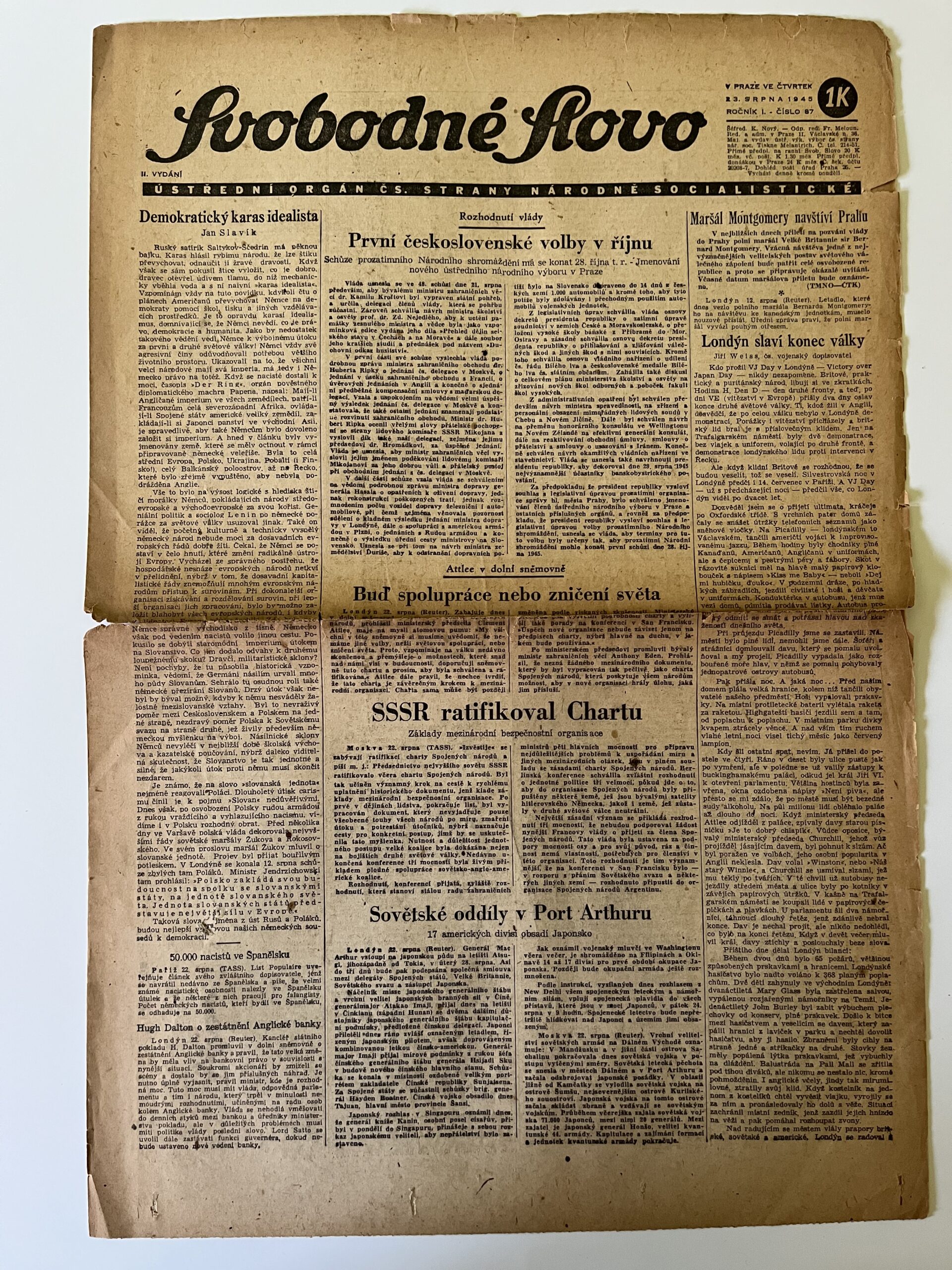 7 (K3-3) MY 45,Svobodné Slovo,Svět práce,Lidová demokr. Rozměr jedné strany 32 x 47 cm. Celek novin obsahuje Svět práce 13.září 1945 – Právo a revoluce. Masarykův odkaz. Věrni Masarykovým ideálům. T.G.M v tělovýchově…aj. 8 listů. 2 x Lidová demokracie 19.srpna 1945 Mobilisace všech pracovních sil…aj. 1 list. 27.listopadu 1945 První svobodné volby v Rakousku od r.1930. Norimberská scéna…aj. 1 list. 3 x Svobodné Slovo – První československé volby v říjnu. Buď spolupráce nebo zničení světa…aj. 4 strany. Svobodné Slovo 18.srpna 1945 – Jdeme za ideálem lidové demokracie. Poselství amerických krajanů národu…aj. 4 strany. Svobodné Slovo 21.srpna 1945 – Národ oslavil úspěch žní. Vlastenec Ladislav Rašín…aj. 4 strany. 2 x MY45 15.prosince 1945 – Deset let. Pro stát a národ…aj. 12 stran, hezký stav. MY45 20.října 1945 – Na okraj dní. Volby a okolo nich. Výstavba Slovenska je věcí mládeže…aj.6 stran, zachovalý stav. Některé noviny jsou v přehybu poškozené.