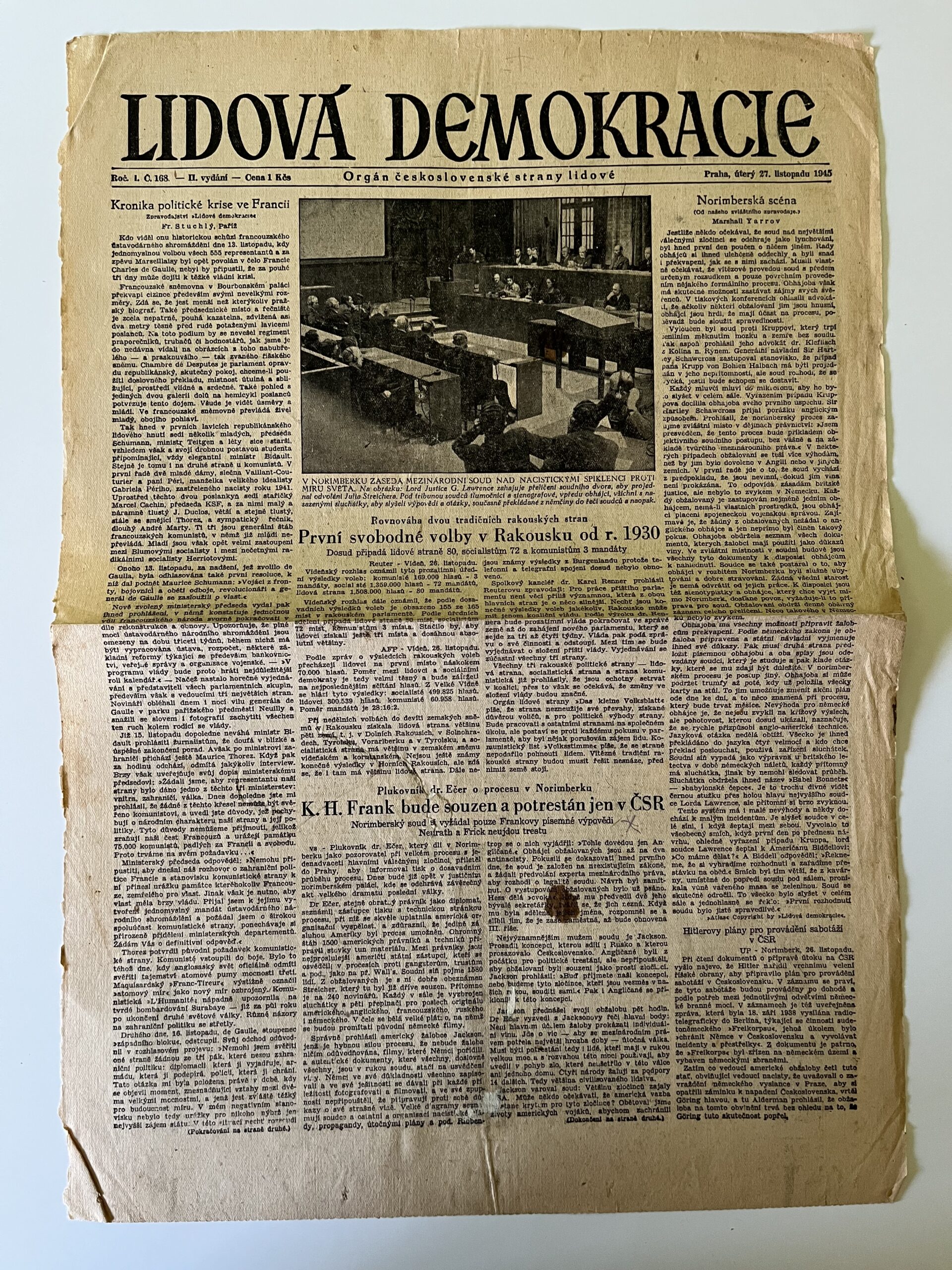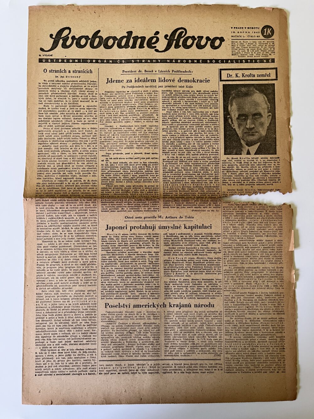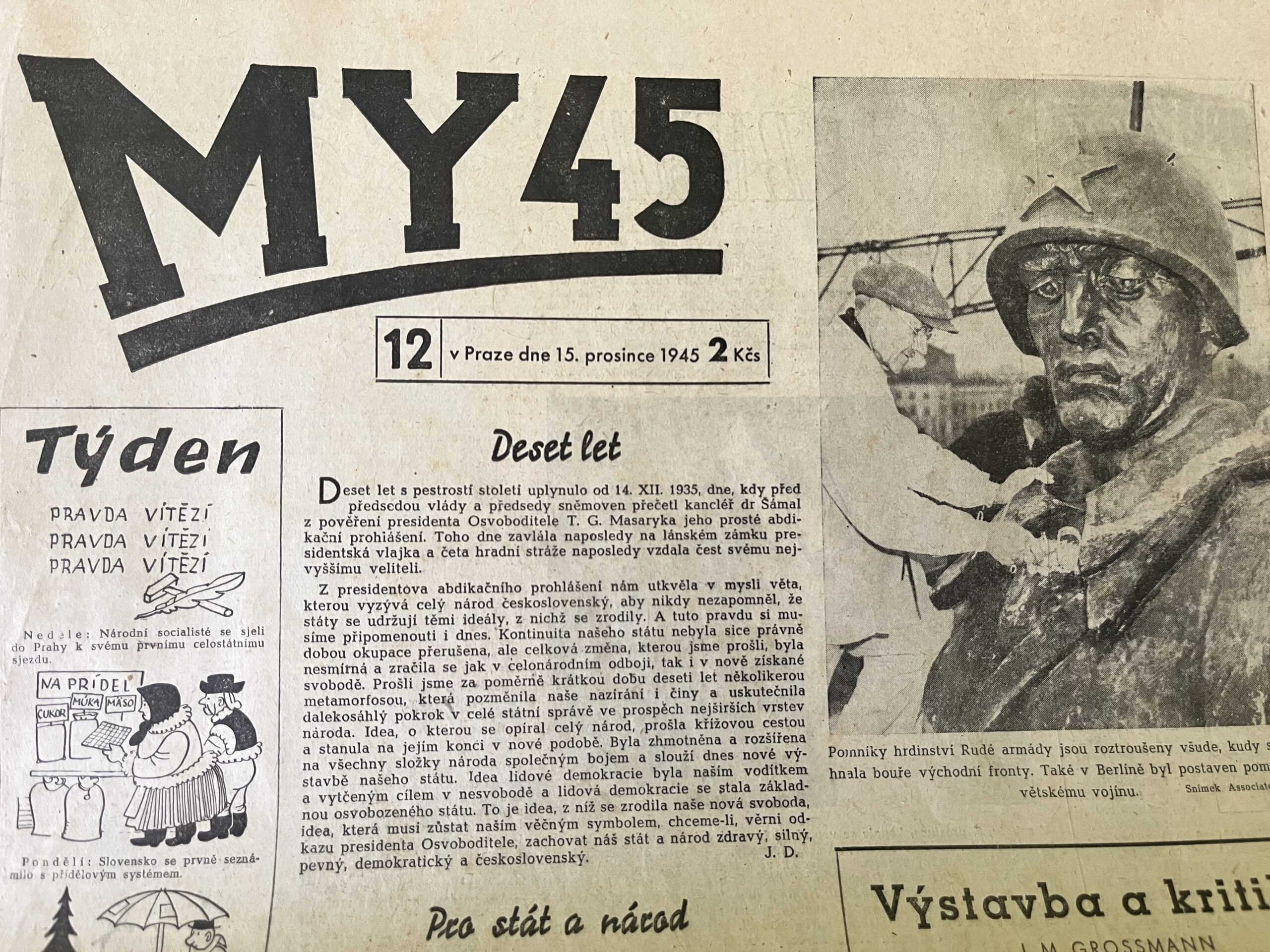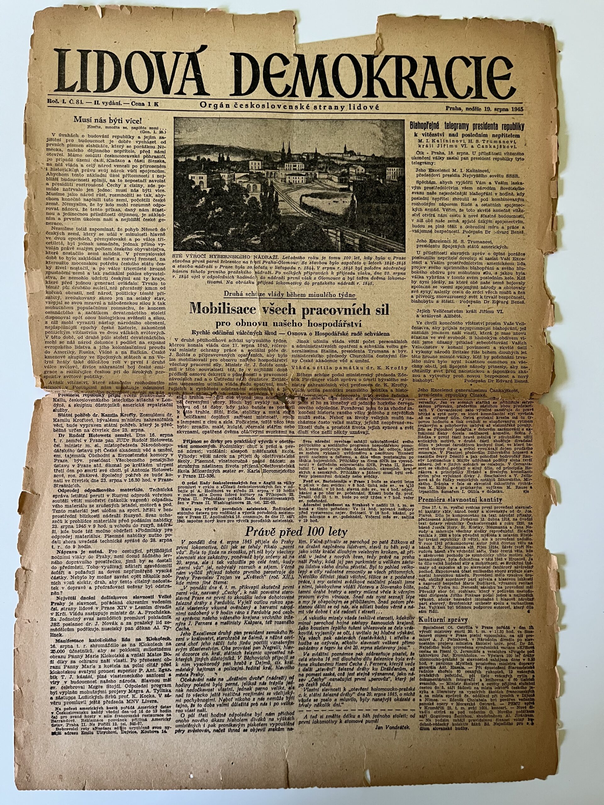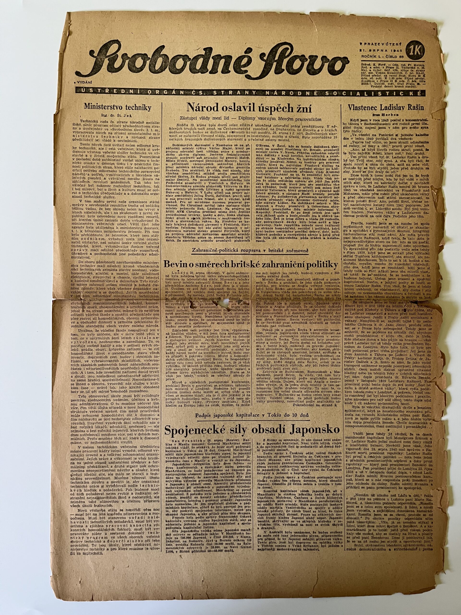 7 (K3-3) MY 45,Svobodné Slovo,Svět práce,Lidová demokr. Rozměr jedné strany 32 x 47 cm. Celek novin obsahuje Svět práce 13.září 1945 – Právo a revoluce. Masarykův odkaz. Věrni Masarykovým ideálům. T.G.M v tělovýchově…aj. 8 listů. 2 x Lidová demokracie 19.srpna 1945 Mobilisace všech pracovních sil…aj. 1 list. 27.listopadu 1945 První svobodné volby v Rakousku od r.1930. Norimberská scéna…aj. 1 list. 3 x Svobodné Slovo – První československé volby v říjnu. Buď spolupráce nebo zničení světa…aj. 4 strany. Svobodné Slovo 18.srpna 1945 – Jdeme za ideálem lidové demokracie. Poselství amerických krajanů národu…aj. 4 strany. Svobodné Slovo 21.srpna 1945 – Národ oslavil úspěch žní. Vlastenec Ladislav Rašín…aj. 4 strany. 2 x MY45 15.prosince 1945 – Deset let. Pro stát a národ…aj. 12 stran, hezký stav. MY45 20.října 1945 – Na okraj dní. Volby a okolo nich. Výstavba Slovenska je věcí mládeže…aj.6 stran, zachovalý stav. Některé noviny jsou v přehybu poškozené.