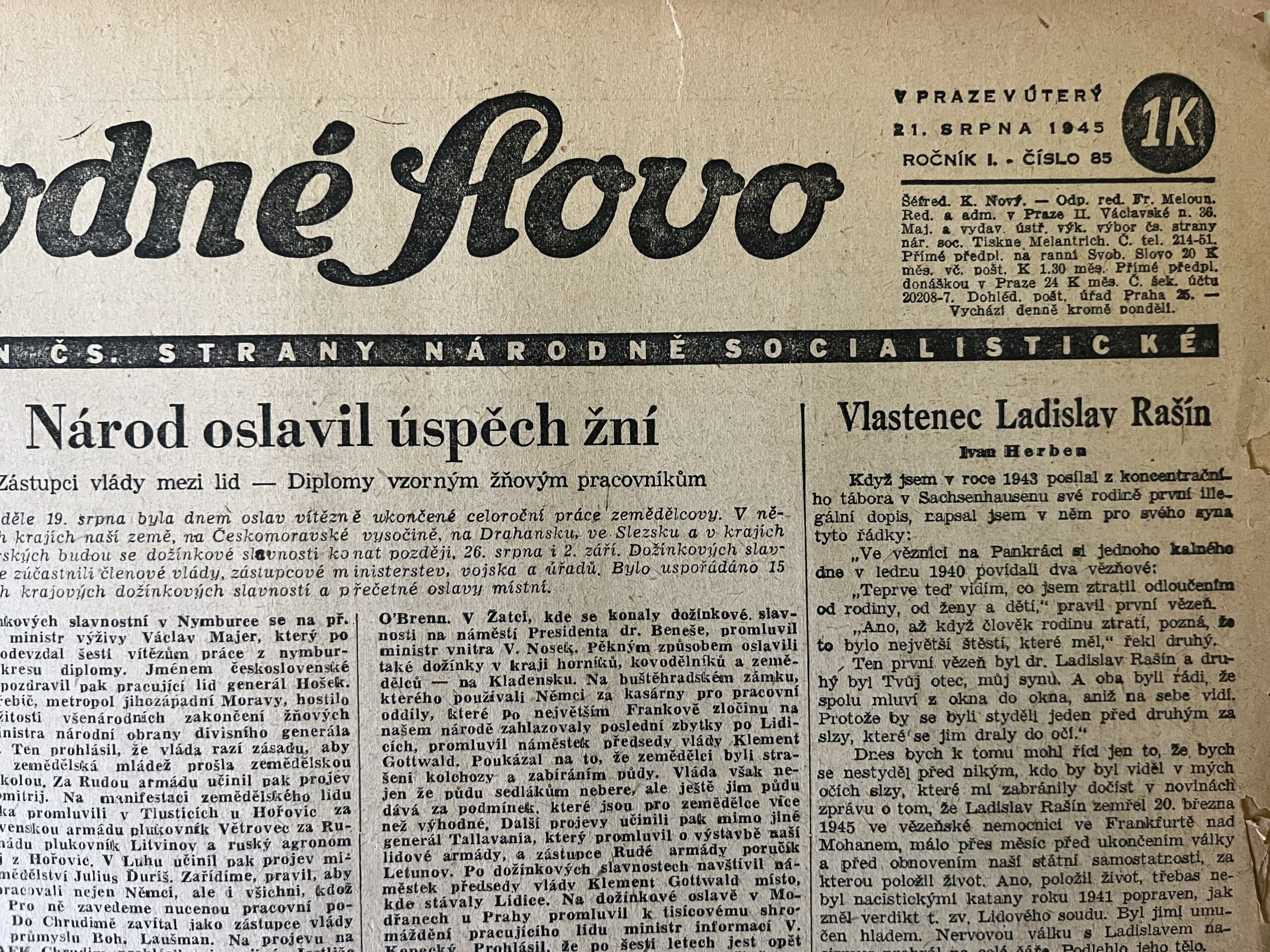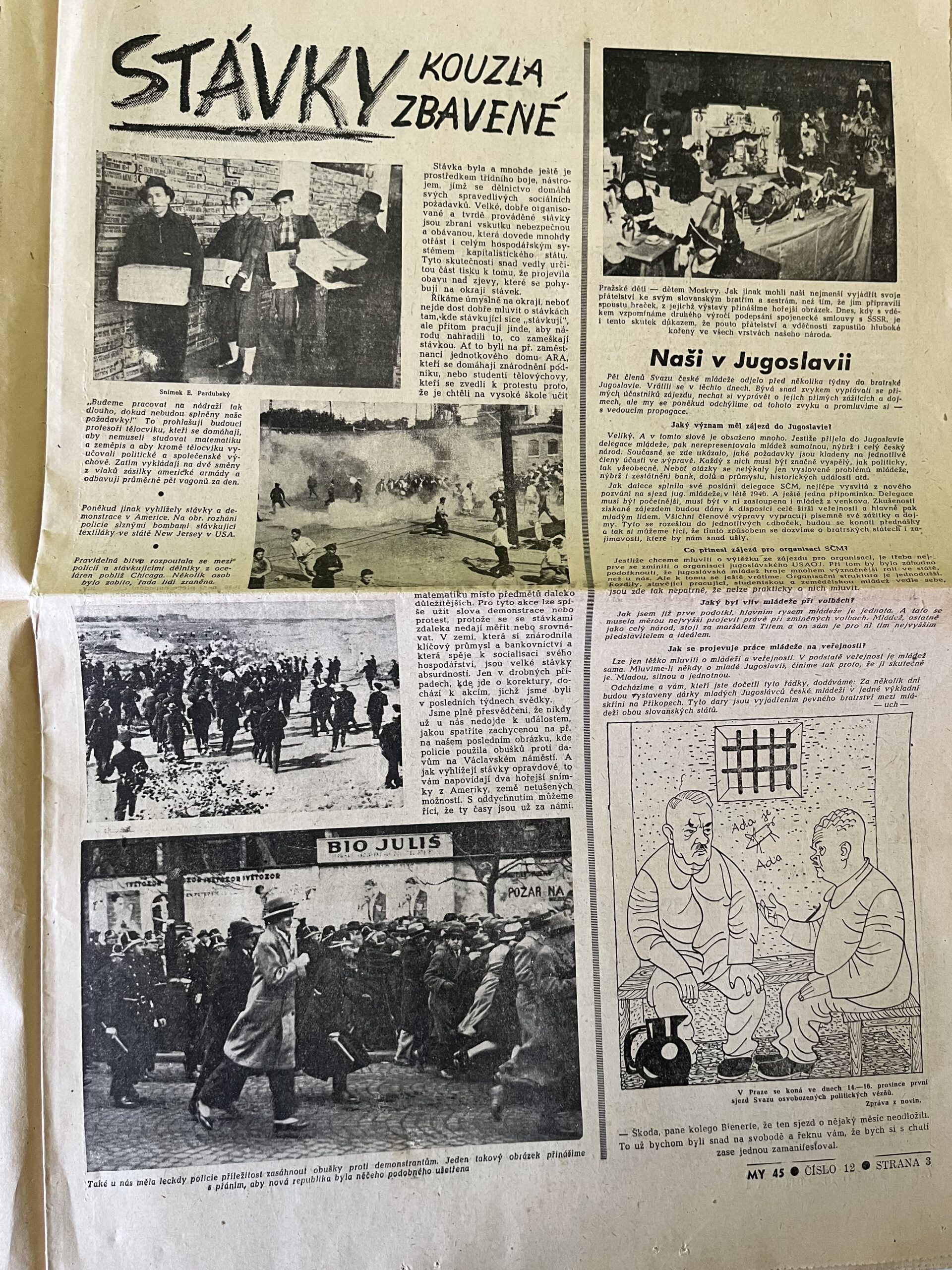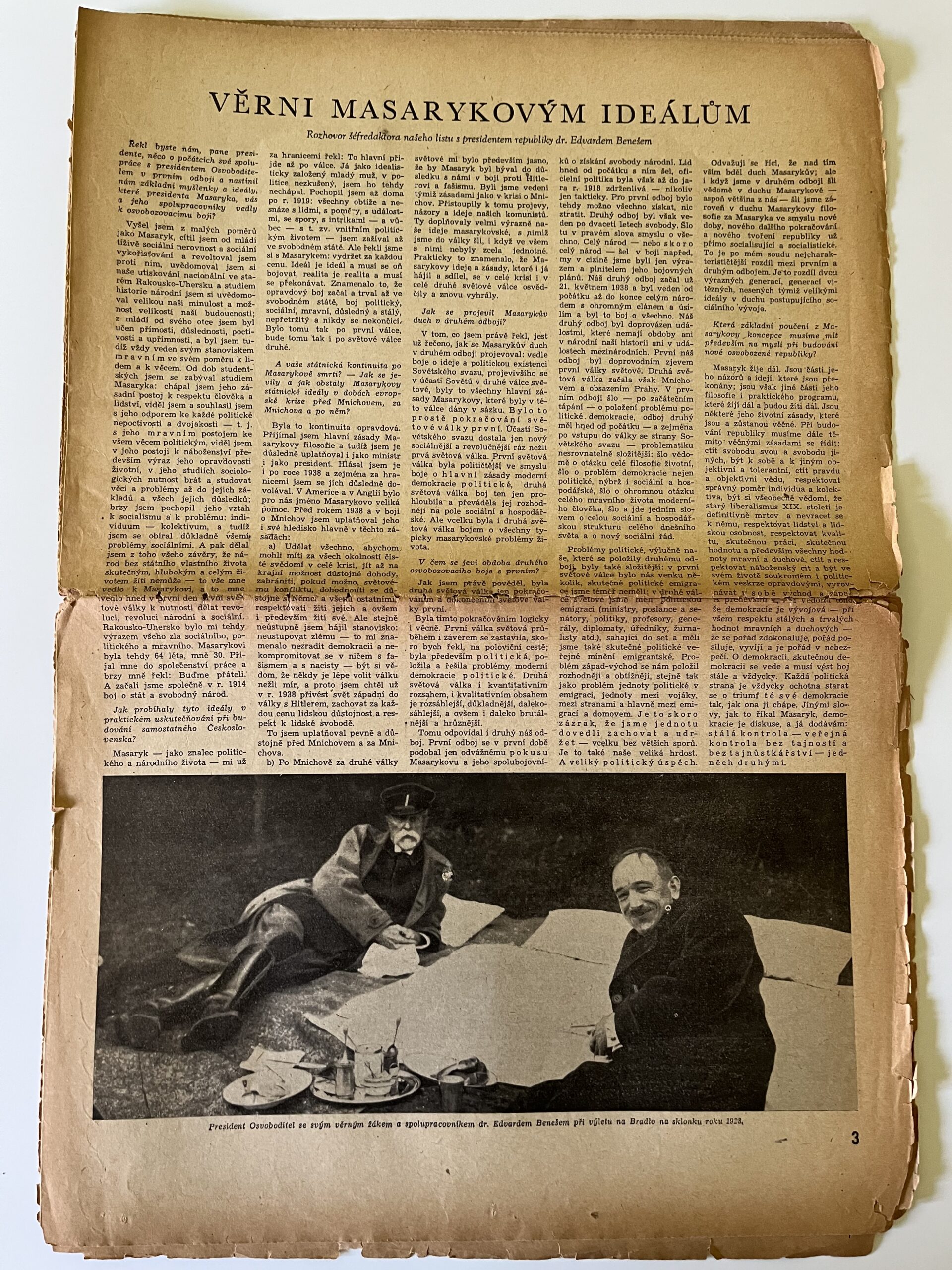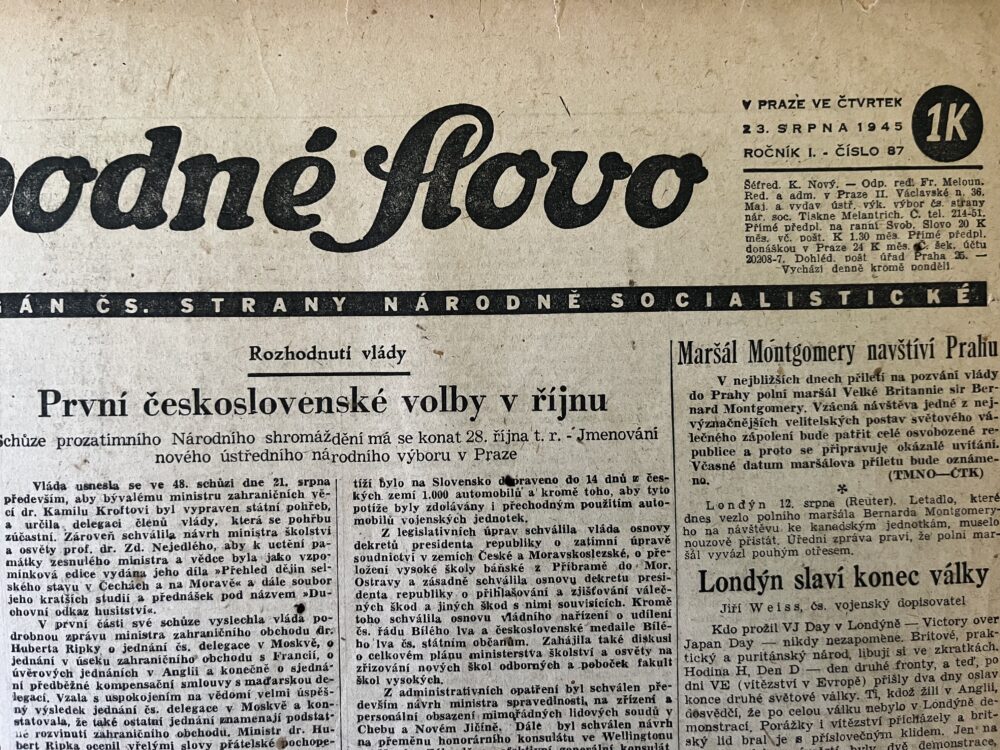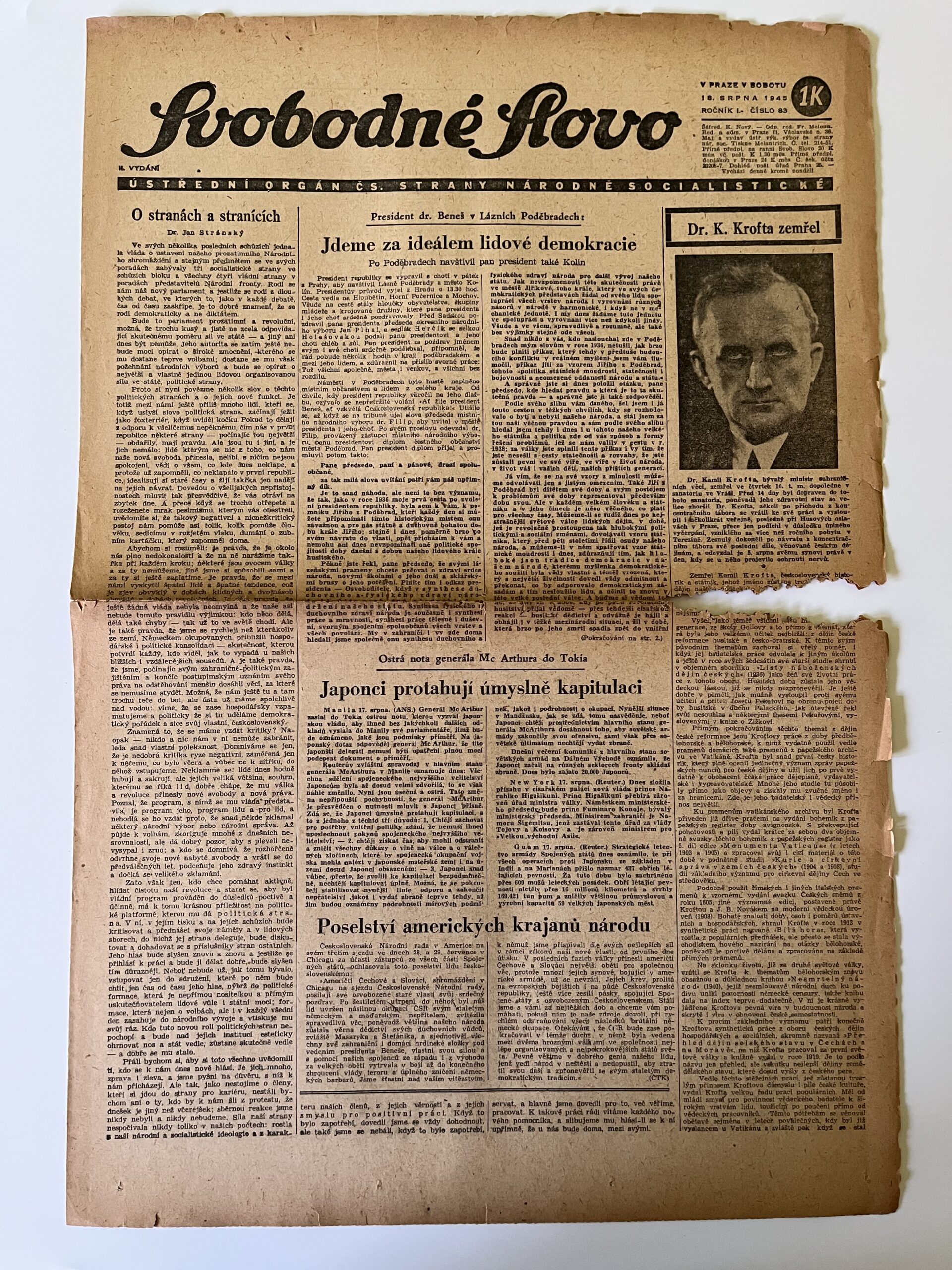 7 (K3-3) MY 45,Svobodné Slovo,Svět práce,Lidová demokr. Rozměr jedné strany 32 x 47 cm. Celek novin obsahuje Svět práce 13.září 1945 – Právo a revoluce. Masarykův odkaz. Věrni Masarykovým ideálům. T.G.M v tělovýchově…aj. 8 listů. 2 x Lidová demokracie 19.srpna 1945 Mobilisace všech pracovních sil…aj. 1 list. 27.listopadu 1945 První svobodné volby v Rakousku od r.1930. Norimberská scéna…aj. 1 list. 3 x Svobodné Slovo – První československé volby v říjnu. Buď spolupráce nebo zničení světa…aj. 4 strany. Svobodné Slovo 18.srpna 1945 – Jdeme za ideálem lidové demokracie. Poselství amerických krajanů národu…aj. 4 strany. Svobodné Slovo 21.srpna 1945 – Národ oslavil úspěch žní. Vlastenec Ladislav Rašín…aj. 4 strany. 2 x MY45 15.prosince 1945 – Deset let. Pro stát a národ…aj. 12 stran, hezký stav. MY45 20.října 1945 – Na okraj dní. Volby a okolo nich. Výstavba Slovenska je věcí mládeže…aj.6 stran, zachovalý stav. Některé noviny jsou v přehybu poškozené.