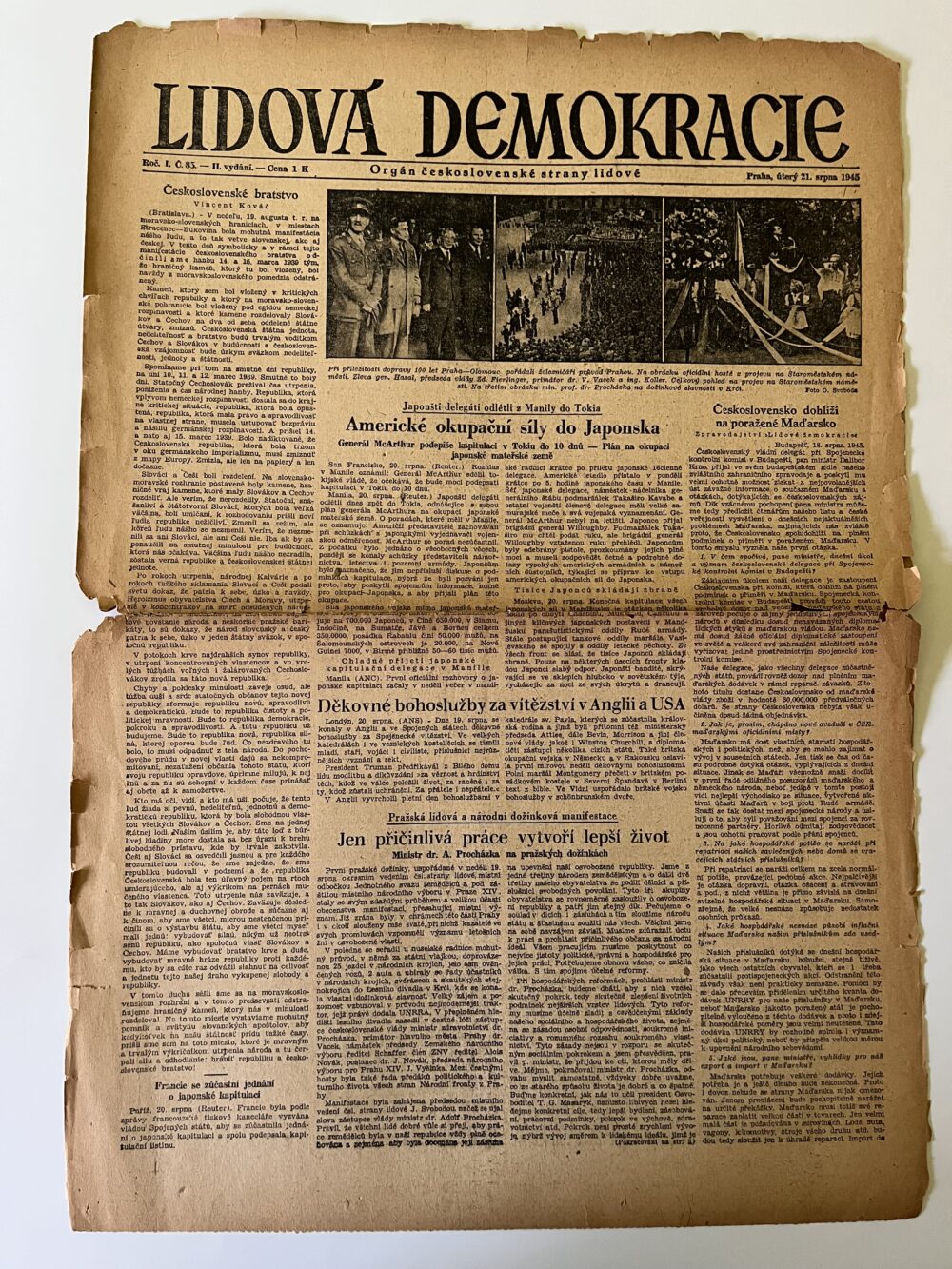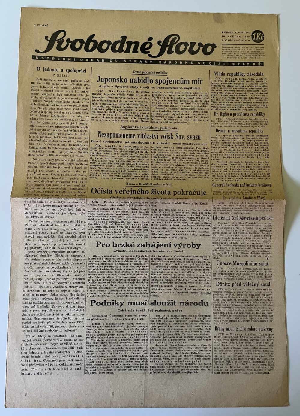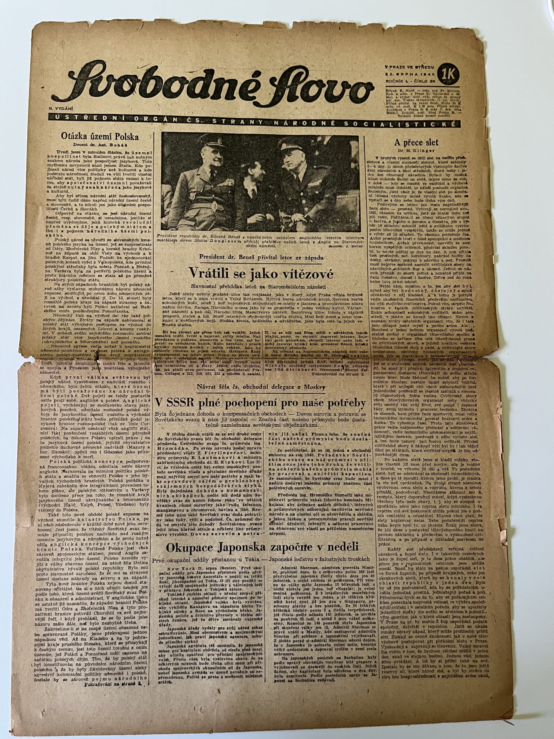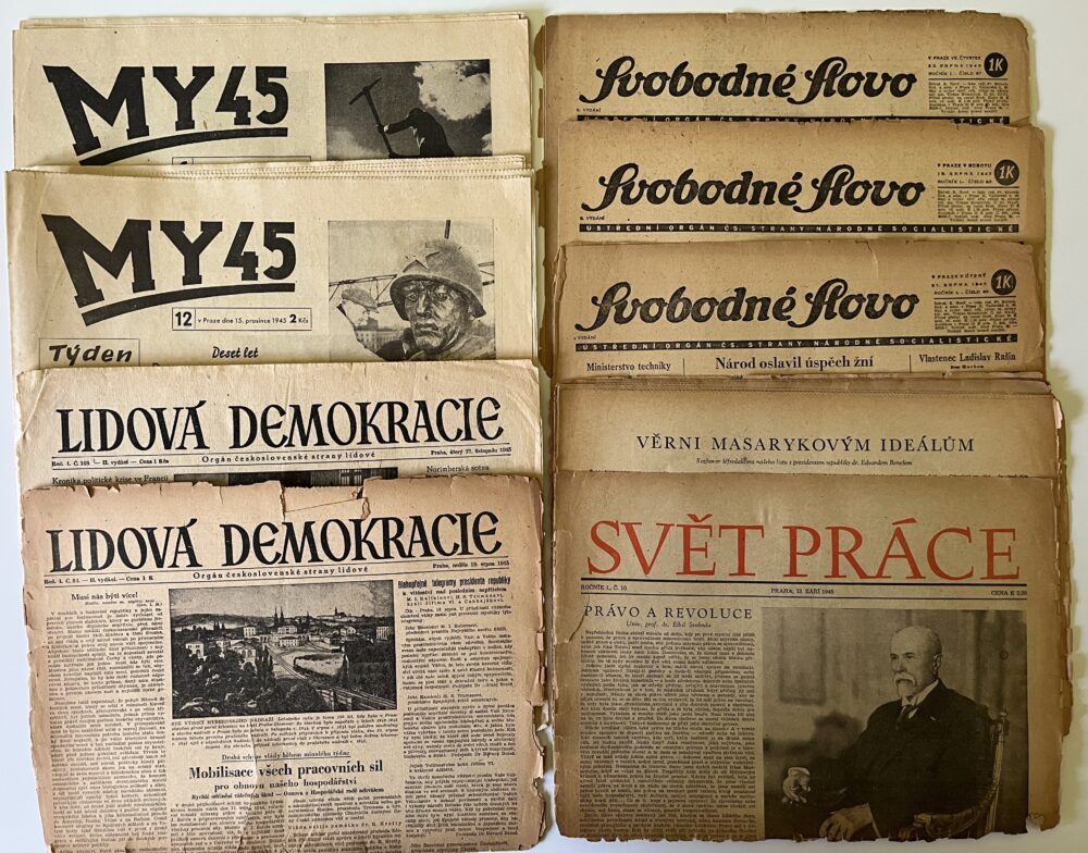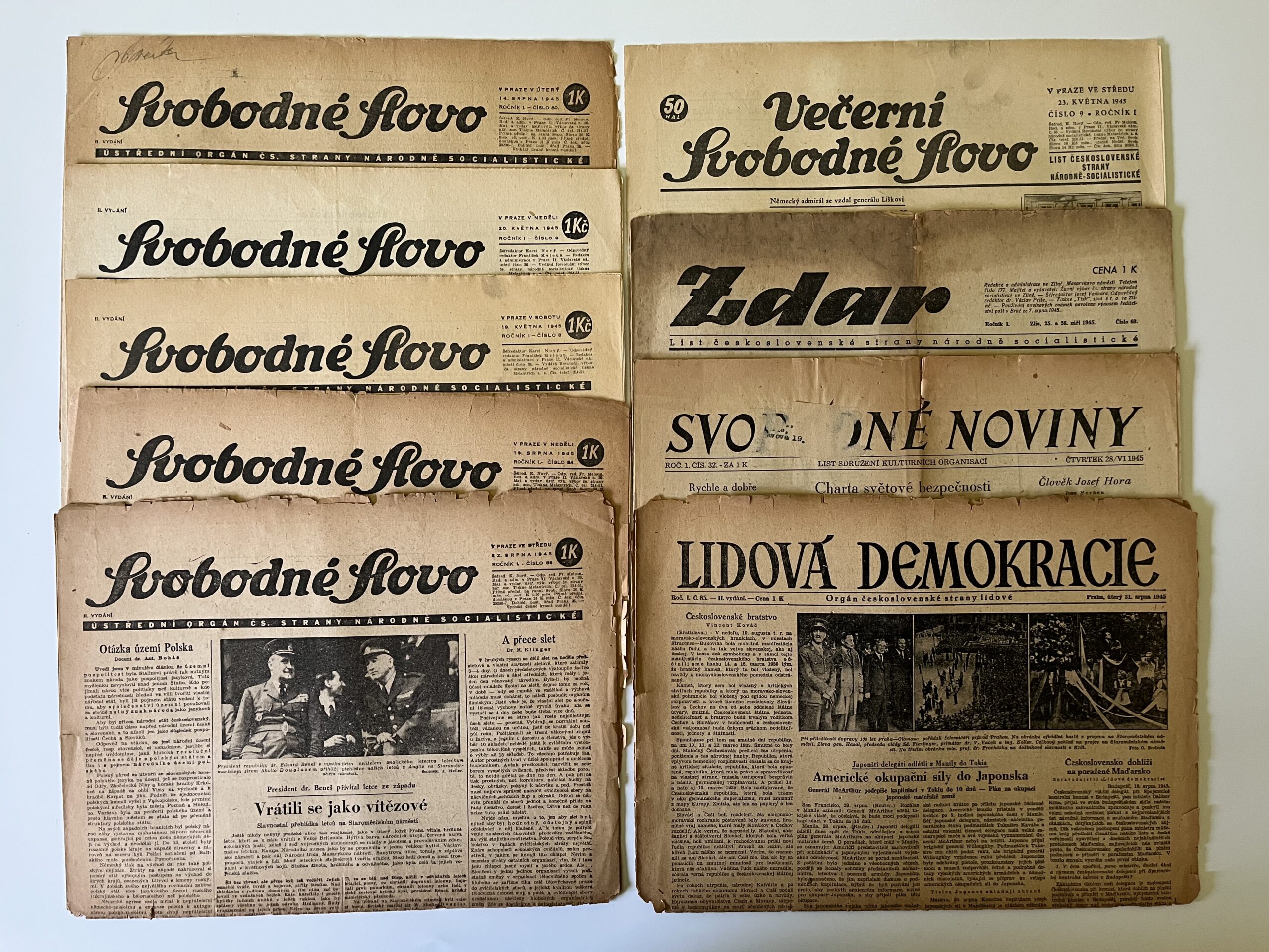 8 (K3-3) Svobodné Slovo,Zdar,Lidová demokracie. Rozměr jedné strany 32 x 47 cm. Celek novin obsahuje 5 x Svobodné Slovo 14.srpna 1945 – Vracejí se nejhrdinnější synové po šesti letech doma…aj., 4 strany. Svobodné Slovo 20.května 1945 – Do Národních výborů pracovníky z odboje. Všichni do radostné práce. Čeští vlastenci se vracejí…aj., 4 strany. Svobodné Slovo 19.května 1945 – Očista veřejného života pokračuje. Podniky musí sloužit národu…aj. 4 strany. Svobodné Slovo 19.srpna 1945 – Pracovní povinnost pro všechny. Český národ Rudé armádě…aj., 4 strany. Svobodné Slovo 22.srpna 1945 – Vrátili se jako vítězové. Okupace Japonska započne v neděli…aj., 4 strany. Večerní Svobodné Slovo 23.května 1945 – Na barikádách padlo 1632 Čechů…aj. 1 list. Lidová demokracie 21.srpna 1945 – Americké okupační síly do Japonska. Československé bratrstvo…aj. 4 strany. Svobodné noviny 28.června 1945 – Charta světové bezpečnosti podepsána. Všeslovanský den na Děvíně…aj. 4 strany. Zdar Zlín 25. a 26. září 1945 – Maršál Montgomery navštívil Československo. Baťova nemocnice zveřejněna…aj. 4 strany. Některé noviny jsou v přehybu poškozeny.