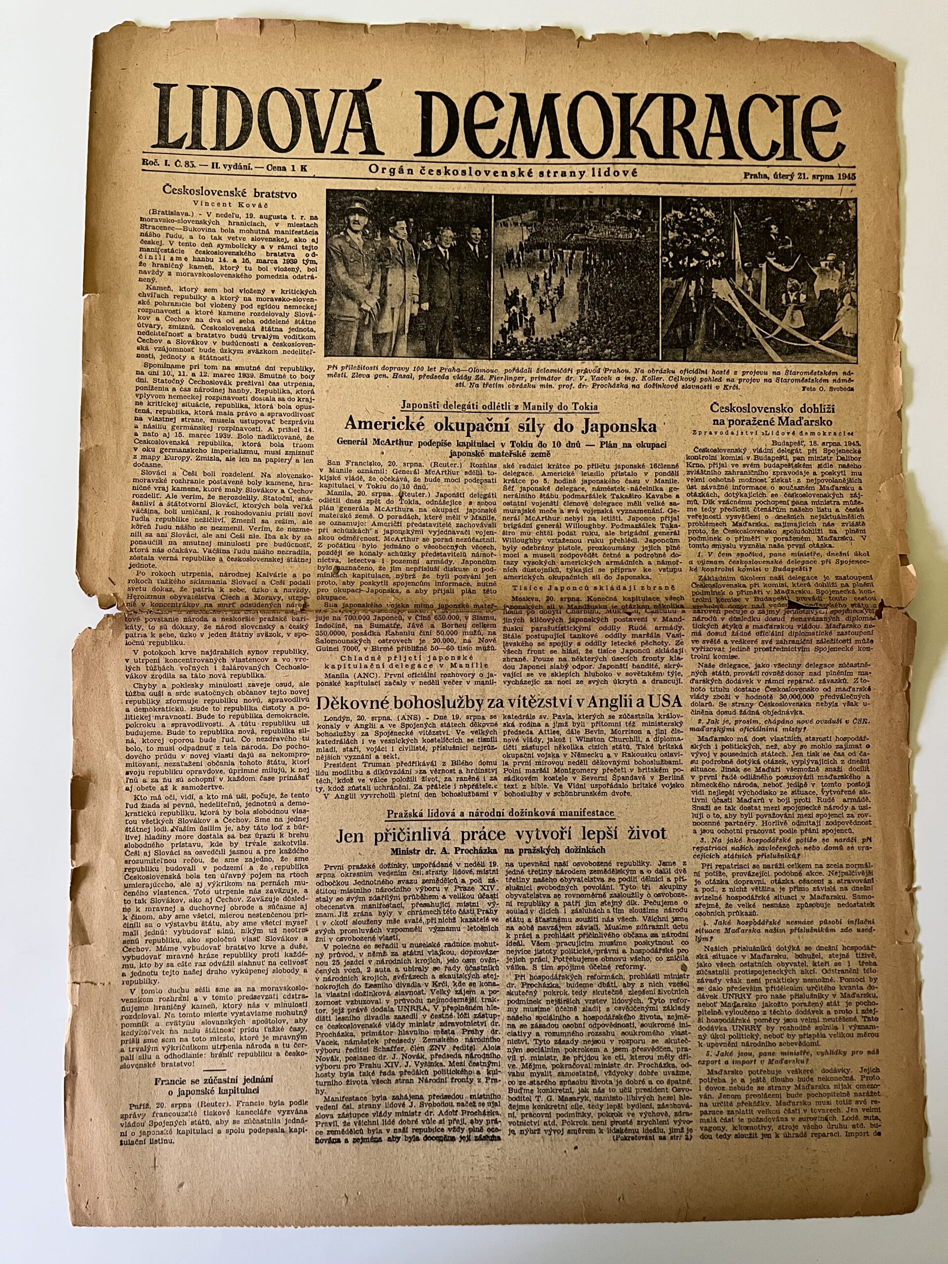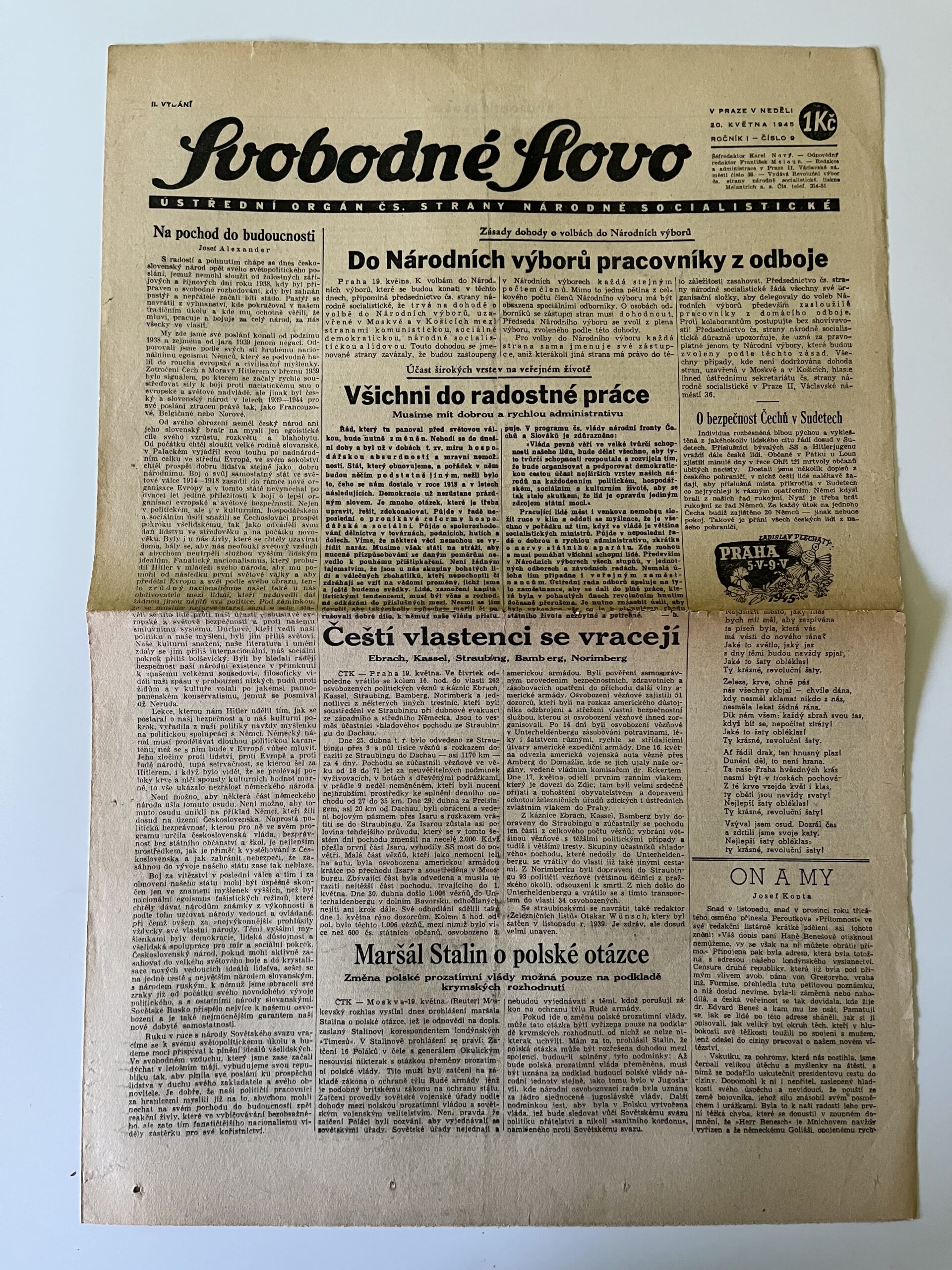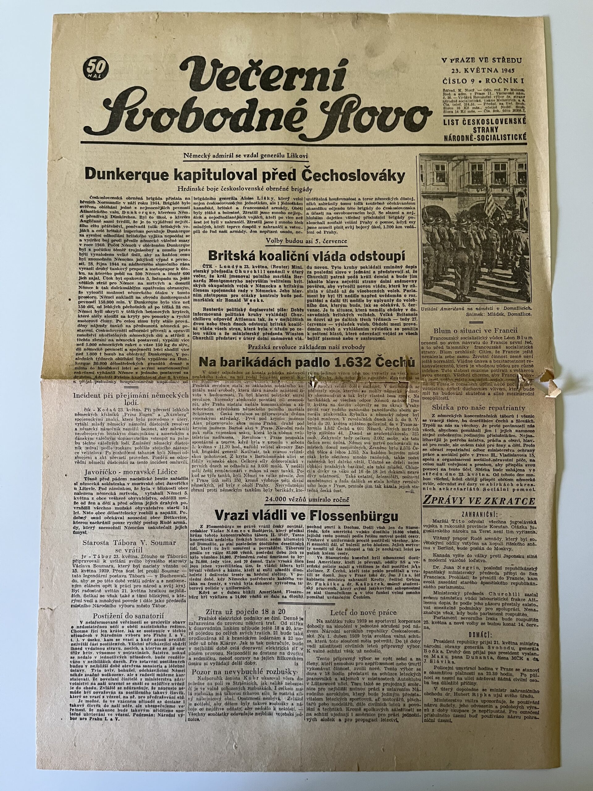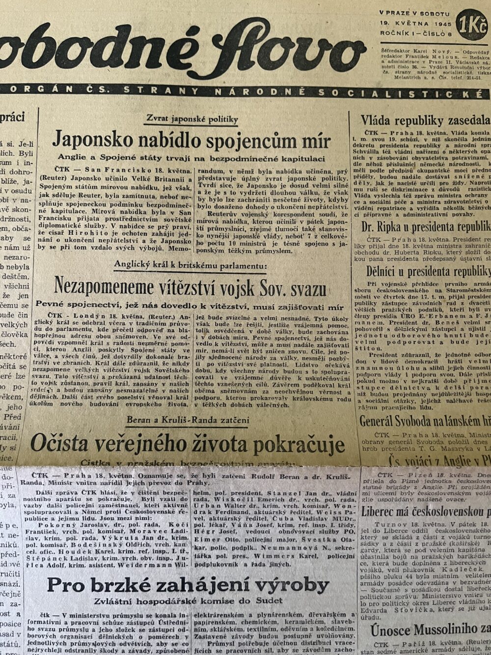 8 (K3-3) Svobodné Slovo,Zdar,Lidová demokracie. Rozměr jedné strany 32 x 47 cm. Celek novin obsahuje 5 x Svobodné Slovo 14.srpna 1945 – Vracejí se nejhrdinnější synové po šesti letech doma…aj., 4 strany. Svobodné Slovo 20.května 1945 – Do Národních výborů pracovníky z odboje. Všichni do radostné práce. Čeští vlastenci se vracejí…aj., 4 strany. Svobodné Slovo 19.května 1945 – Očista veřejného života pokračuje. Podniky musí sloužit národu…aj. 4 strany. Svobodné Slovo 19.srpna 1945 – Pracovní povinnost pro všechny. Český národ Rudé armádě…aj., 4 strany. Svobodné Slovo 22.srpna 1945 – Vrátili se jako vítězové. Okupace Japonska započne v neděli…aj., 4 strany. Večerní Svobodné Slovo 23.května 1945 – Na barikádách padlo 1632 Čechů…aj. 1 list. Lidová demokracie 21.srpna 1945 – Americké okupační síly do Japonska. Československé bratrstvo…aj. 4 strany. Svobodné noviny 28.června 1945 – Charta světové bezpečnosti podepsána. Všeslovanský den na Děvíně…aj. 4 strany. Zdar Zlín 25. a 26. září 1945 – Maršál Montgomery navštívil Československo. Baťova nemocnice zveřejněna…aj. 4 strany. Některé noviny jsou v přehybu poškozeny.